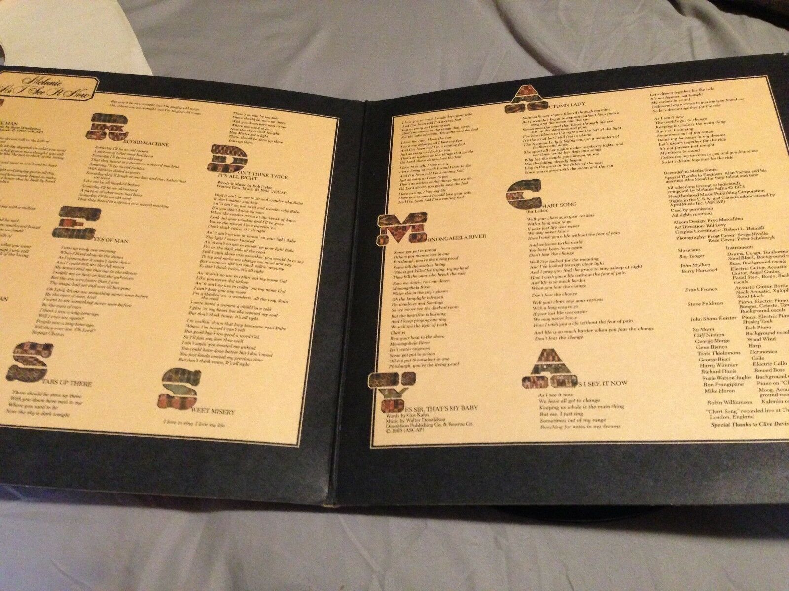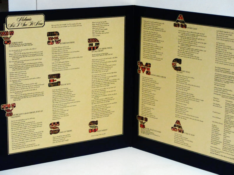 As I See It Now was released in 1974 on Melanie’s own Neighborhood Records. Design by Fred Marcellino, with art direction by Bill Levy and photography by Serge Nivelle. Robert L. Heimall is credited for coordinating the graphics.