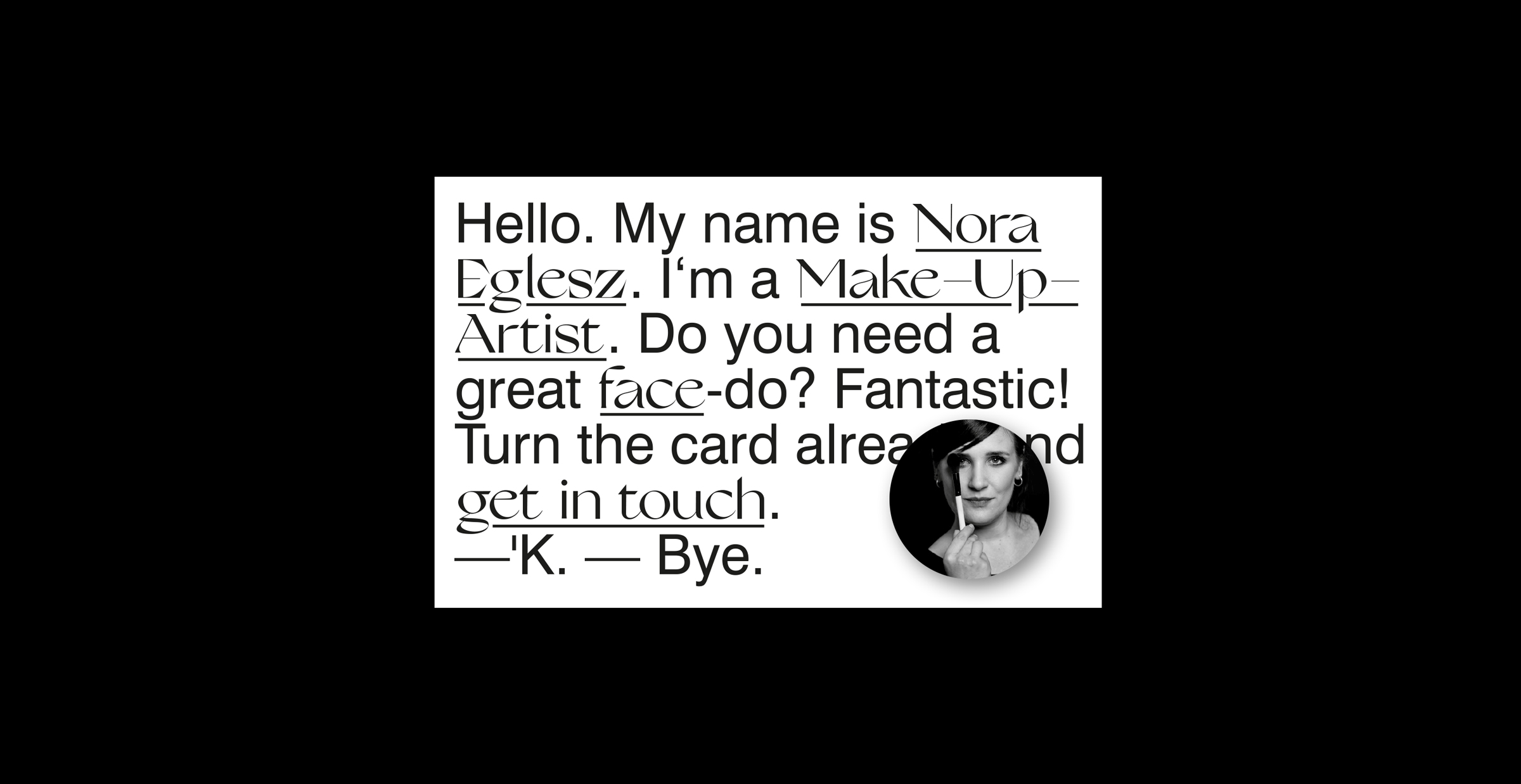 KR8 Bureau in Vienna conveyed her visual identity through a strong typographic system, reflecting her snazzy and fun, unconventional personality. The counter weighting fonts Grand Slang and Swiss 721 build an expressive and memorable appearance, showing that pure, straight typographic branding can succeed without a traditional logo.