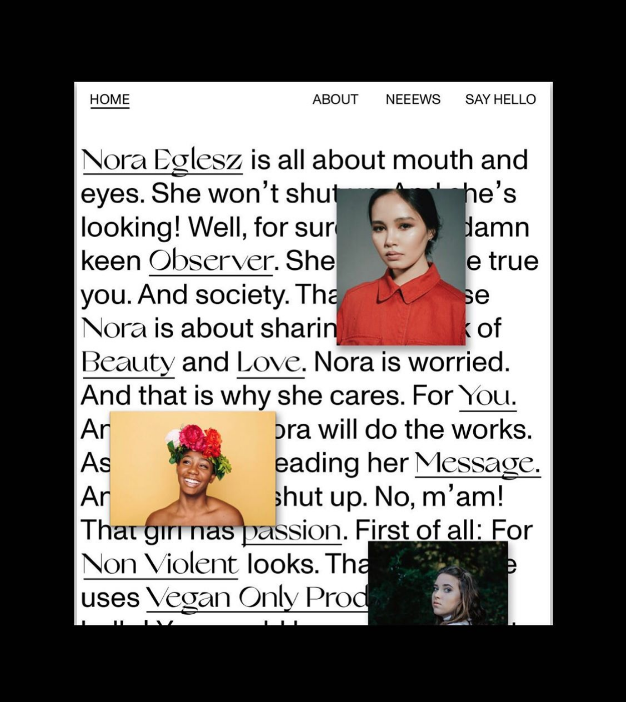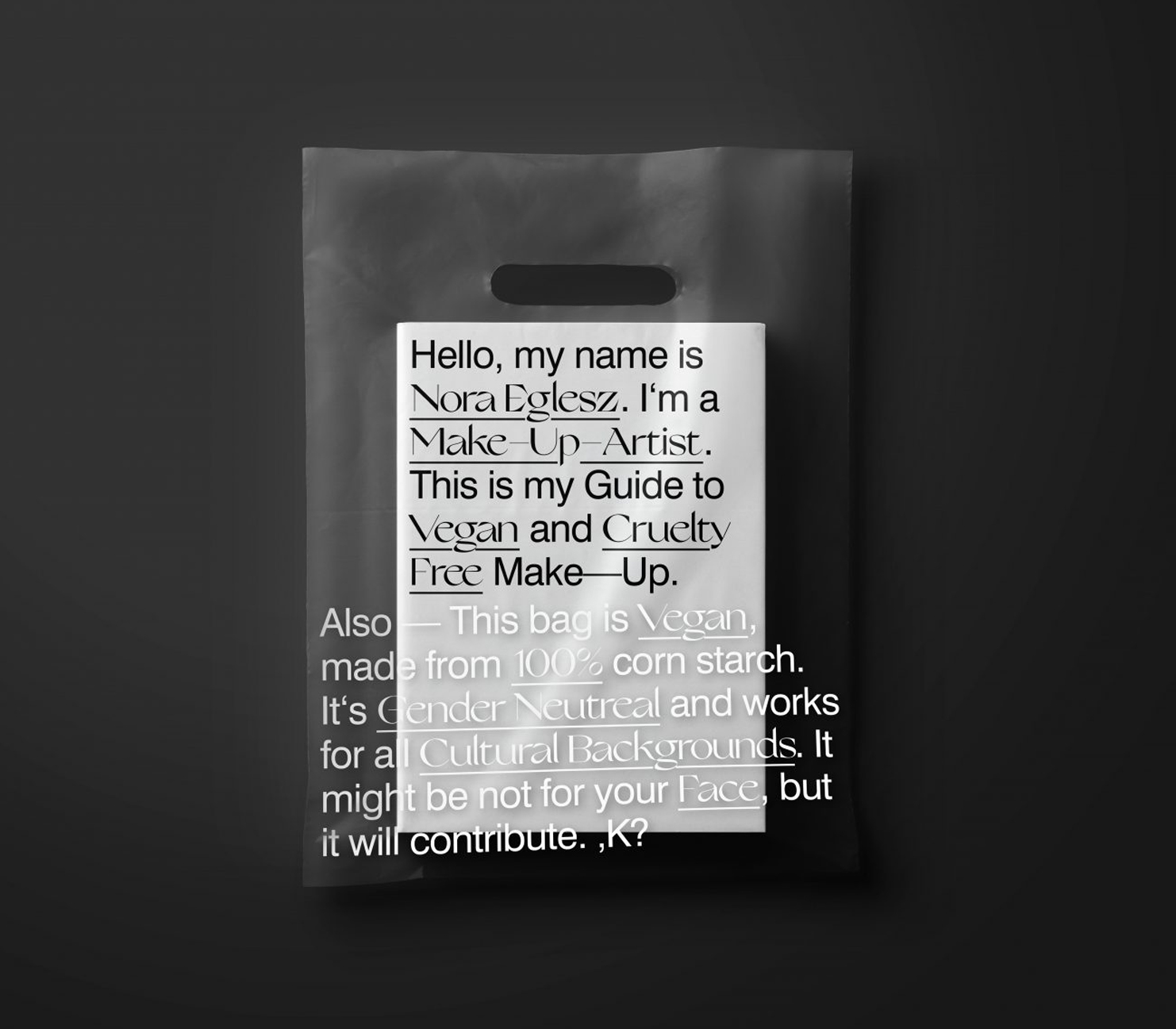 Nora Eglesz is a make-up artist working in film, fashion and photography. Her practice is following an ethical approach using her influence and reputation in the Industry of becoming an ambassador for non-cruel and vegan make-up.
