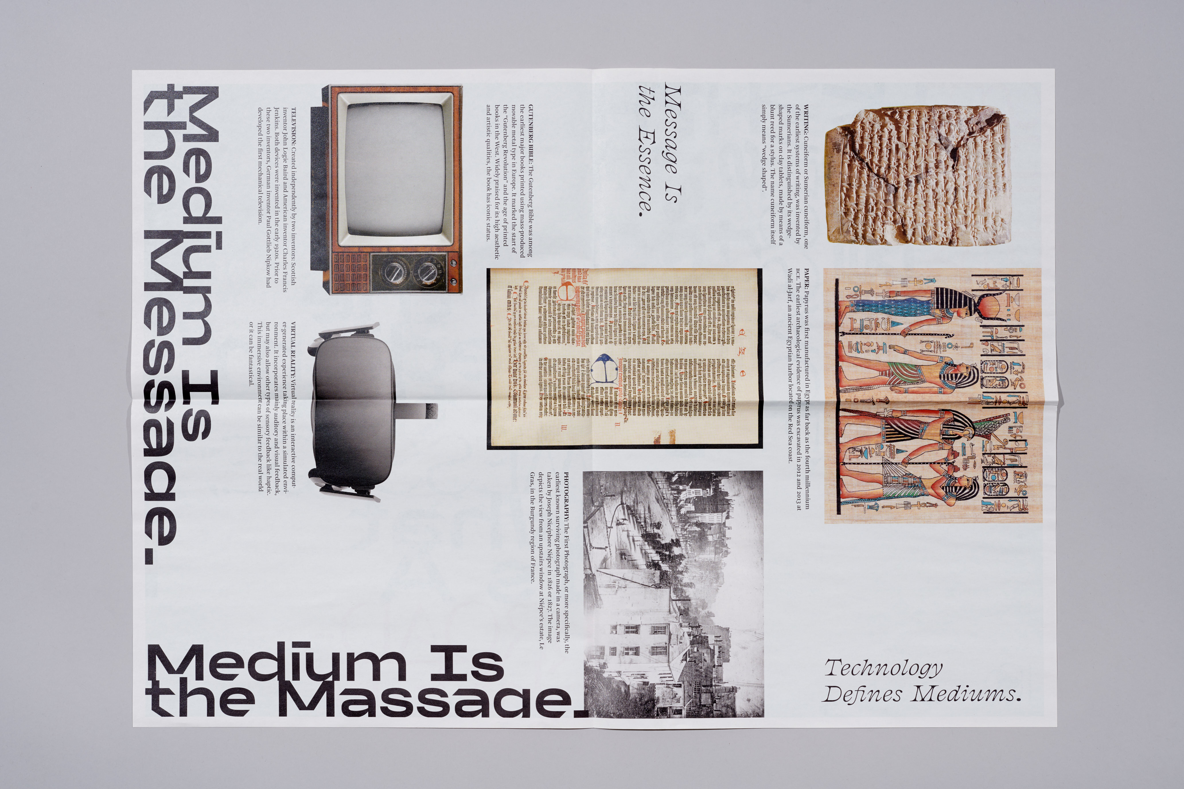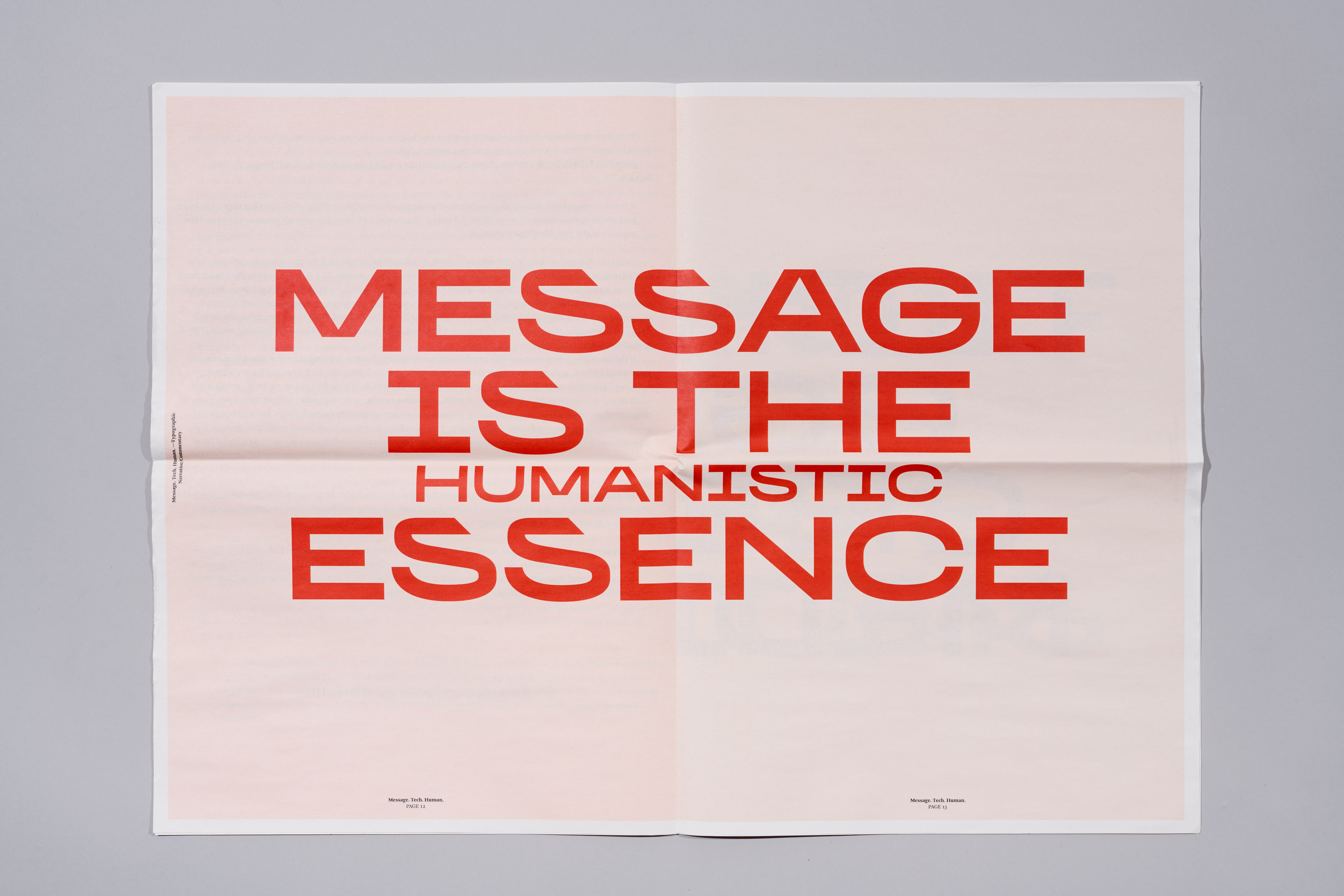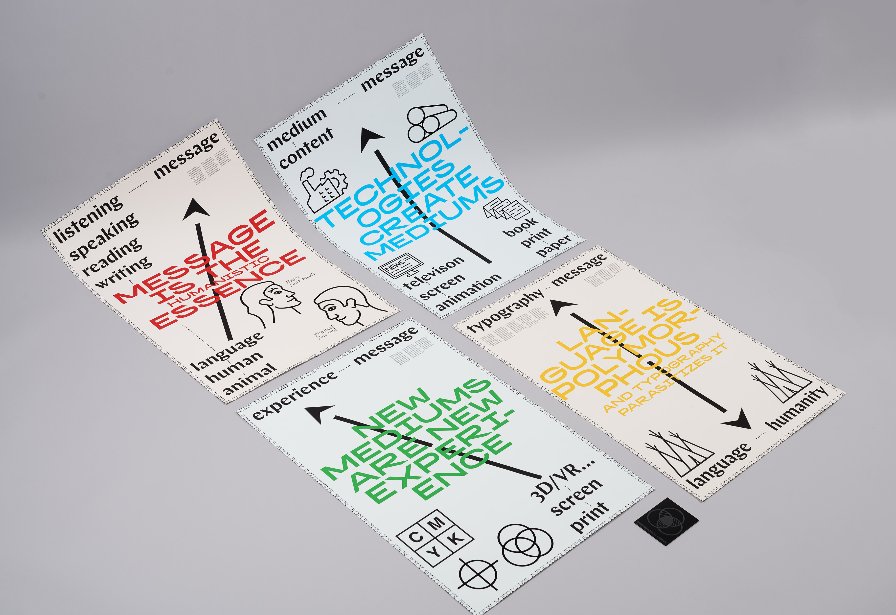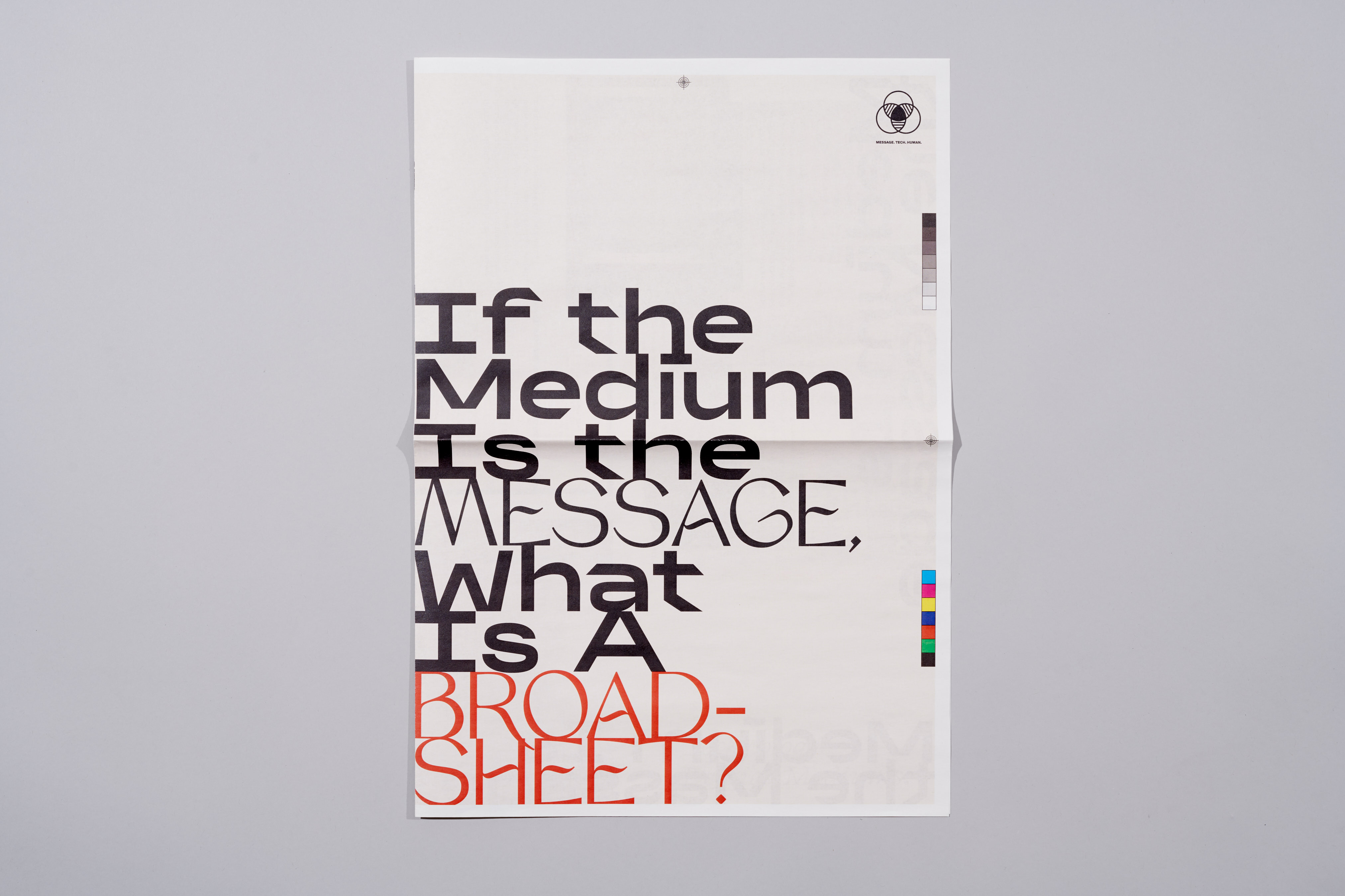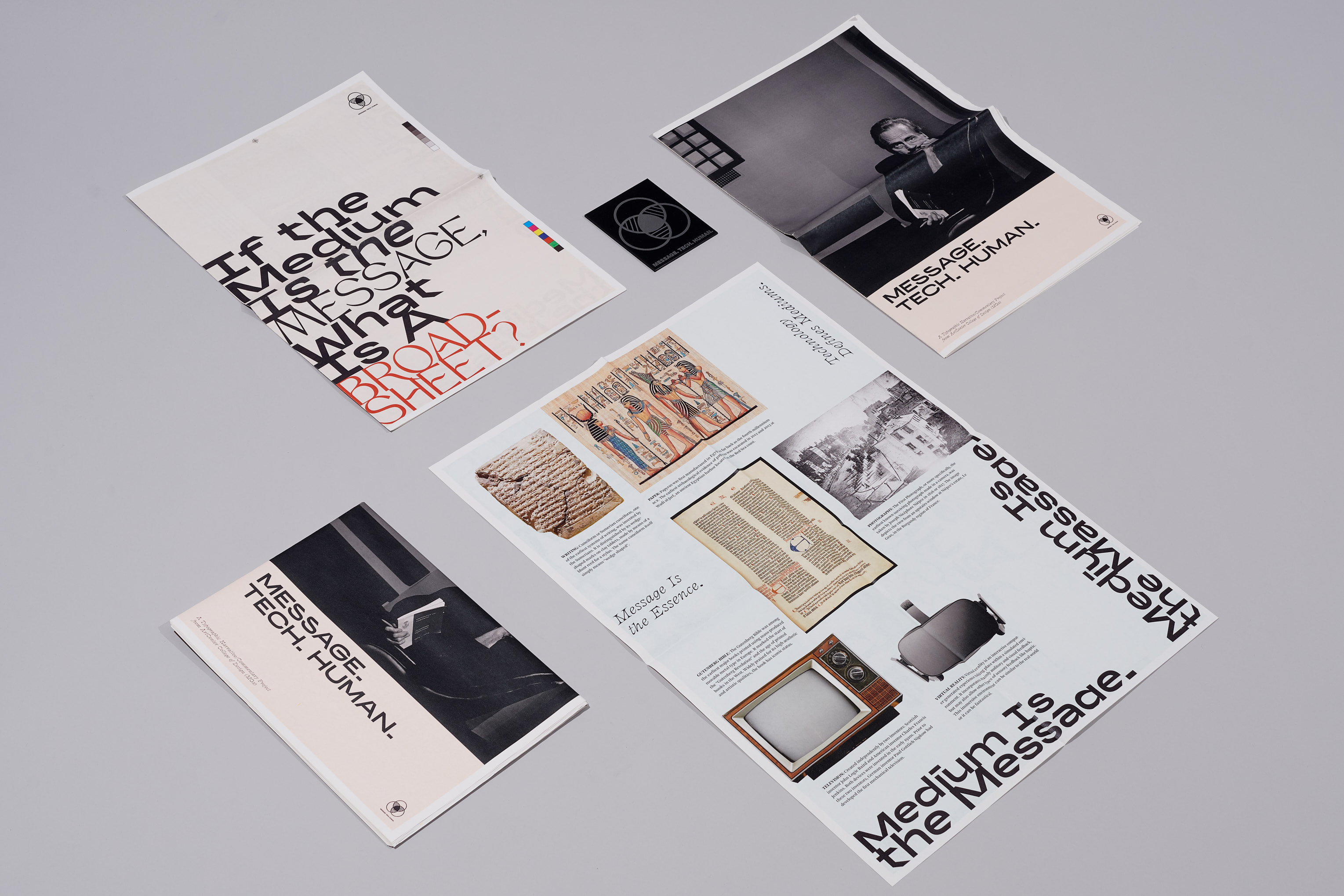 Message. Tech. Human intends to execute and critique on McLuhan’s theories, “The medium Is the message”. It is using posters, broadsheets, and motion graphics as “mediums” to question about whether the design and quantity of information would change the definition of “mediums”. Will the unconventional styles of design change the “poster” into an editorial spread? Can a broadsheet be a poster?…