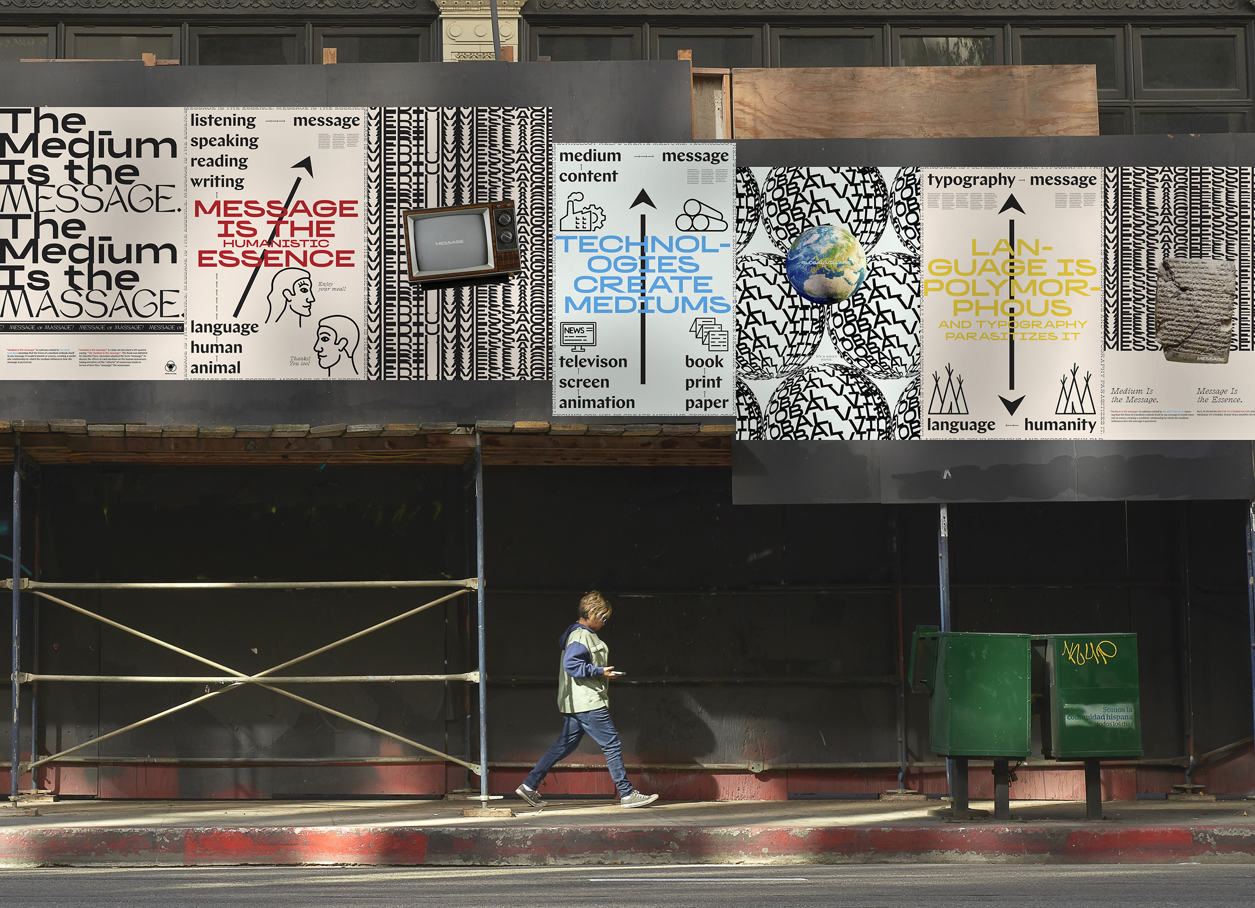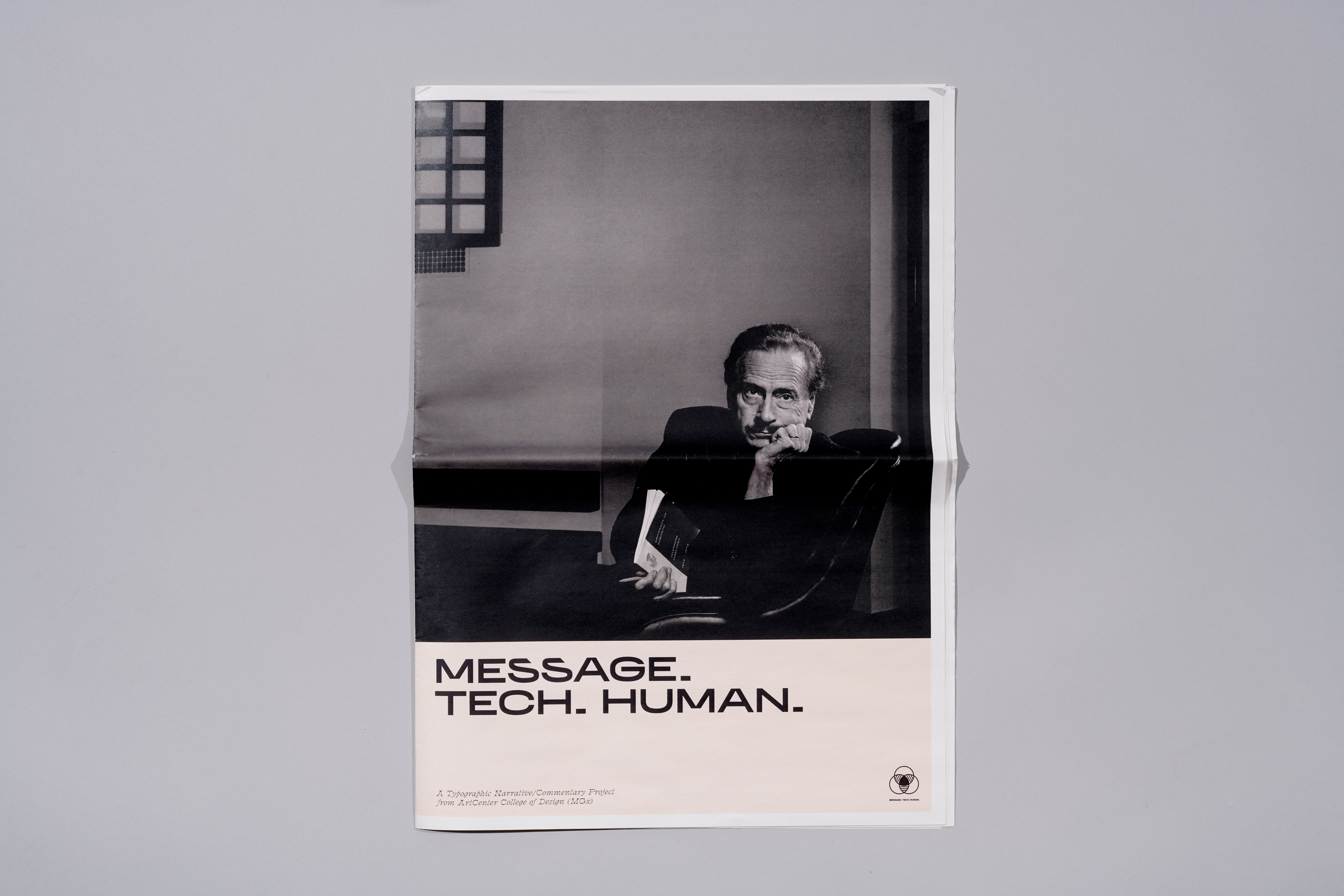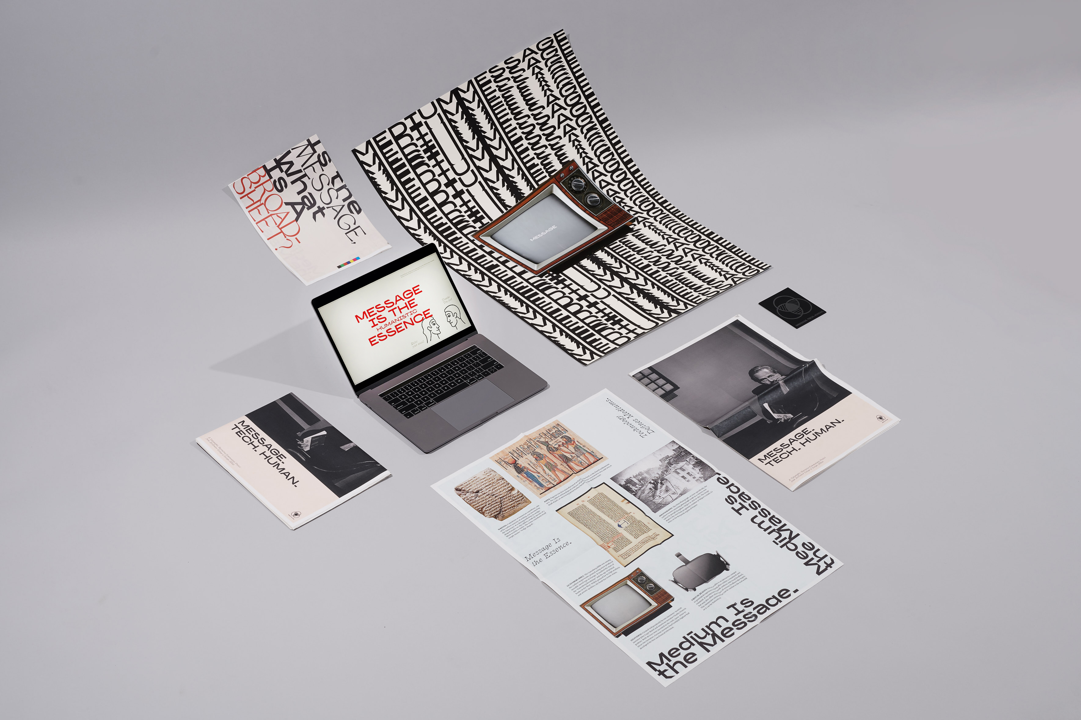 Message. Tech. Human is a typographical project made at ArtCenter College of Design. It uses posters, motion, and collaterals to execute the core methodology from either an artist, a musician, a photographer, a philosopher, a theorist, a poet, or a critic. Marshall McLuhan is a personal choice for this specific project and his theories potentially allow the designer to embed his critique/comments on media and mediums.