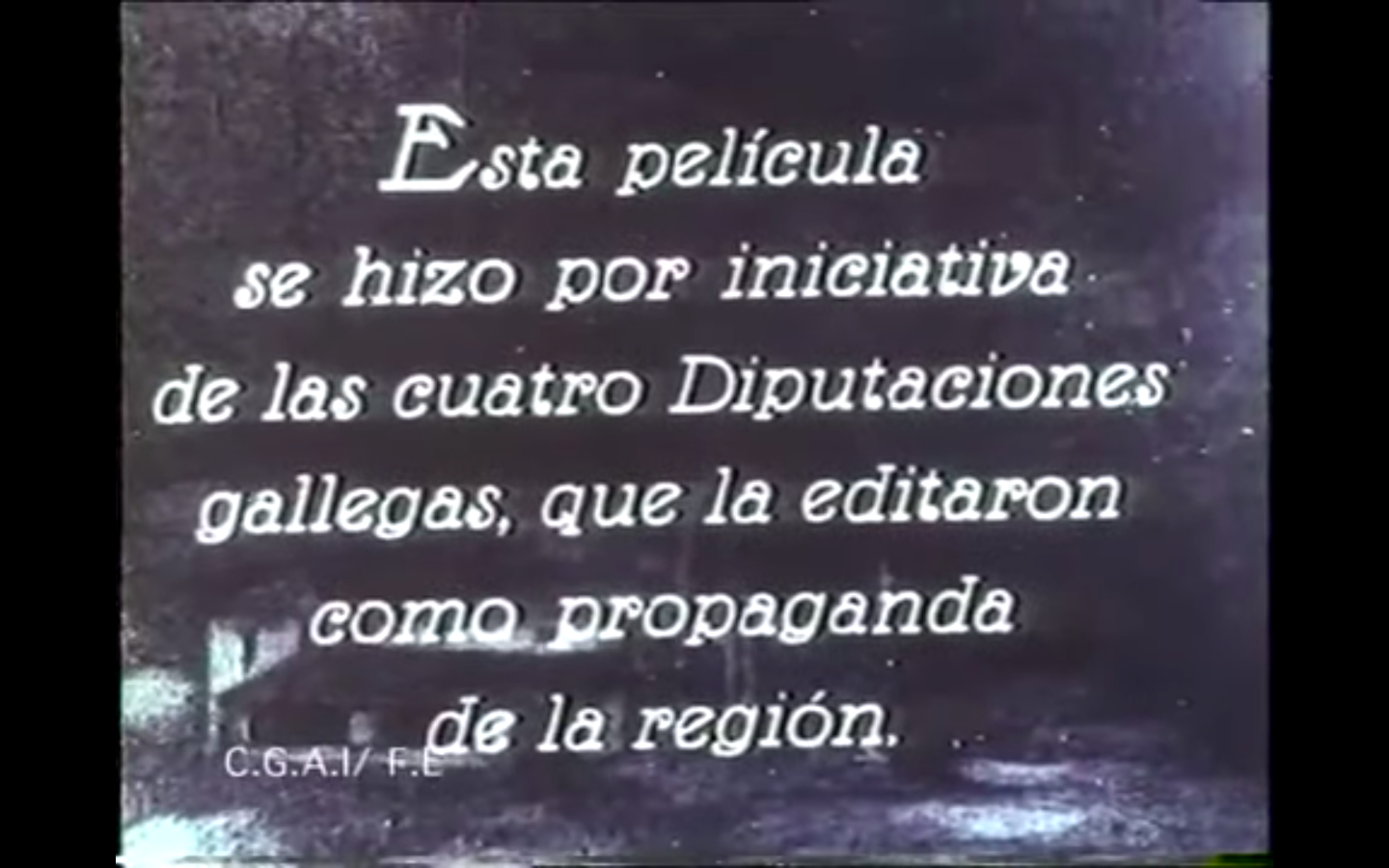 Un viaje por Galicia (“A trip through Galicia”) is a documentary produced for the Ibero-American Exposition of 1929. As the introductory card reads, “this film was made at the initiative of the four Galician Provincial Councils, which released it as propaganda for the region.” It was directed by Luis R. Alonso. A reconstruction made by Centro Galego de Artes da Imaxe/Filmoteca Española in 1991 is available online, with added music from Aires d’a Terra’s Perfecto Feijoo (1904), the first record from Galicia.