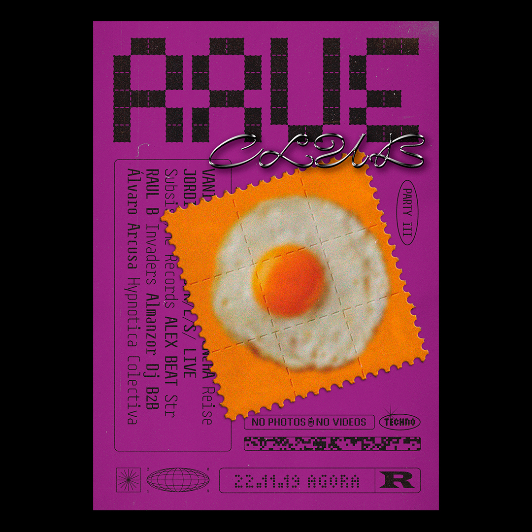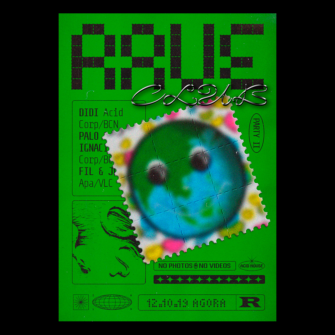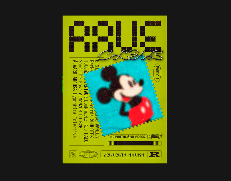 Rave Club is a series of rave parties at the Ágora Club in Valencia, Spain. The design is inspired by the musical culture of Acid House, Techno and Hardcore. Also the resource of the use of neons, glitches and digital fonts of the 1990s. The “RAVE” logo refers to 1970s acid (perforated pieces of paper that were soaked in LSD), creating lettershapes by tearing off stamps.