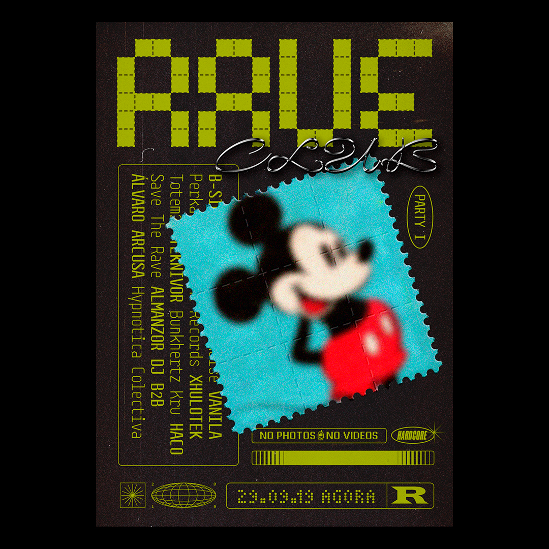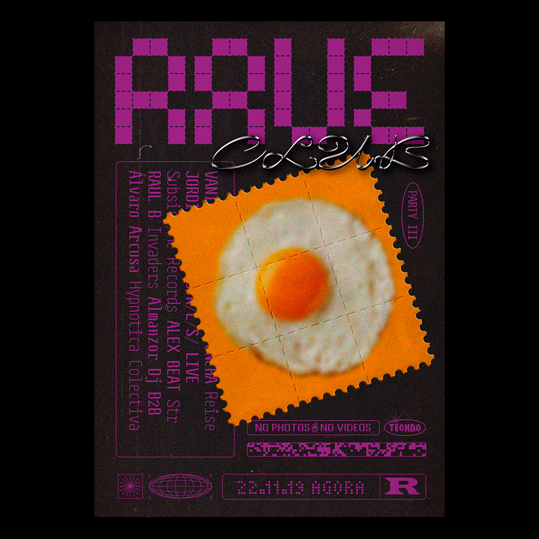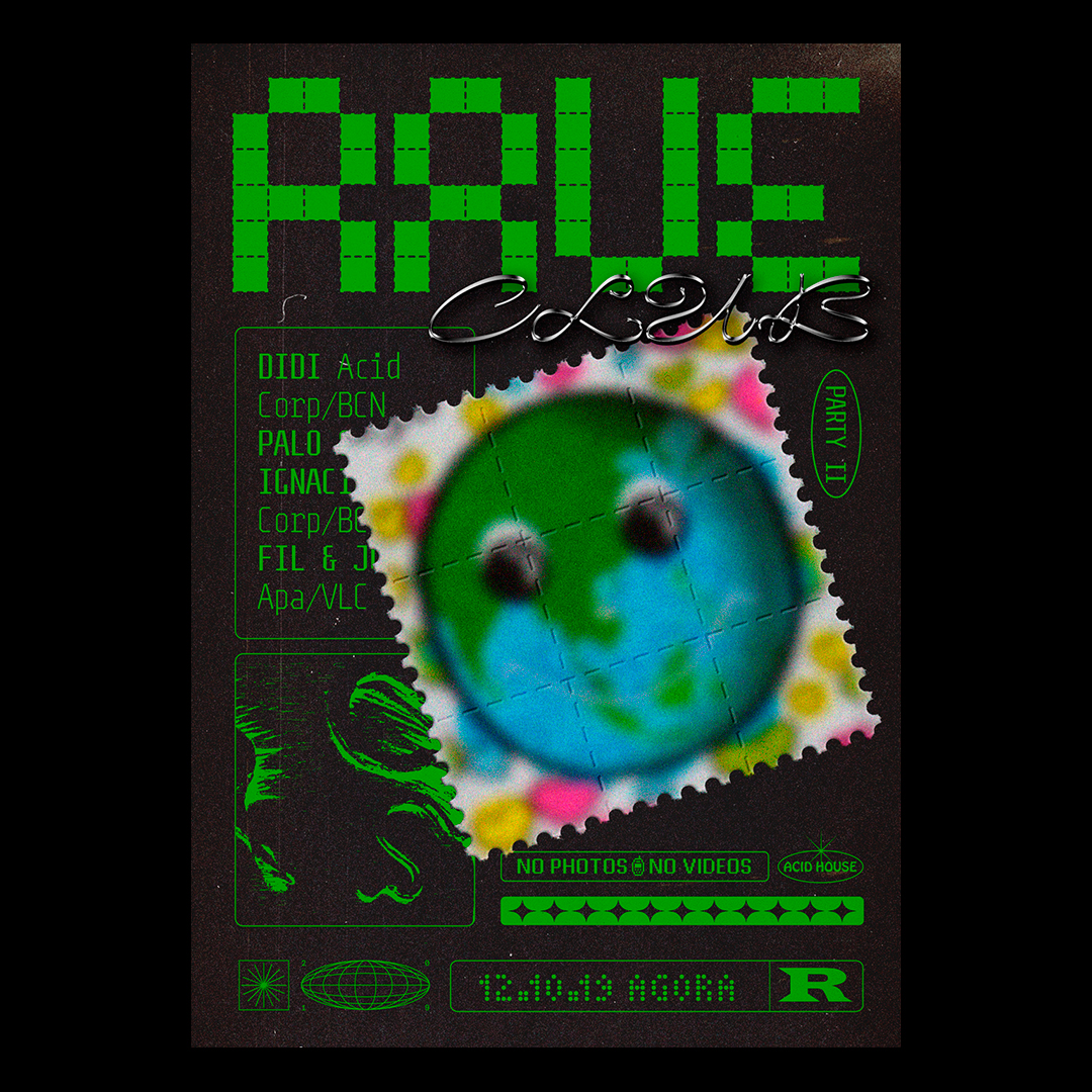 Rave Club is a series of rave parties at the Ágora Club in Valencia, Spain. The design is inspired by the musical culture of Acid House, Techno and Hardcore. Also the resource of the use of neons, glitches and digital fonts of the 1990s. The “RAVE” logo refers to 1970s acid (perforated pieces of paper that were soaked in LSD), creating lettershapes by tearing off stamps.