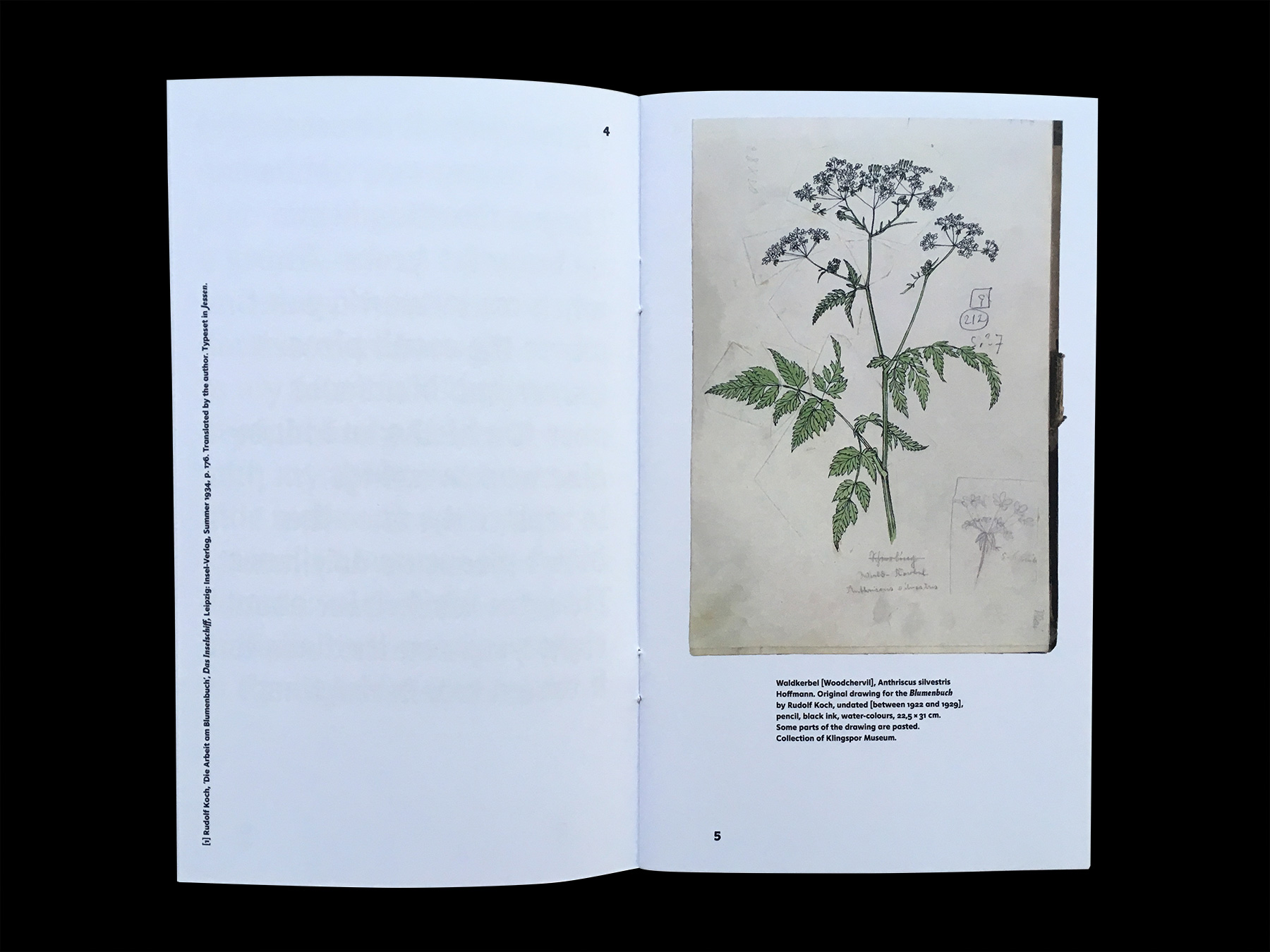 Designed by the author and typeset in Instant, Almost (unreleased italic), and Jessen “Cicero”, the 12pt version Koch cut for the Blumenbuch. Digital revival by Alexis Faudot & Rafael Ribas, after a workshop at ESAD •Valence in 2016 (freely available from ANRT’s GitHub).