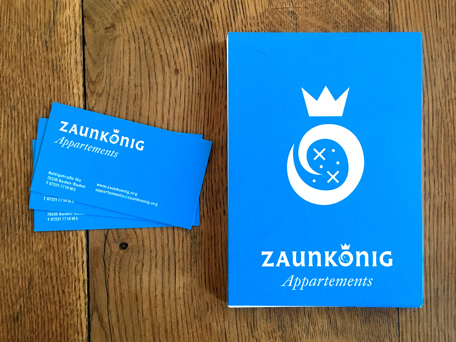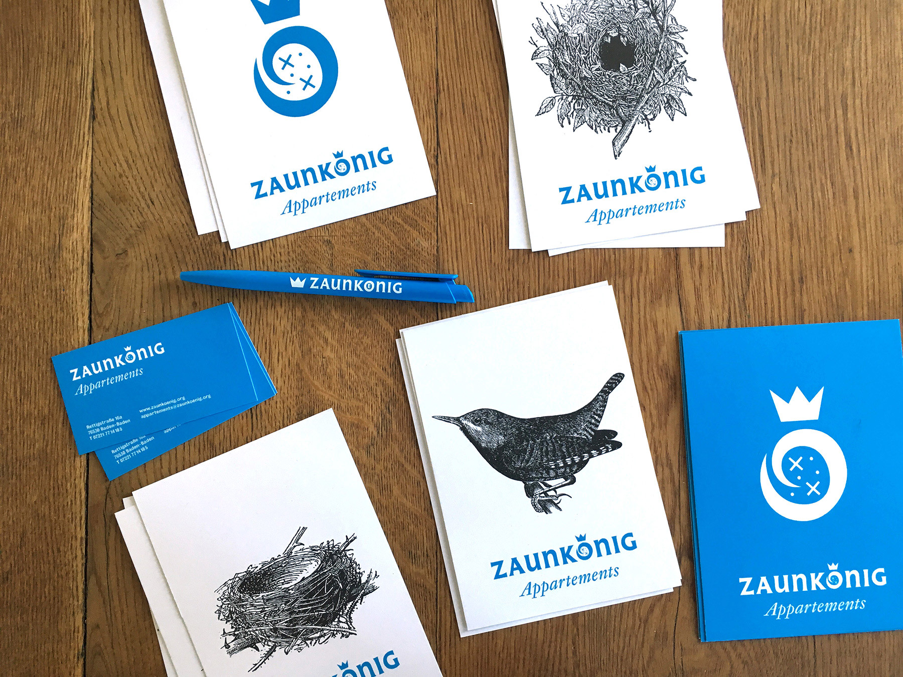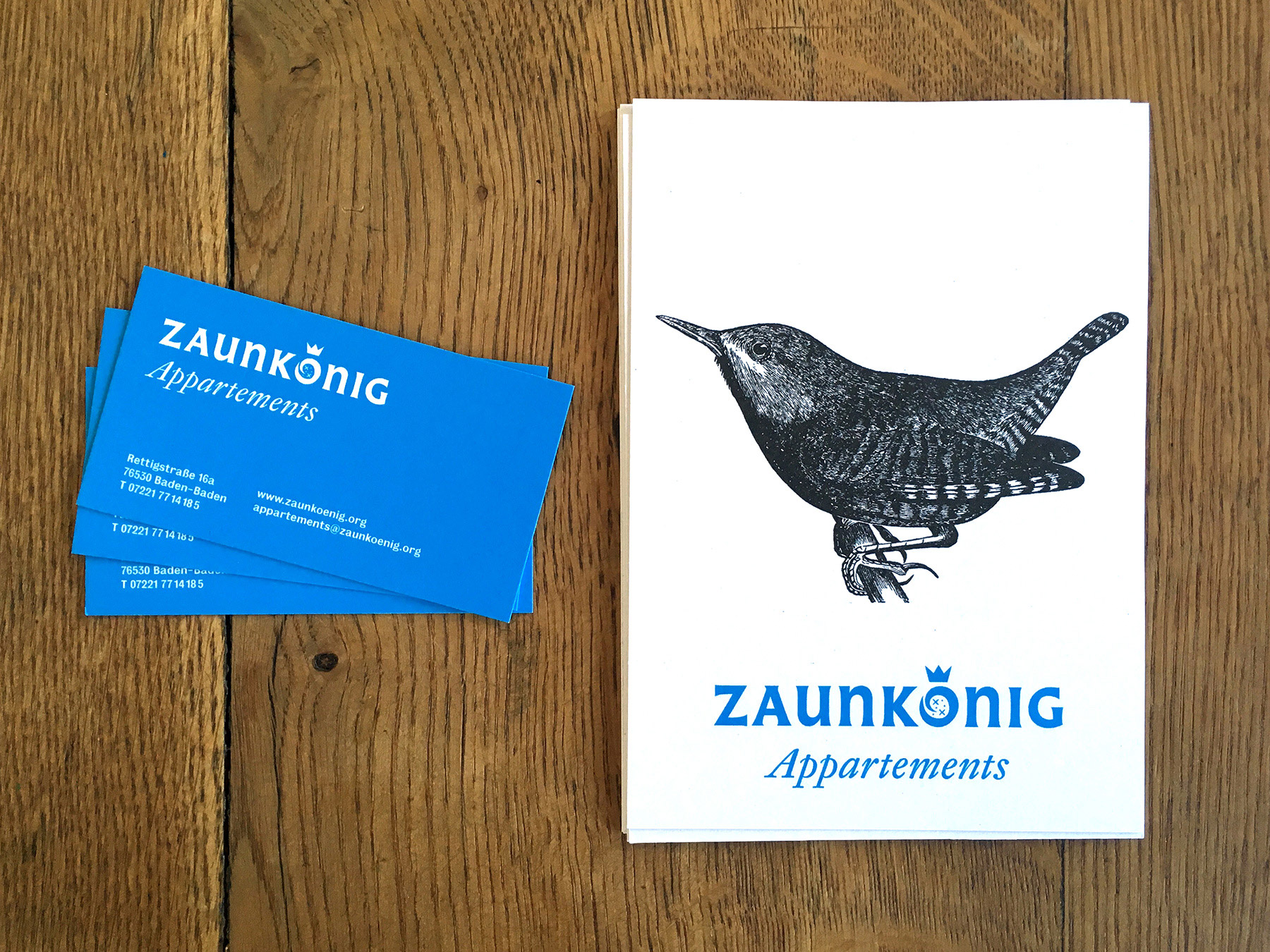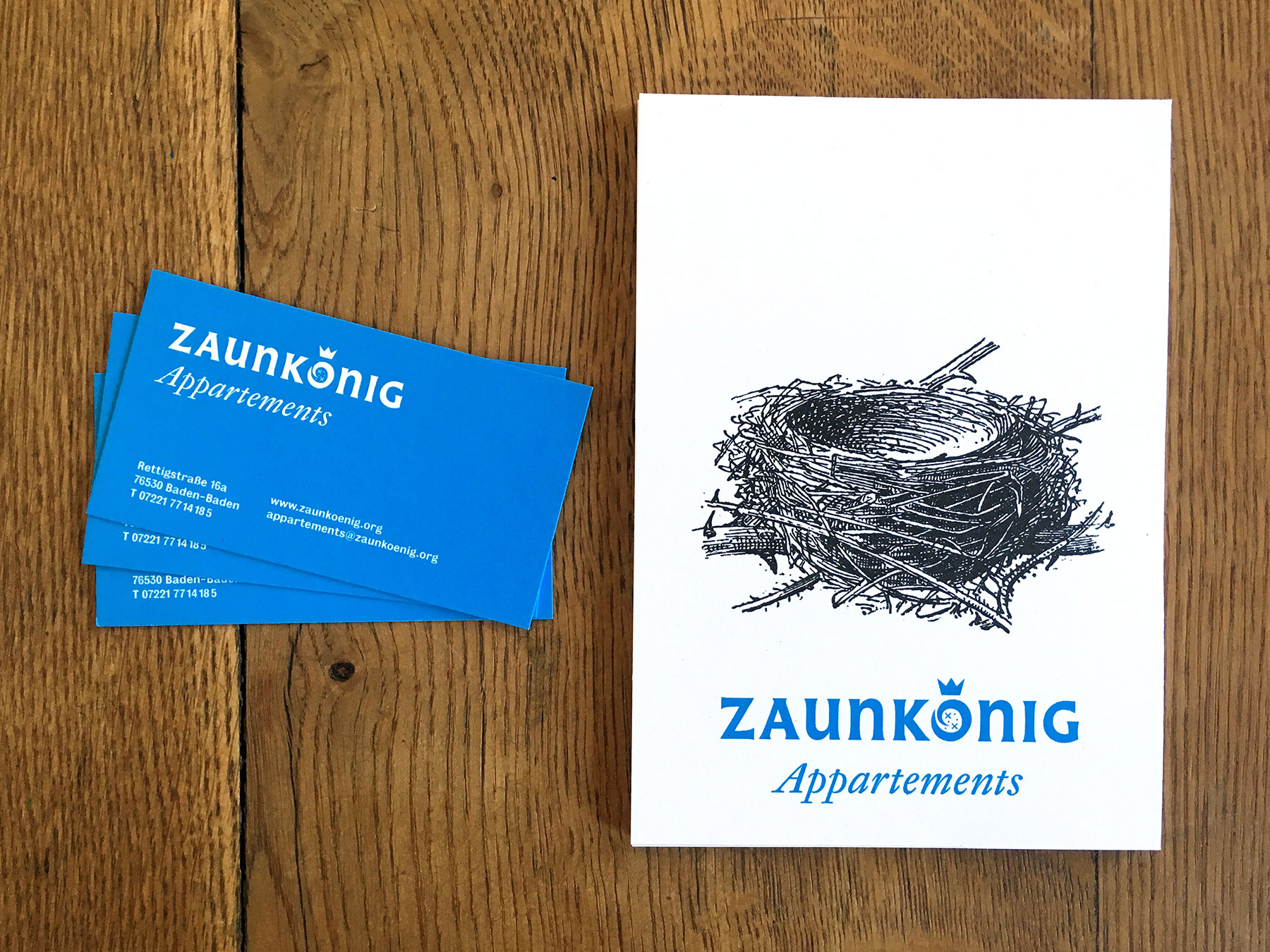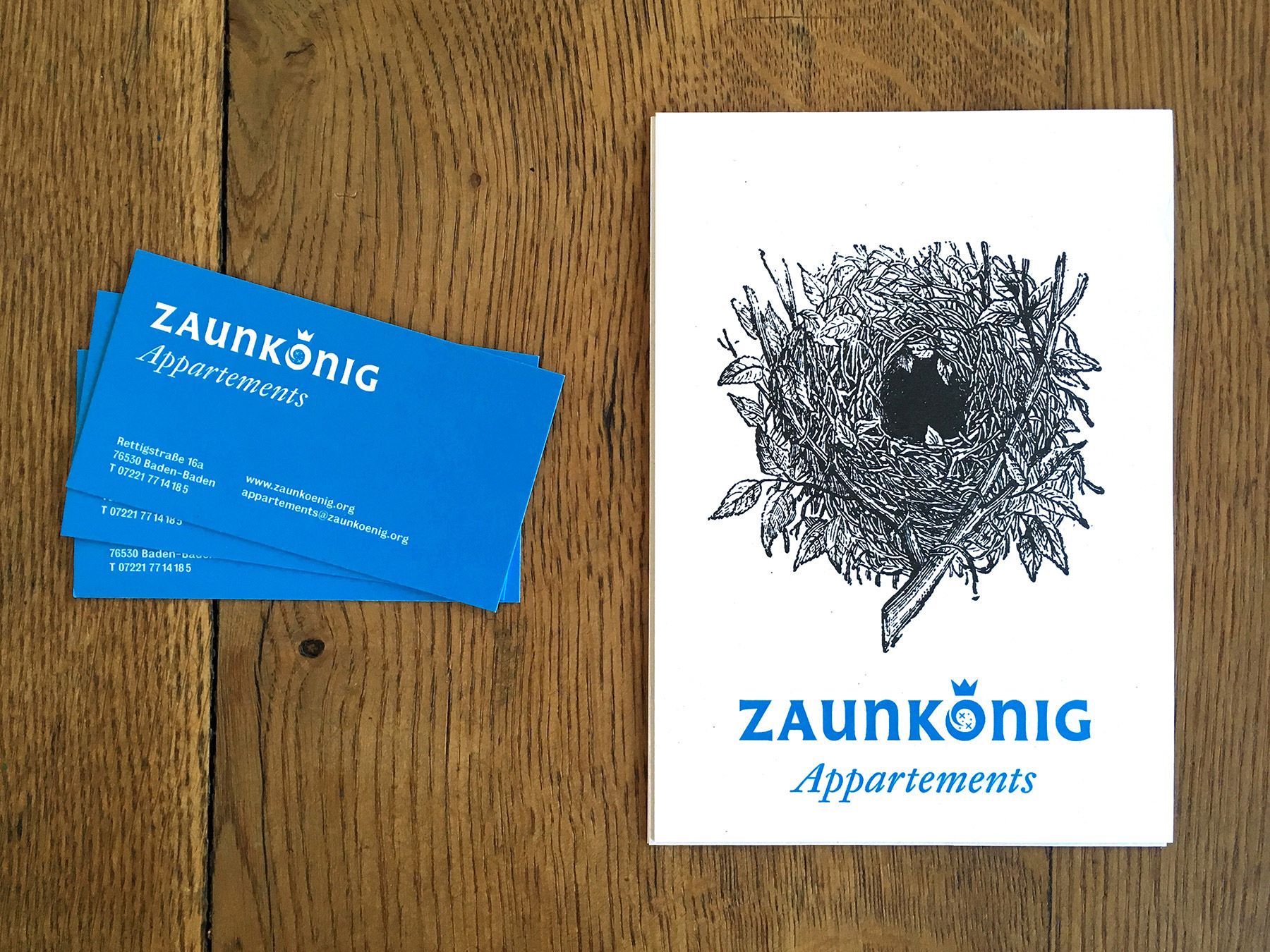 Visual identity for Zaunkönig Appartements in Baden-Baden using Almost Roman as main typeface. The capital N is taken from Almost Gothic, and the O from the Almost initials series, illustrating the bird’s nest (a “Zaunkönig” is a bird wren). “Appartements” is typeset in DTL Fleischmann Italic, the smalll texts are in Bureau Grot.