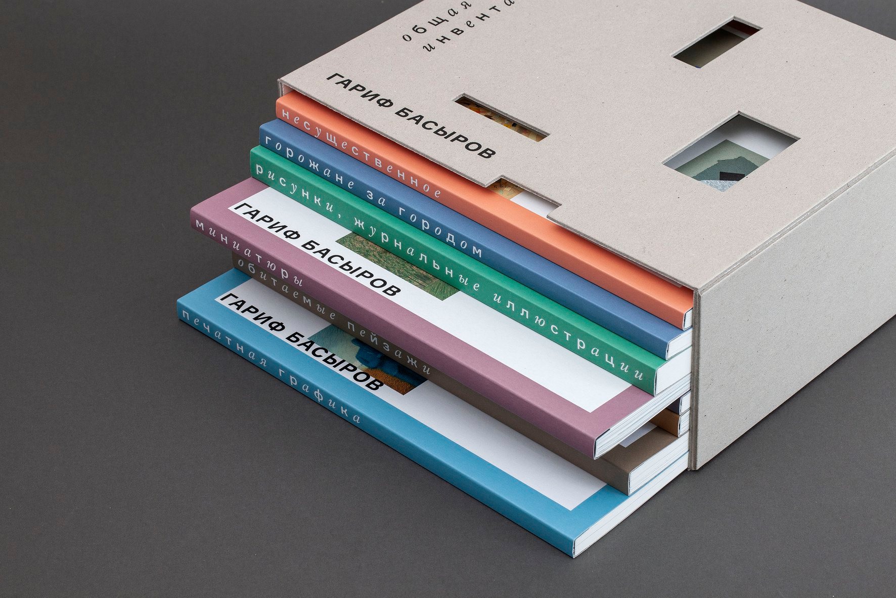 Garif Basyrov. Total Inventory consists of eight volumes in a cardboard slipcase. Seven of the books are dedicated to individual series or cycles of works. A separate biographical volume includes photographs and materials from the family archive that give the most complete picture of the artist’s life. The monograph is published by Mardjani.