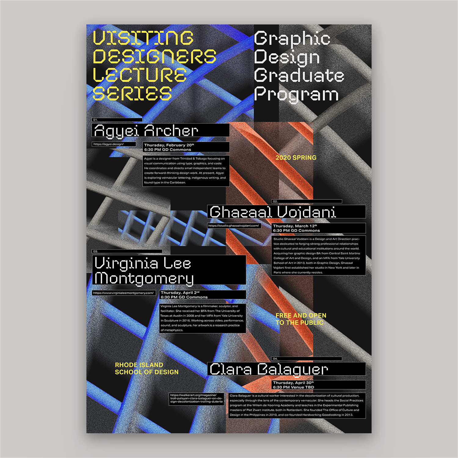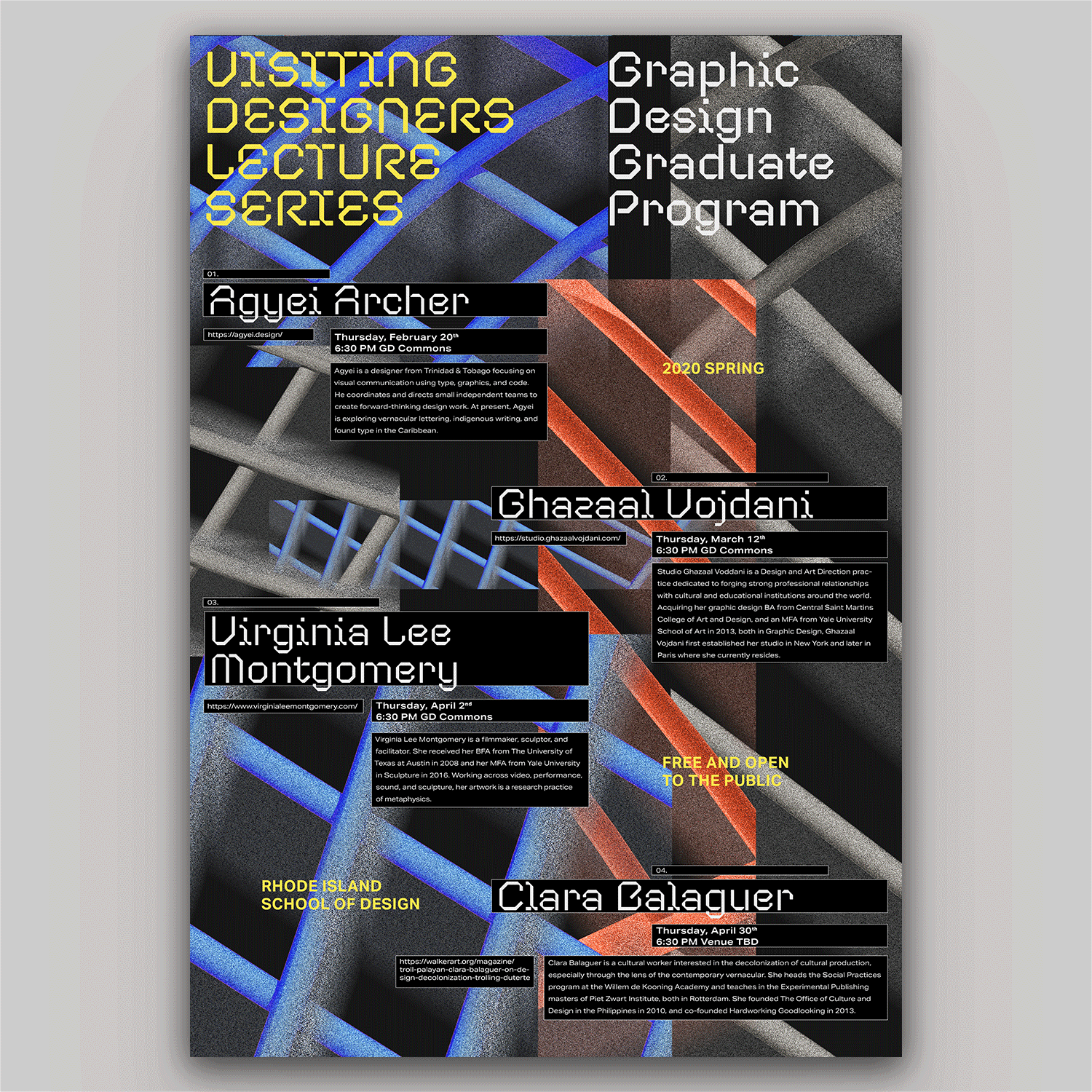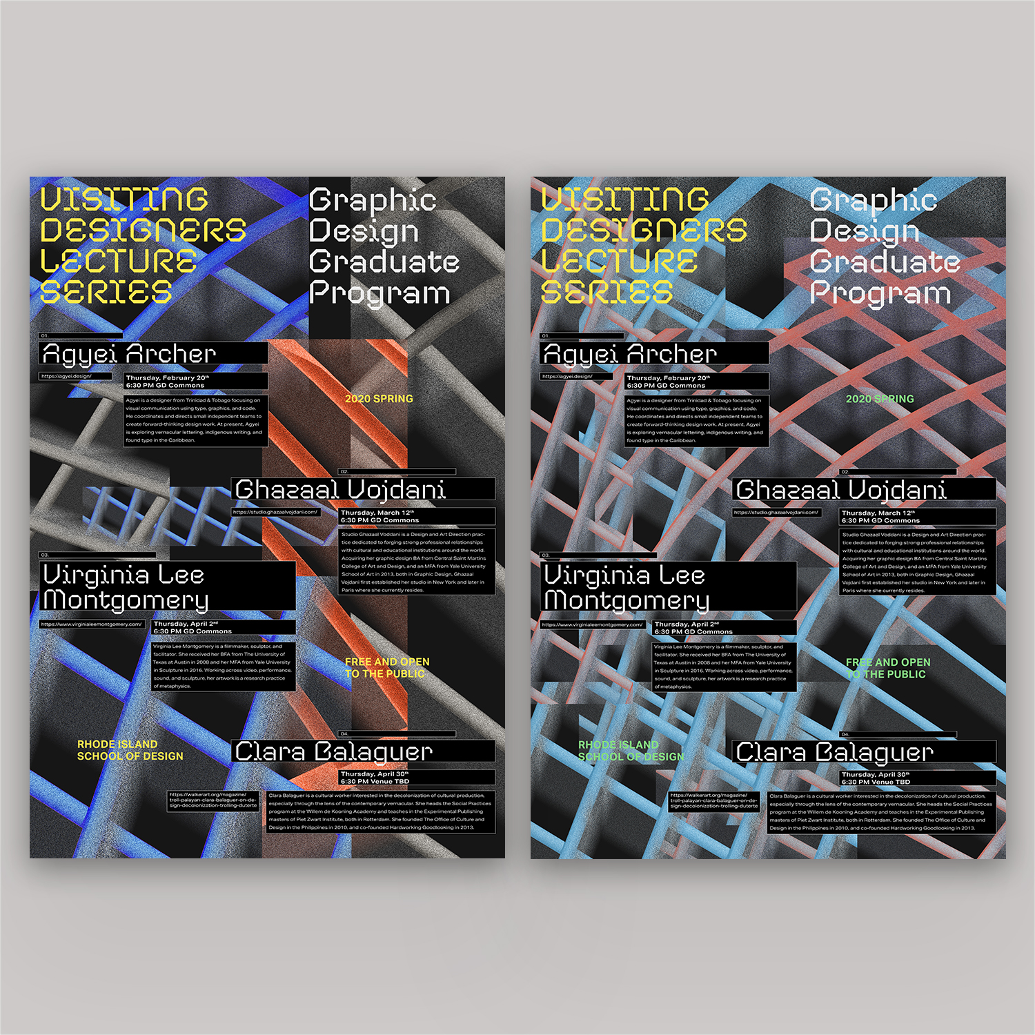 RISD Visiting Designers 2020 Contributed by Mukul Chakravarthi on Feb 27th, 2020. Artwork published in February 2020. Photo: Mukul Chakravarthi. License: All Rights Reserved. Posters for the Visiting Designers Lecture Series in the Graphic Design Graduate Program at Rhode Island School of Design (RISD). Photo: Mukul Chakravarthi. License: All Rights Reserved. Photo: Mukul Chakravarthi. License: All Rights Reserved. Photo: Mukul Chakravarthi. License: All Rights Reserved. Photo: Mukul Chakravarthi. License: All Rights Reserved. Photo: Mukul Chakravarthi. License: All Rights Reserved. Typefaces More about CoandaGet CoandaMore about Aktiv GroteskGet Aktiv Grotesk Formats Posters/Flyers (5869) Topics Event (3286) Graphic Design (3041) Designers/Agencies Mukul Chakravarthi (1) Tagged withposters (1444)RISD (26)lectures/talks (151)type in a box (722)reversed type (3459)student works (786) Artwork location United States (10059) Rhode Island (30) In Sets"TECH" (Giraffe Simons) (6)CoType Foundry (Mark Bloom) (5)LM (Amy Chen) (66) Post a comment Name Email – will not be published Website Your response Submit Comment More Aktiv Grotesk in use 2023 Title Match: Dongi Lee vs. Sangwoo Kang2023Ordinary PeopleContributed by Nguyen Gobber StartUp podcast logo and website2014AthleticsContributed by Stephen Coles Gilly Flowers2021Present StudioContributed by Present Studio Sponsor More in Graphic Design Konfrontace exhibition poster and catalogc. 2010Jan HavelBelavenir Design StudioContributed by Stephen Coles Staff Pick Readymag Newsletter2013Anton HerasymenkoReadymagContributed by Webtype Staff Pick Disc Color 19782020Roberlan ParesquiContributed by Matthijs Herzberg Fruit Exhibition logo2012CRUDOAndrea CavallottiContributed by Stephen Coles More in Posters/Flyers Mental – das Kunstfestival zu Schizophrenie poster2022Lara GressnerContributed by Giulia Boggio Predator movie poster1987unknownContributed by Jayce Wheeled Mercury Rev at Pappy and Harriet’s concert poster2025Andre PoiseContributed by Antoine Pazat “Mindset/Reset” poster2020Nikolaus SchmidtContributed by Nikolaus Schmidt More Fonts In Use Aesthetics of Sustainabilityc. 2021Federico BarbonContributed by Federico Barbon Staff Pick Centrefold Magazine, Issue 082012Contributed by Stephen Coles Staff Pick Contexta Collection: Secret2015Thom PfisterContributed by Gareth Hague Staff Pick Pitchfork Music Festival 20182018Jessica VisciusThe Normal StudioAlexa VisciusContributed by Johann Freitas Staff Pick