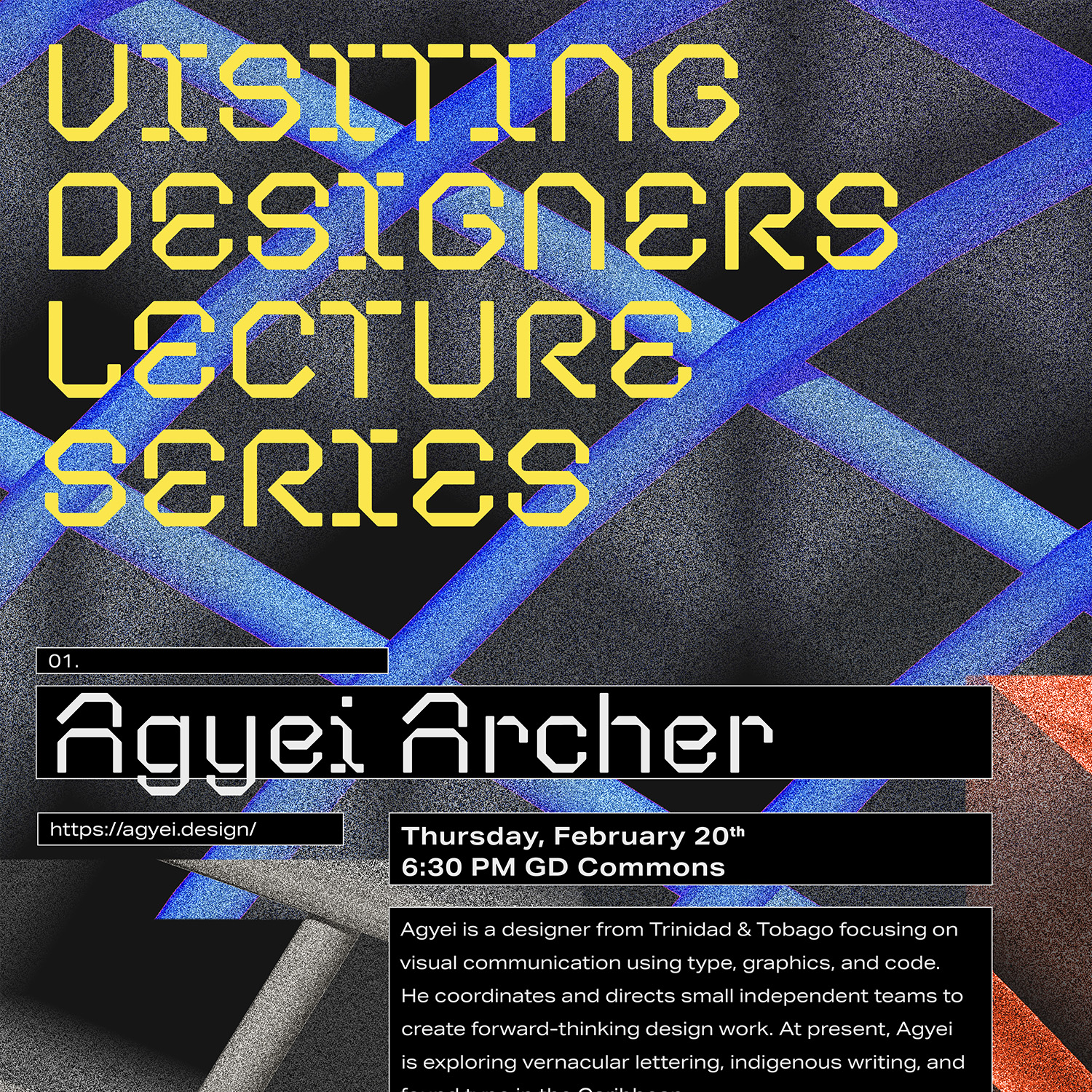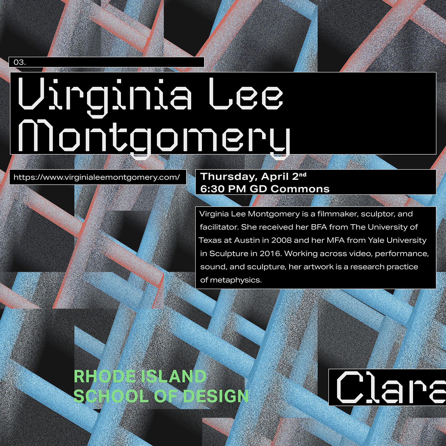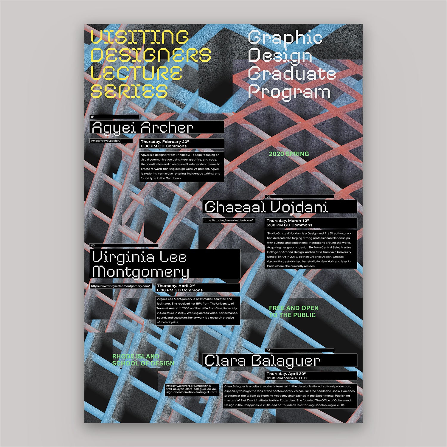 RISD Visiting Designers 2020 Contributed by Mukul Chakravarthi on Feb 27th, 2020. Artwork published in February 2020. Photo: Mukul Chakravarthi. License: All Rights Reserved. Posters for the Visiting Designers Lecture Series in the Graphic Design Graduate Program at Rhode Island School of Design (RISD). Photo: Mukul Chakravarthi. License: All Rights Reserved. Photo: Mukul Chakravarthi. License: All Rights Reserved. Photo: Mukul Chakravarthi. License: All Rights Reserved. Photo: Mukul Chakravarthi. License: All Rights Reserved. Photo: Mukul Chakravarthi. License: All Rights Reserved. Typefaces More about CoandaGet CoandaMore about Aktiv GroteskGet Aktiv Grotesk Formats Posters/Flyers (5869) Topics Event (3286) Graphic Design (3041) Designers/Agencies Mukul Chakravarthi (1) Tagged withposters (1444)RISD (26)lectures/talks (151)type in a box (722)reversed type (3459)student works (786) Artwork location United States (10059) Rhode Island (30) In Sets"TECH" (Giraffe Simons) (6)CoType Foundry (Mark Bloom) (5)LM (Amy Chen) (66) Post a comment Name Email – will not be published Website Your response Submit Comment More Aktiv Grotesk in use 2023 Title Match: Dongi Lee vs. Sangwoo Kang2023Ordinary PeopleContributed by Nguyen Gobber StartUp podcast logo and website2014AthleticsContributed by Stephen Coles Gilly Flowers2021Present StudioContributed by Present Studio Sponsor More in Graphic Design Konfrontace exhibition poster and catalogc. 2010Jan HavelBelavenir Design StudioContributed by Stephen Coles Staff Pick Readymag Newsletter2013Anton HerasymenkoReadymagContributed by Webtype Staff Pick Disc Color 19782020Roberlan ParesquiContributed by Matthijs Herzberg Fruit Exhibition logo2012CRUDOAndrea CavallottiContributed by Stephen Coles More in Posters/Flyers Mental – das Kunstfestival zu Schizophrenie poster2022Lara GressnerContributed by Giulia Boggio Predator movie poster1987unknownContributed by Jayce Wheeled Mercury Rev at Pappy and Harriet’s concert poster2025Andre PoiseContributed by Antoine Pazat “Mindset/Reset” poster2020Nikolaus SchmidtContributed by Nikolaus Schmidt More Fonts In Use Aesthetics of Sustainabilityc. 2021Federico BarbonContributed by Federico Barbon Staff Pick Centrefold Magazine, Issue 082012Contributed by Stephen Coles Staff Pick Contexta Collection: Secret2015Thom PfisterContributed by Gareth Hague Staff Pick Pitchfork Music Festival 20182018Jessica VisciusThe Normal StudioAlexa VisciusContributed by Johann Freitas Staff Pick