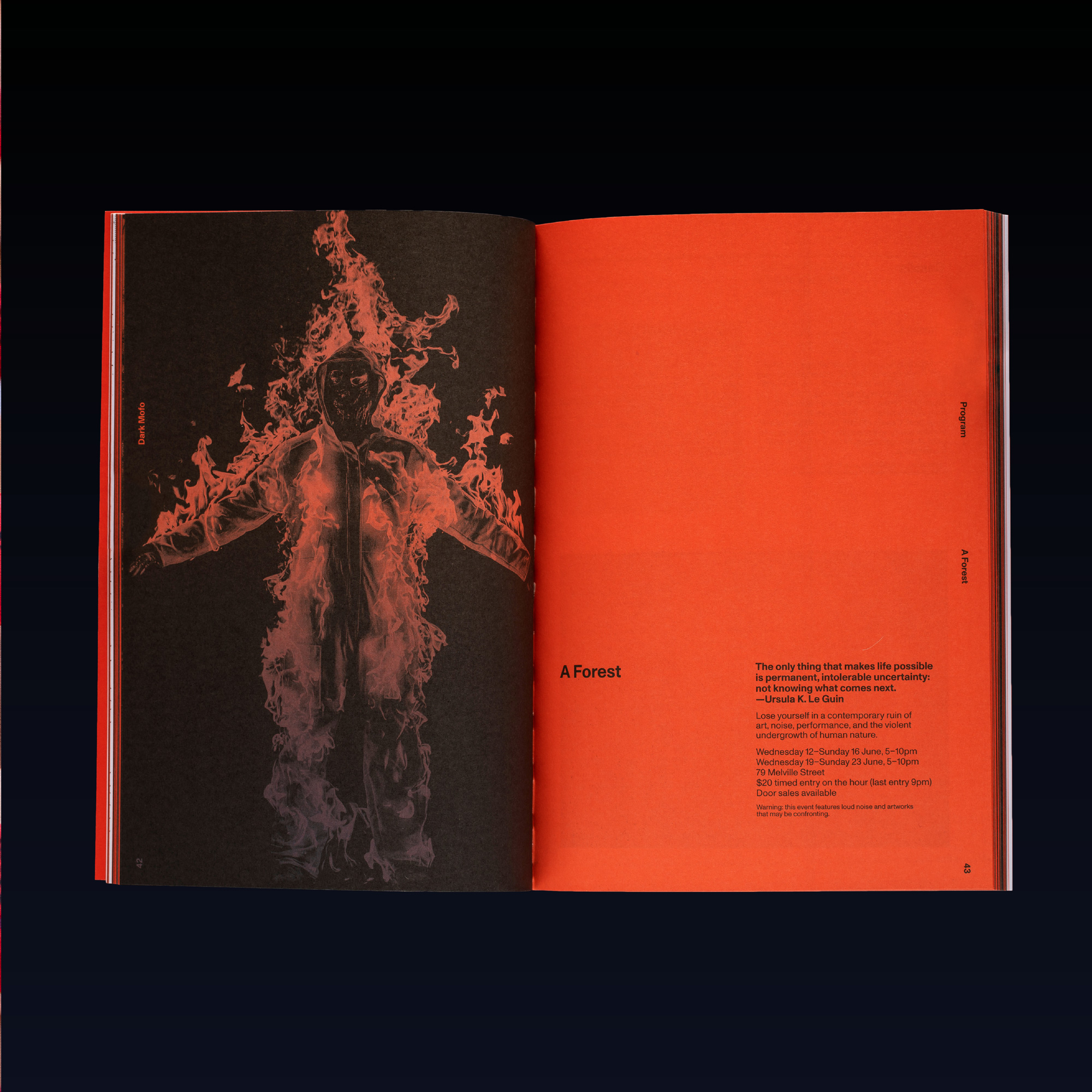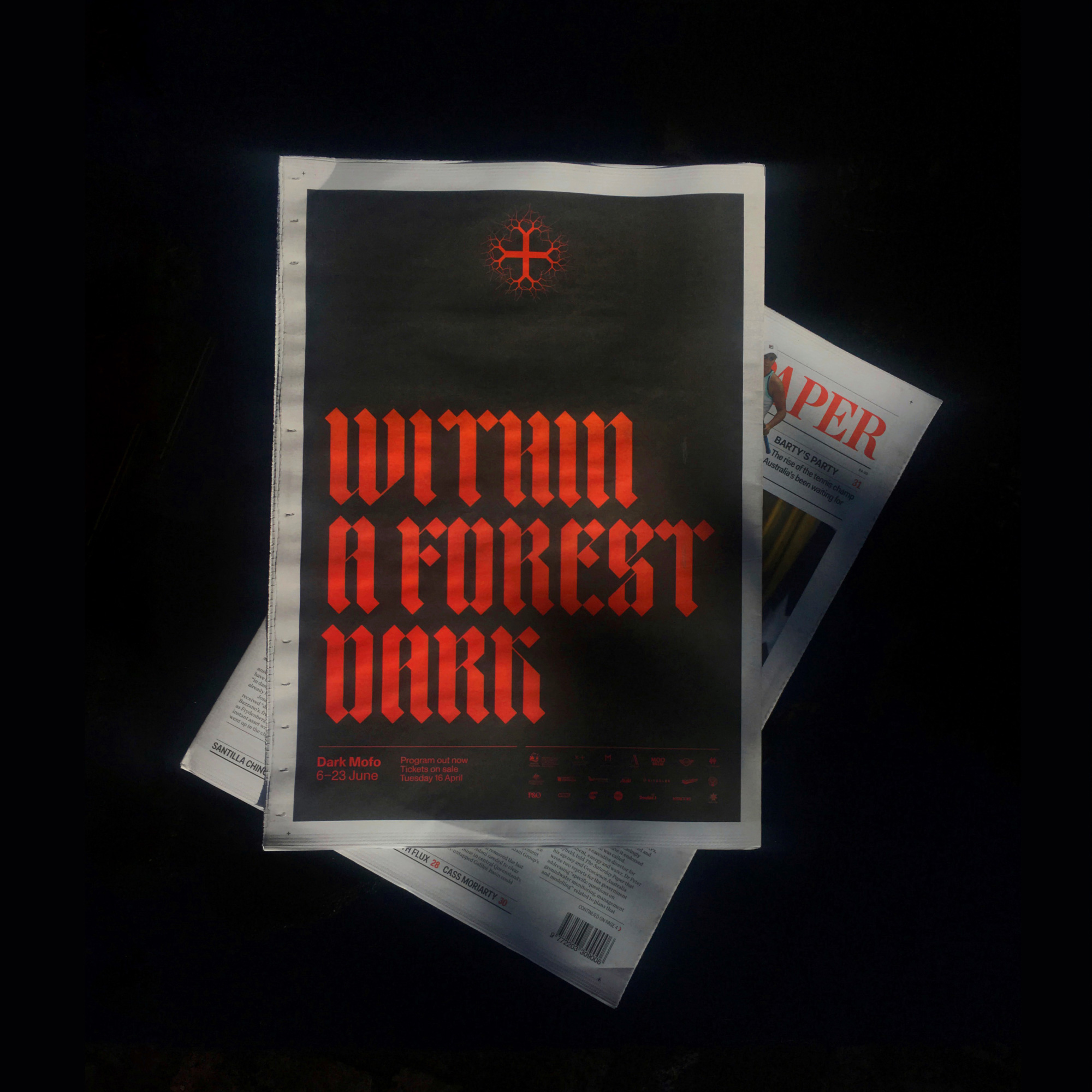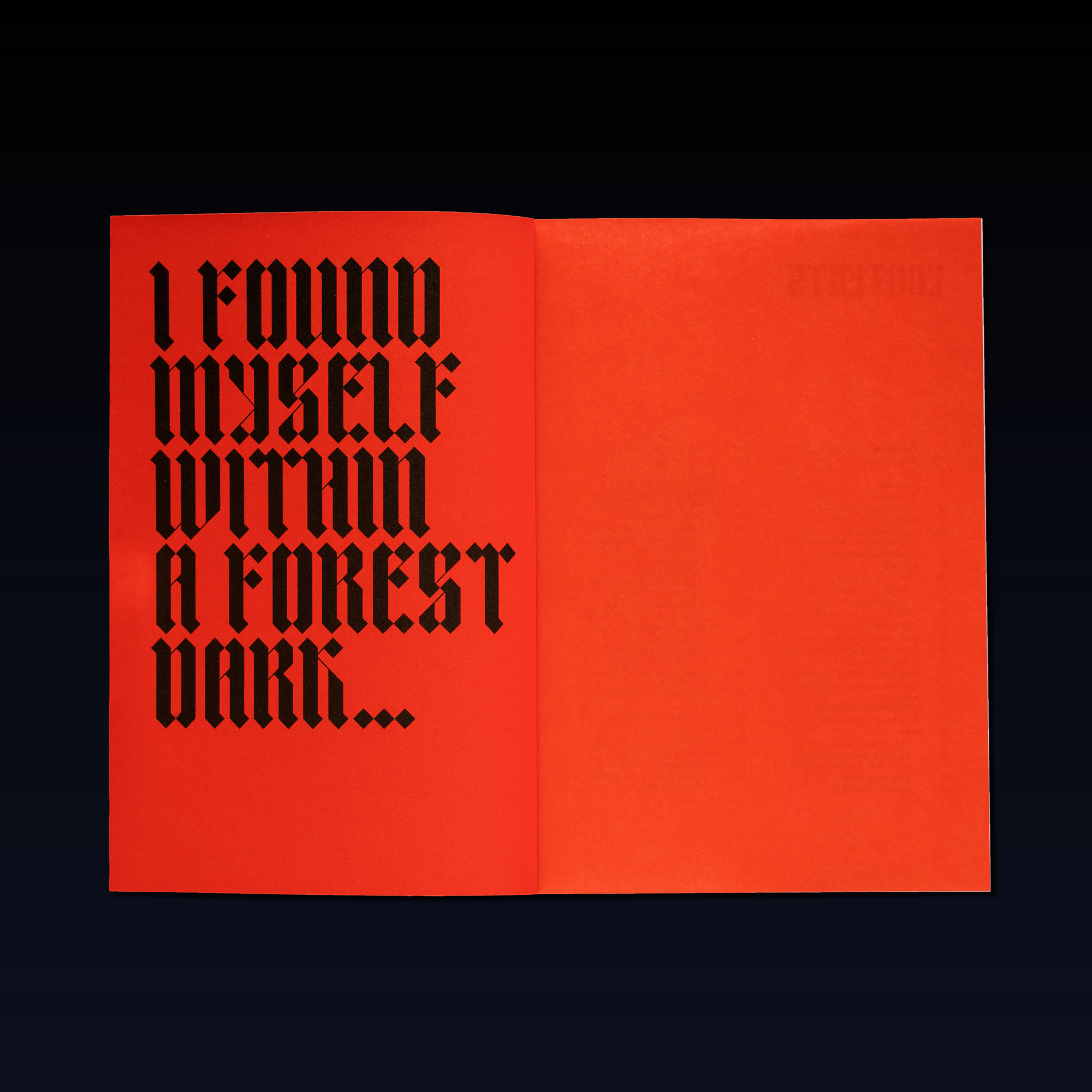The festival campaign featured numerous logo iterations, evolving as it got closer to launch. The website and digital platforms incorporated a screen-saver-like application where the logo started growing, taking over the frame after a period of inaction. Copy from Dante’s Divine Comedy is used as a recurring motif and references a festival artwork by Alfredo Jaar. The supporting typographic approach takes inspiration from fairytales with a blackletter font – TpDuro – customised by TwoPoints.Net. It is paired with ABC Monument Grotesk.