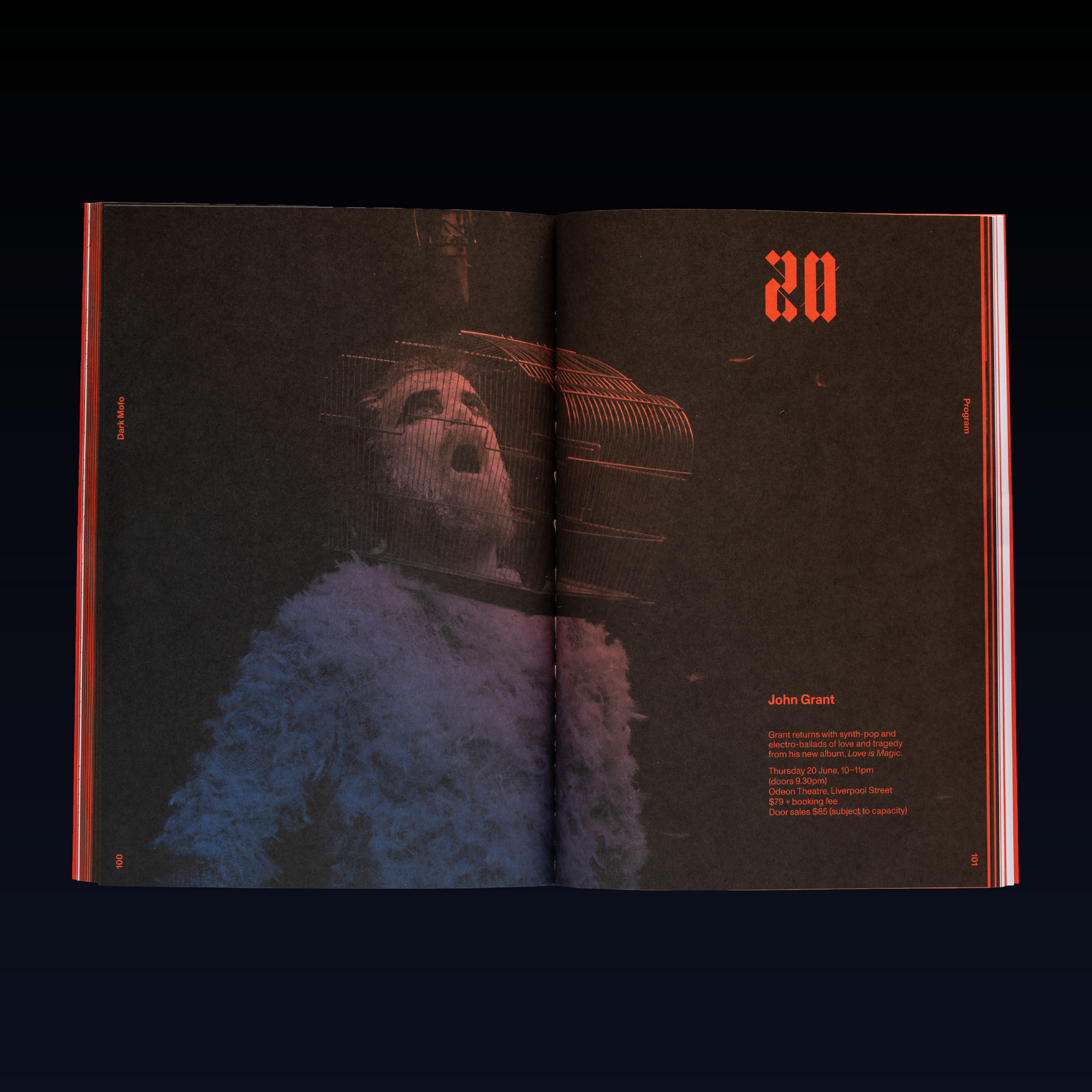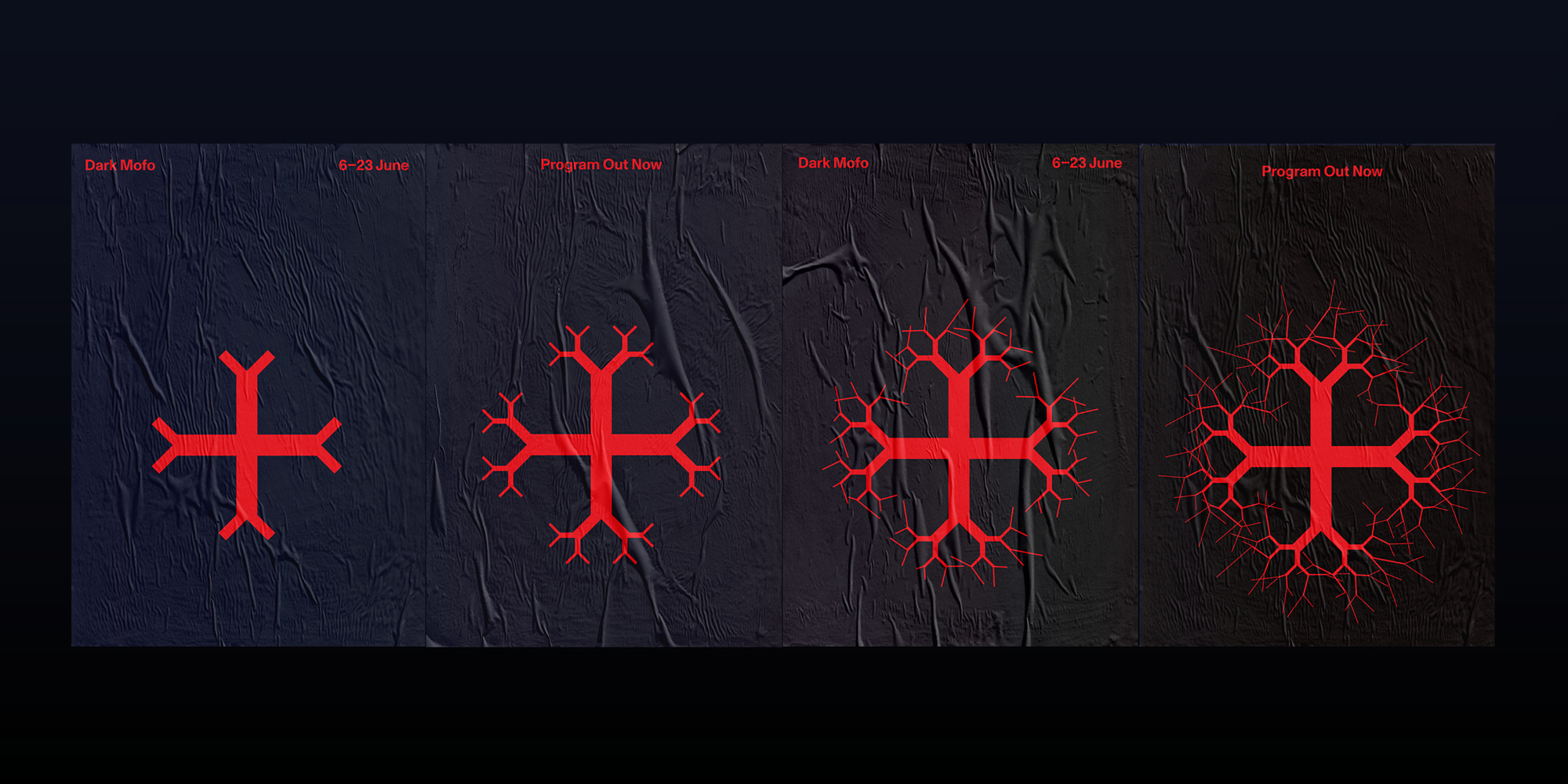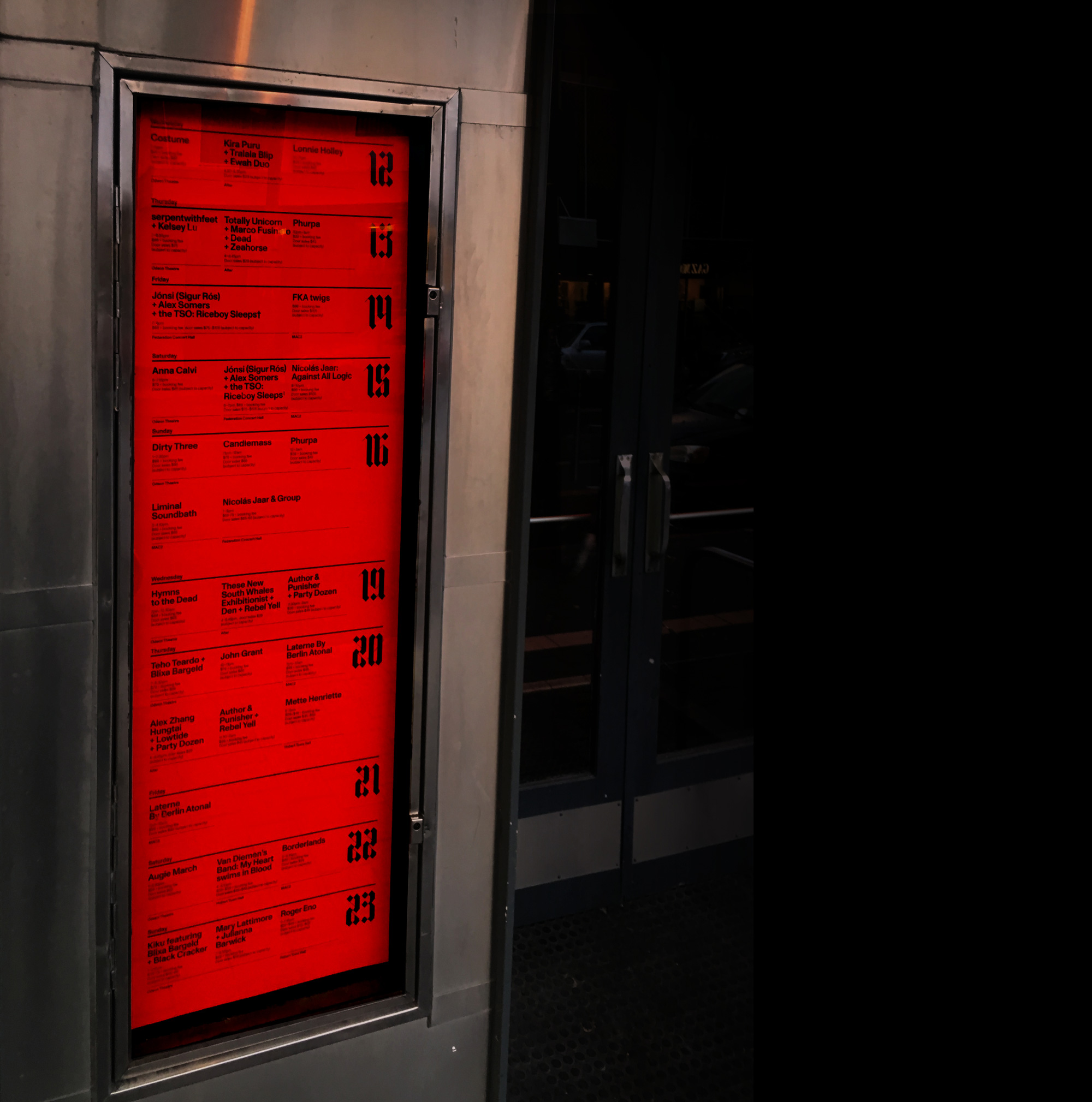The festival campaign featured numerous logo iterations, evolving as it got closer to launch. The website and digital platforms incorporated a screen-saver-like application where the logo started growing, taking over the frame after a period of inaction. Copy from Dante’s Divine Comedy is used as a recurring motif and references a festival artwork by Alfredo Jaar. The supporting typographic approach takes inspiration from fairytales with a blackletter font – TpDuro – customised by TwoPoints.Net. It is paired with ABC Monument Grotesk.