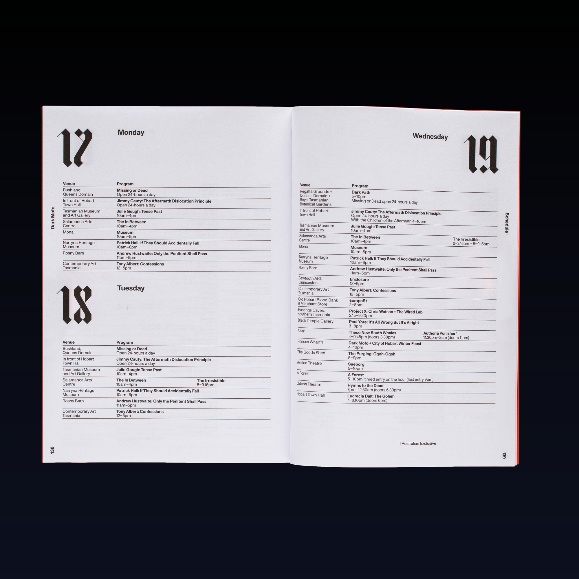 Dark Mofo is a Tasmanian festival that delves into winter solstice rituals, exploring links between ancient and contemporary mythologies, humans and nature, religious and secular traditions, darkness and light, and birth, death and renewal.