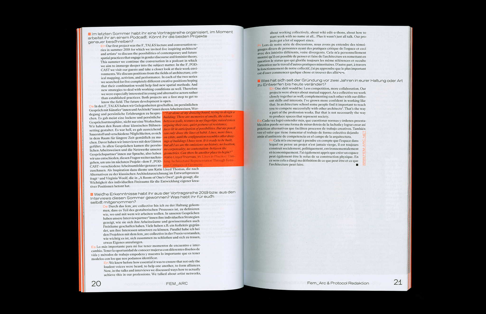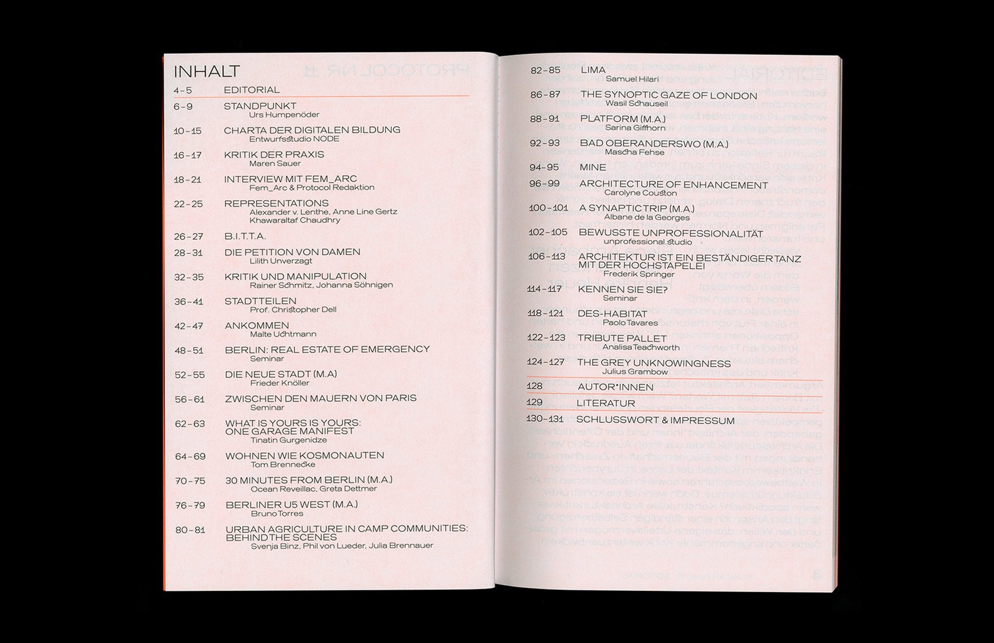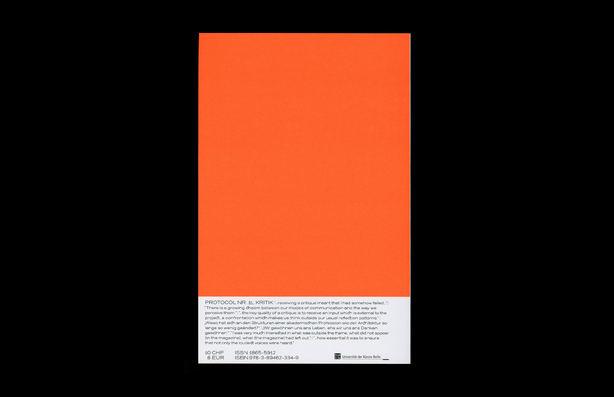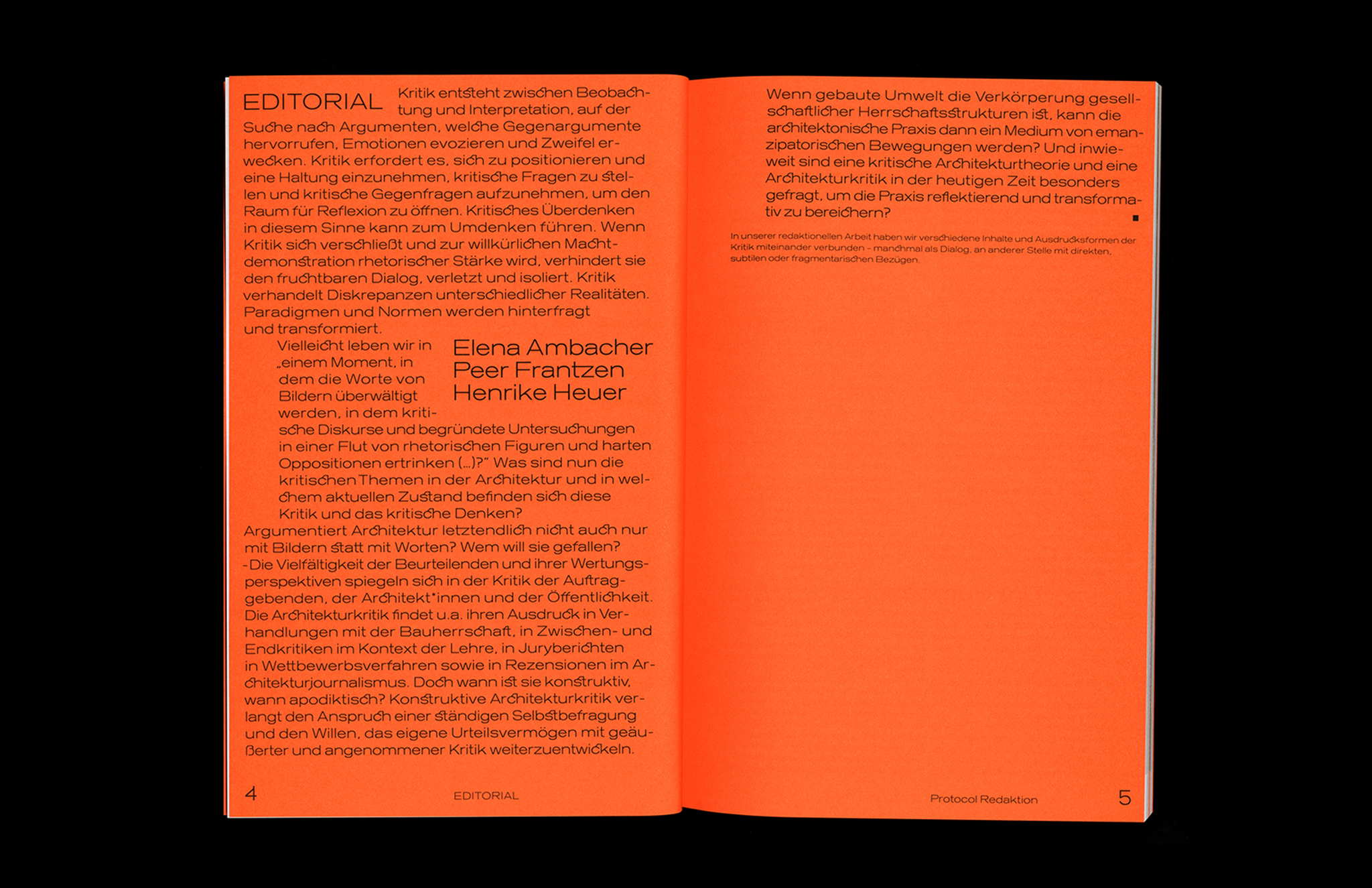 Protocol is an interdisciplinary and independent magazine about current discourses on architecture. Initiated by architecture students at the University of the Arts Berlin, it is published annually with a changing focus. This issue deals with the topic of criticism. Criticism arises between observation and interpretation, in search of arguments that evoke counter-arguments, evoke emotions and raise doubts. But what are the critical themes in architecture and what is the current state of criticism and critical thinking? Various international text and image contributions are dedicated to these and other questions. The design includes a grotesque typeface specially created for this issue, named Kritik. It’s paired with SangBleu Kingdom by Swiss Typefaces. The entire magazine was offset-printed in black and a Pantone spot colour.