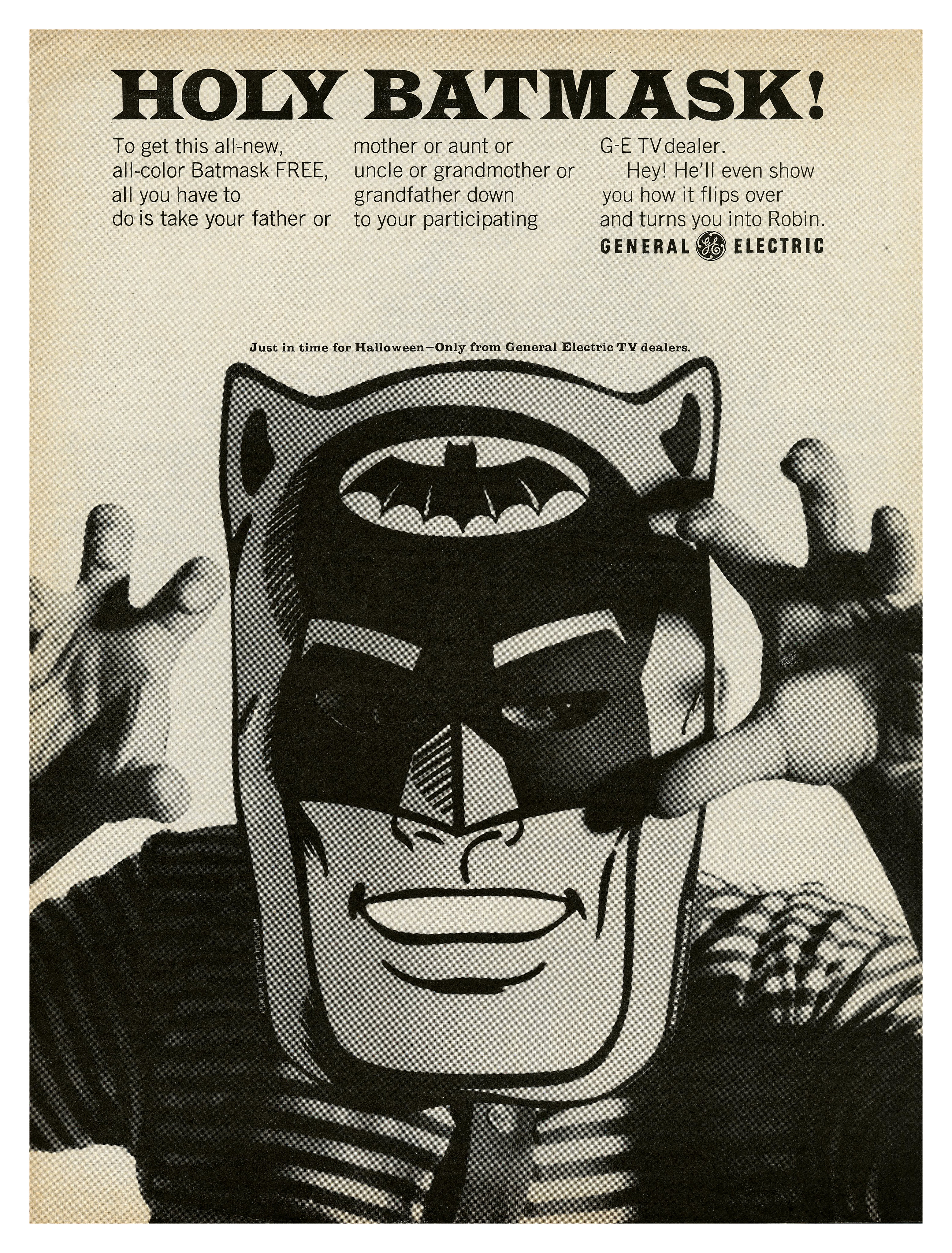 To get this all-new, all-color Batmask FREE, all you have to do is take your father or mother or aunt or uncle or grandmother or grandfather down to your participating G-E TV dealer. Hey! He’ll even show you how it flips over and turns you into Robin.
