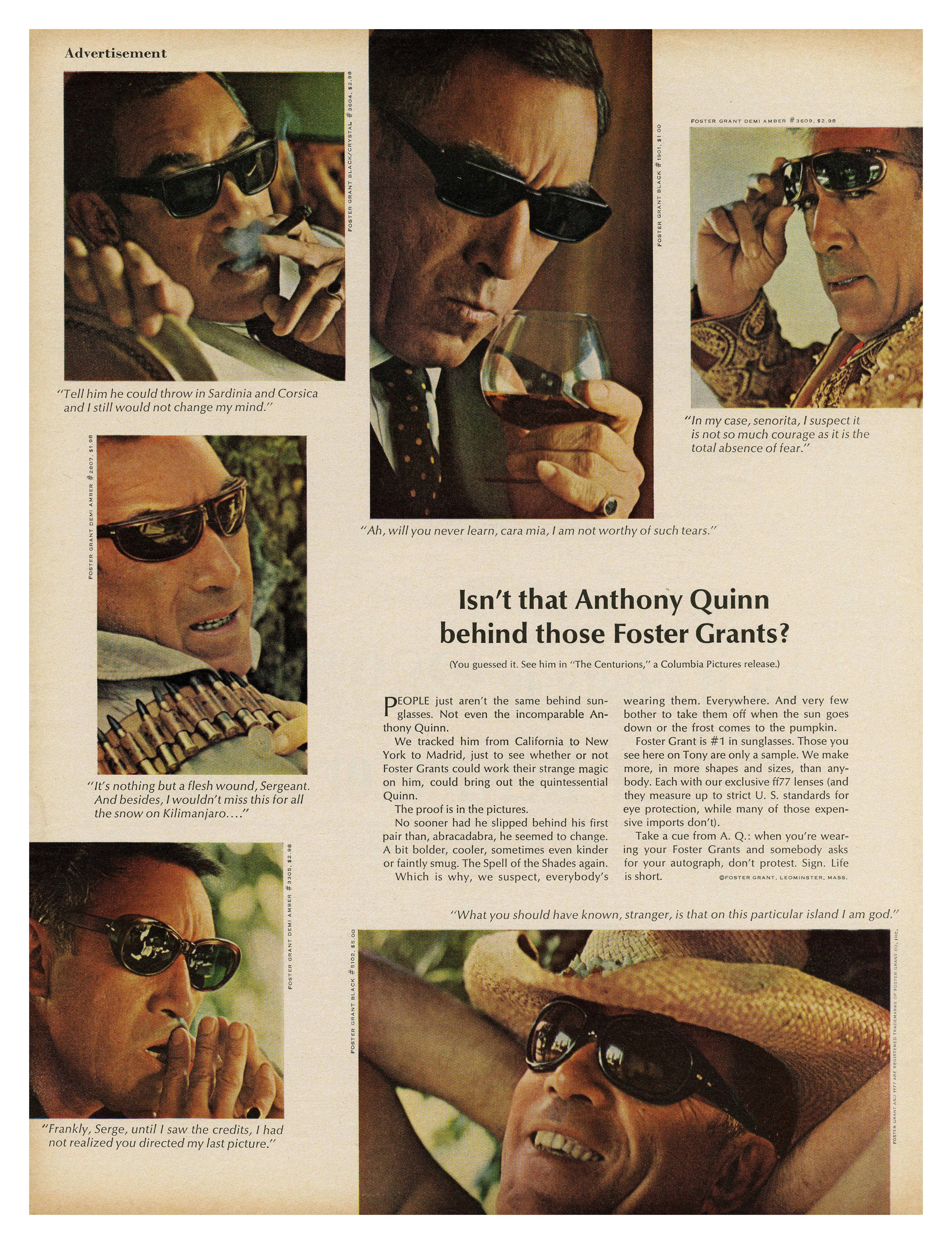 Foster Grant sunglasses ad (1966) Photo(s) by Bart Solenthaler. Imported from Flickr on Feb 27, 2020. Artwork published in 1966. Source: www.flickr.com Uploaded to Flickr by Bart Solenthaler and tagged with “optima”. License: All Rights Reserved. Magazine ad for Foster Grant sunglasses, starring Anthony Quinn and Optima. Hermann Zapf’s typeface is used in roman, italic, and bold styles. The model names are set in Copperplate Gothic. Typefaces More about OptimaGet OptimaMore about Copperplate GothicGet Copperplate Gothic Formats Advertising (2077) Topics Product (2053) Fashion/Apparel (1524) Lifestyle (1416) Tagged withmagazine ads (334)1960s (764)Foster Grant (1)sunglasses (79)Anthony Quinn (2)celebrities (76)one typeface family (1654)quotes (521)captions (519)two columns (525)drop caps (425)rotated type (2179) Artwork location United States (9775) Leominster (1) Massachusetts (59) In SetsAds of the “Mad Men” Era (Stephen Coles) (75)stuffs (jae benjamin) (200)Trash (Chad Schram) (11)capstone (Mia Harris) (51)Bart Solenthaler Collection (Fonts In Use Staff) (506)ref (Yeonjin Kim) (33) Post a comment Name Email – will not be published Website Your response Submit Comment More Optima in use Ford ads (mid-1960s)c. 1965Photo(s) by Bart Solenthaler on Flickr. Estée Lauder Companies logounknownContributed by Florian Hardwig Wil – Toivon Ettei Sust Tuu Kuuluisaa EP2021Julian GrönbergSimbayu StudiosContributed by Julian Grönberg Sponsor More in Fashion/Apparel BA Degree Show 2023, Winchester School of Art2023Studio 3015Contributed by George Davis-Ansted Massimo Dutti – Paper magazine, Vol. IV, 20202020Ana MiratsContributed by Nikolas Wrobel Staff Pick Camille Brinch Jewellery2023Daniel JulienContributed by Daniel Julien Vogue Singapore, issue 30, “POP”2024Vogue SingaporeContributed by TypeType More in Advertising Fred Hutch2014Hornall AndersonContributed by Emtype Foundry Bridge Theatre identity (2017)2017KotoContributed by Love Lagerkvist Staff Pick LEGO ads (1980–82)1980Contributed by Tânia Raposo Staff Pick Poinçon Paris event schedulesc. 2023Valentin MaynadiéContributed by Daniel McQueen (TDF) More Fonts In Use Jeongsu Woo – Three Devils by the Bedside exhibition2024KontaaktContributed by Abyme Staff Pick Boucherie Chevalinec. 1960unknownContributed by Stephen Coles Staff Pick Les lettres sont de belles manières de voyager, Lycée Maurice Genevoixc. 2023Bureau Roman SebanContributed by Roman Seban Staff Pick Niche monument, Calic. 2016Pantoja ArquitectosContributed by Estudio Calderón Staff Pick