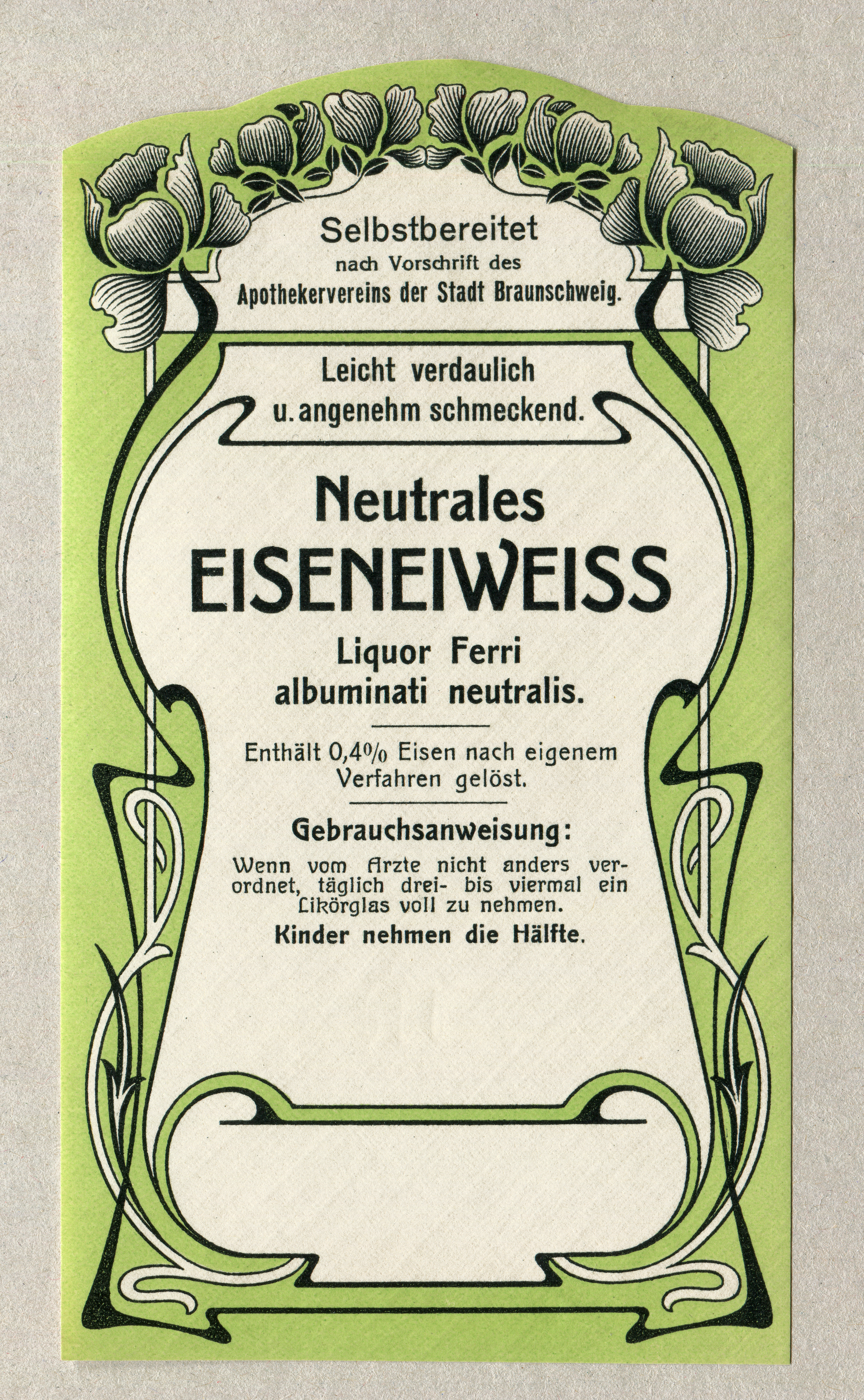 Label for neutral iron protein, or Liquor Ferri albuminati neutralis, “self-prepared according to the regulations of the pharmacist association of the City of Braunschweig”.