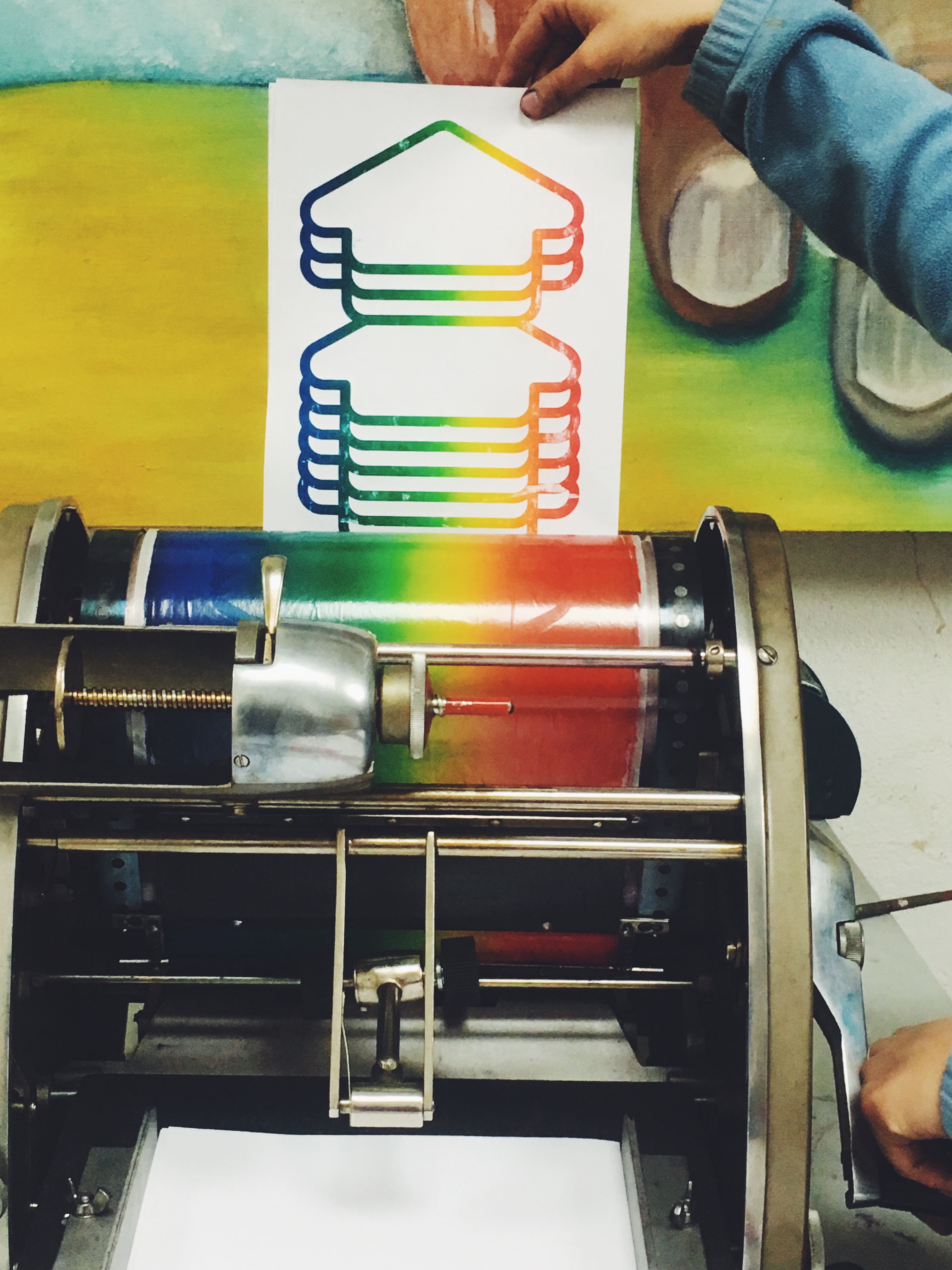 The poster is printed on a mimeograph from 1967 in eight runs. Mimeography is a more or less extinct stencilprint technique and a predecessor of risography. Although the process is more complex, you can do things that the Riso cannot do, such as printing on folded paper, cardboard and textiles, or creating gradients.