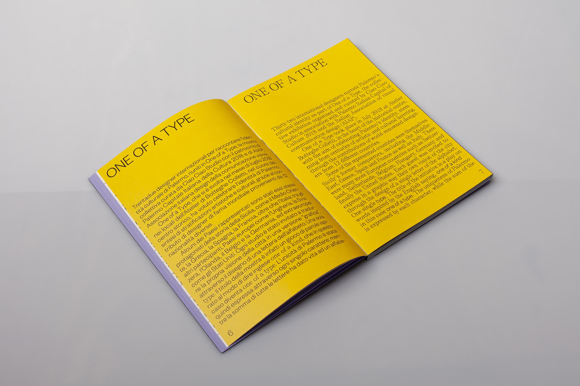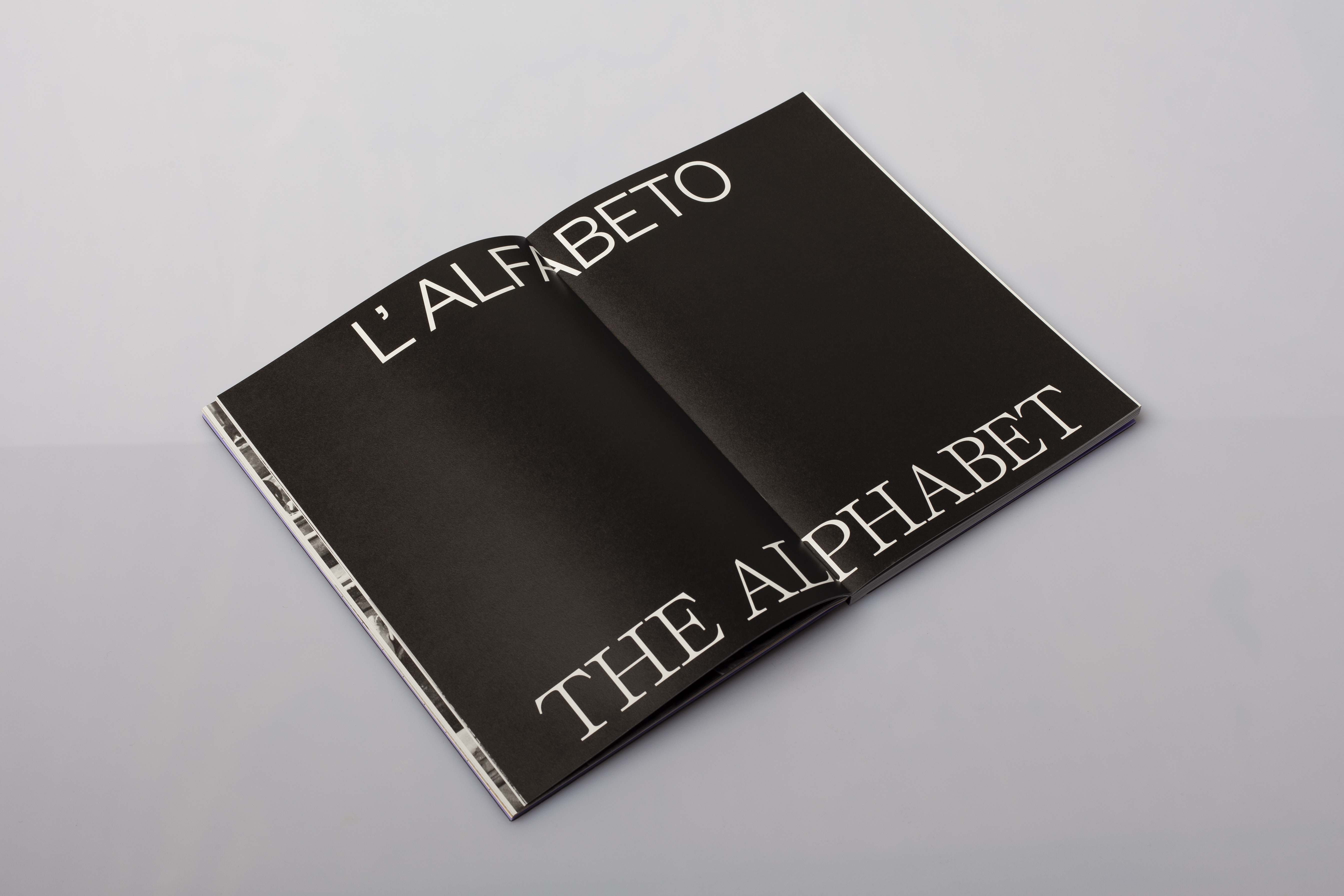Founders Grotesk by Klim is used throughout for the Italian texts, while Self Modern from Bretagne type foundry is used exclusively for English texts. The use of two typefaces helps highlighting the two languages in which the book is written. One of a Type is printed on Favini papers.