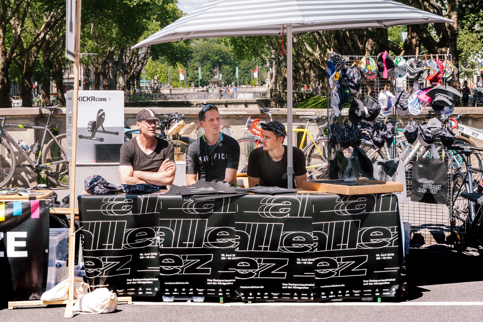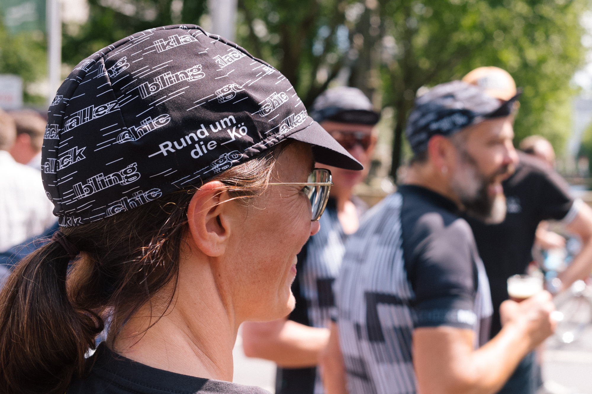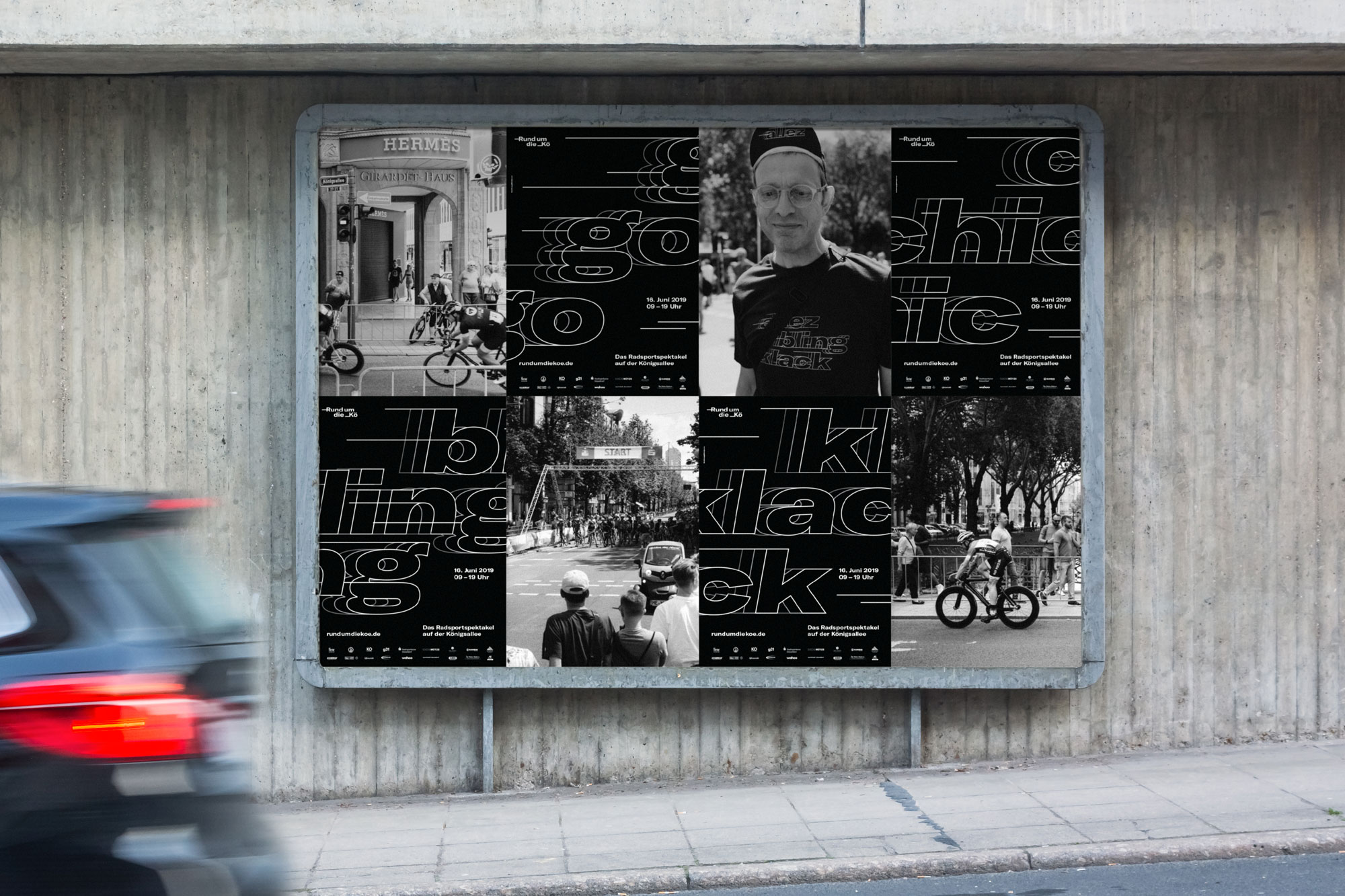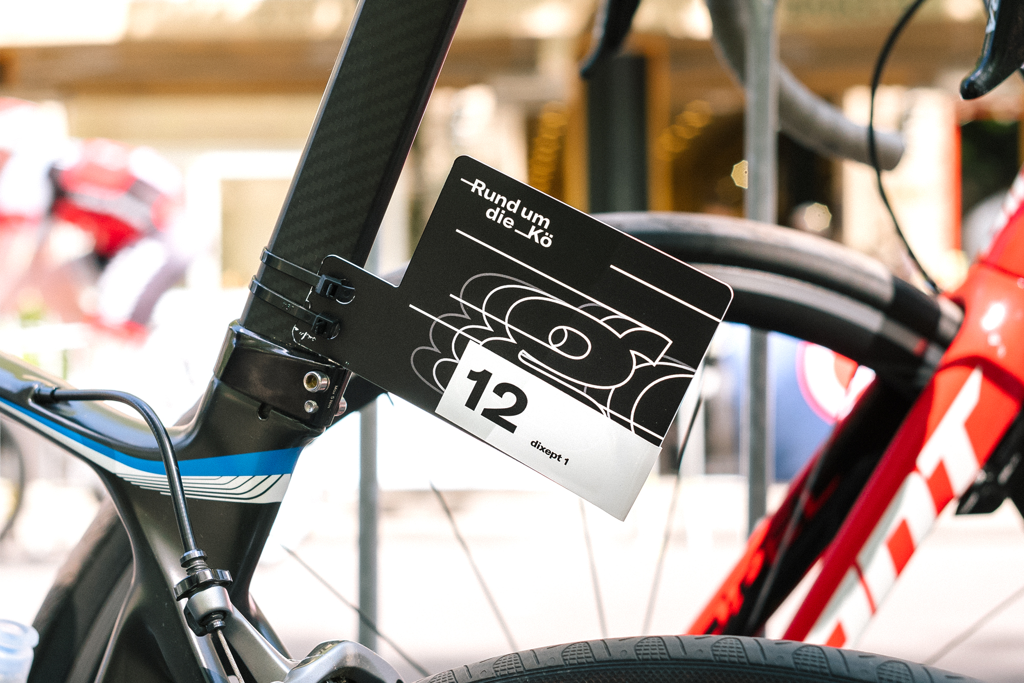 In June 2019, the 50th annual Rund um die Kö (“Around the Kö”) cycle race took place in Düsseldorf. Previously, the race was almost exclusively seen as a sporting event – providing few points of contact with its high-end shopping street surroundings. The ambition of the new generation of race organizers was to take advantage of the races’ prestigious surroundings and blend tradition with the here and now by adding a pinch of spectacle and novelty to the race. Today, bike race culture is much more than just spectators lined up to watch athletes – it also means good food, market stalls offering the latest in bike accoutrement, and pulsating beats blasting as athletes whiz by. Our task was to develop a striking new look for the new race concept.