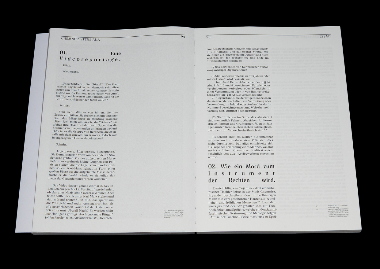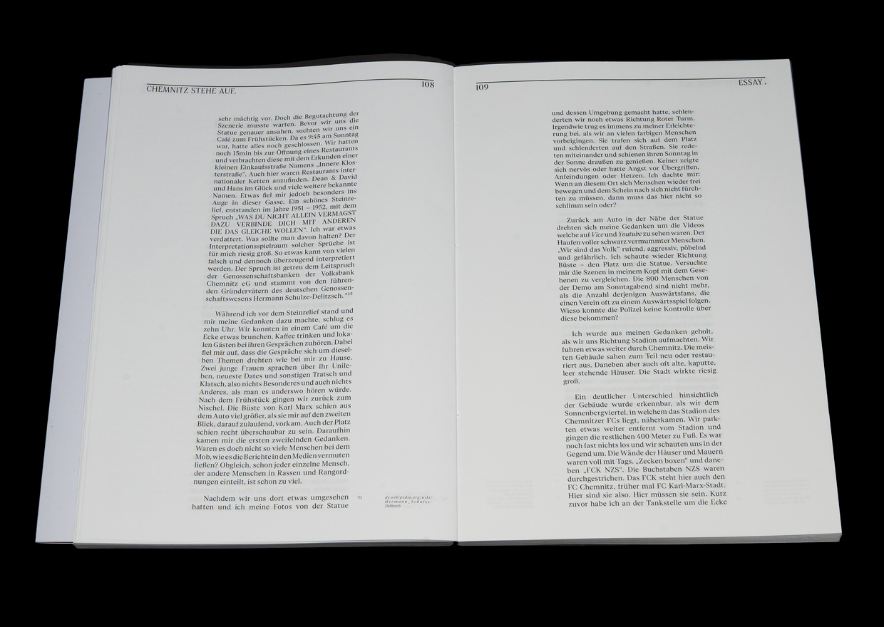 Chemnitz – Links Mitte Rechts is a confrontation with the city of Chemnitz. The work focuses on the city in Saxony, Germany, which is caught in the flow of various political opinions. It deals with the current situation after the demonstrations in August 2018, 30 years of reunification and today‘s life of the local people. This book is based on real events. However, it only shows my own experience and my very personal view of what happened. The book is divided into three levels that show how I have “felt”, “experienced”, and “seen” the city. Since these states are always somehow connected to each other while they affect one. Often at the same time. Due to this they are also shown simultaneously in the book. In order to force the viewer to take action, certain pages have to be opened to see the complete content.