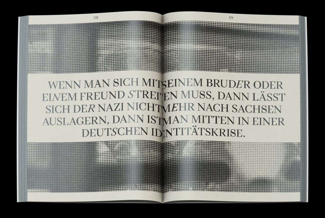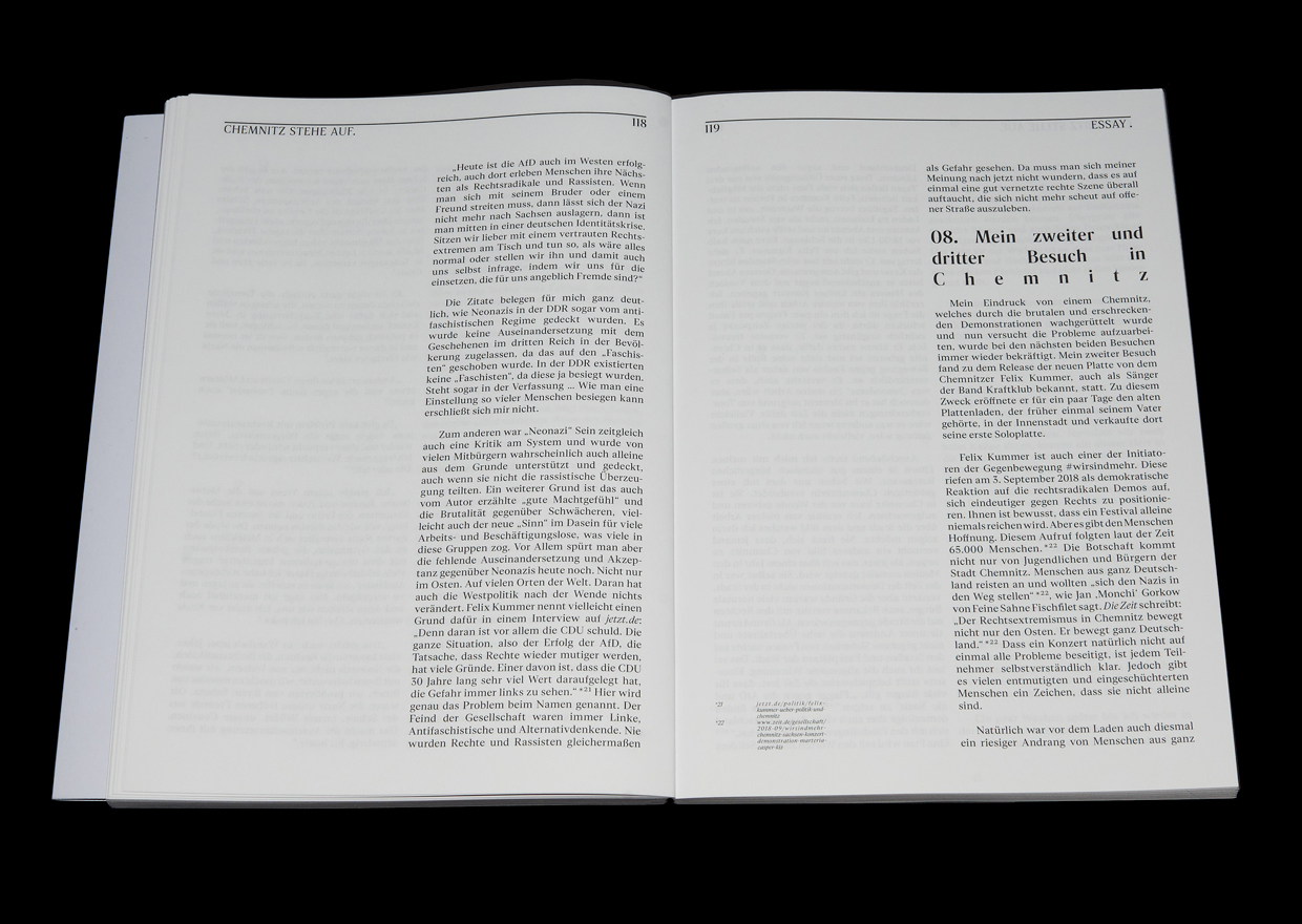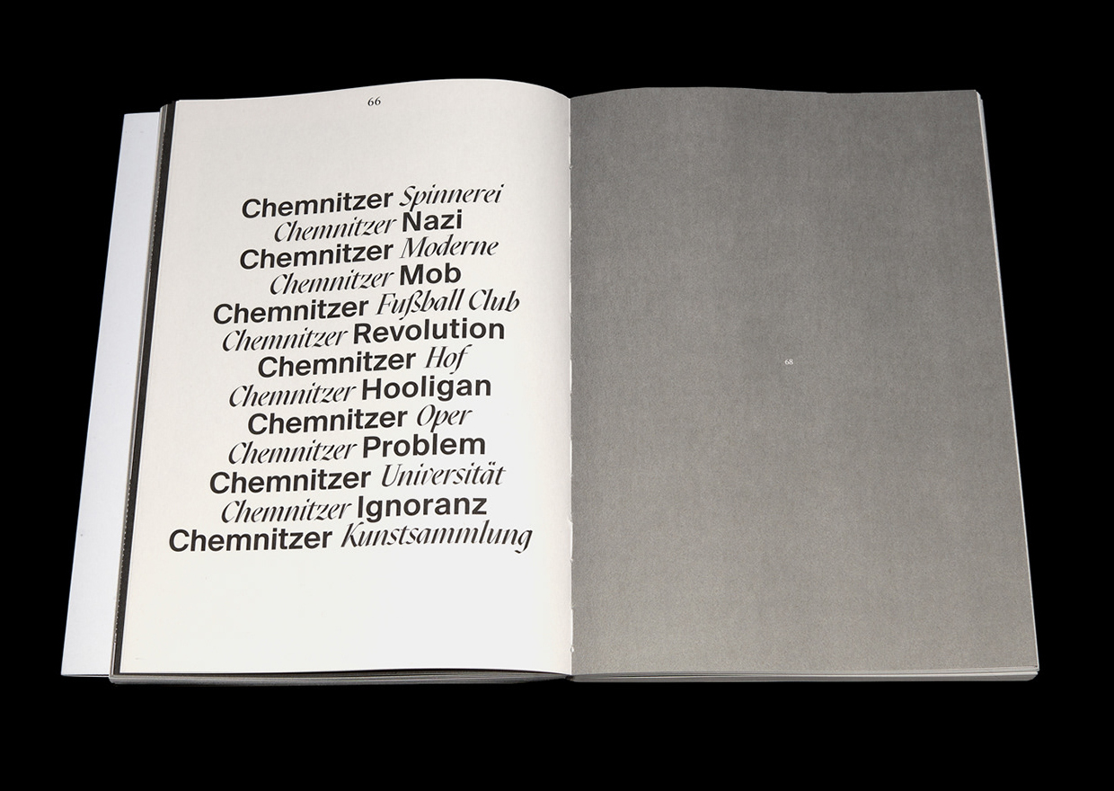 As Chemnitz appears to be a complex city to me, I didn’t want to limit myself to just one font and rather decided to mix several fonts together. The text of the essays is set in Eliza, with Rando Display for headlines. Additional fonts used for the book design that are not mentioned in the captions include Engravers Old English, Sculpin, and Kunda Book (not pictured).