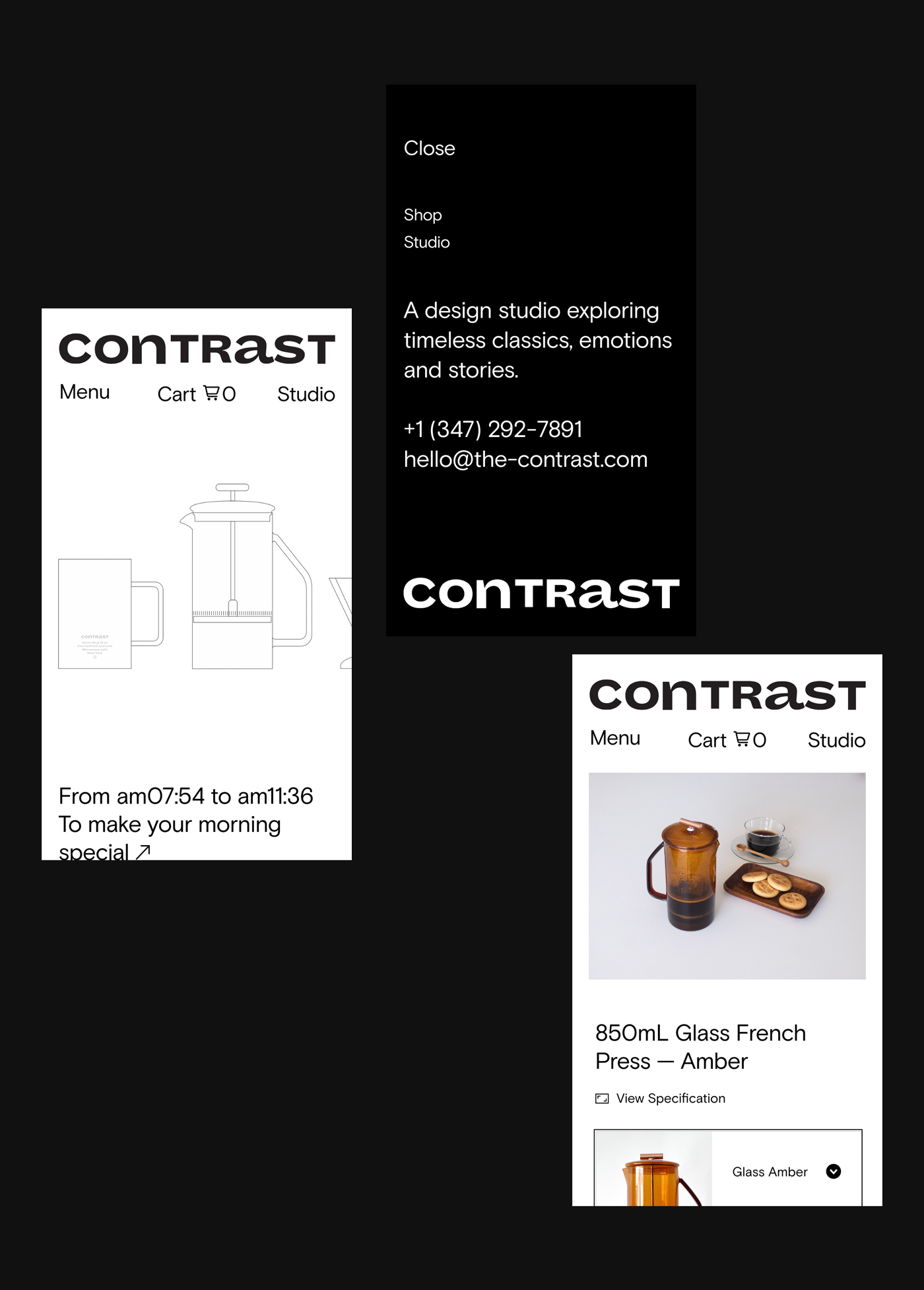 Contrast is a design studio based in New York exploring timeless classics, emotions, and stories through color, typography, and forms. The studio pursues authentic yet sustainable design that works over generations. The custom logotype was developed based on Dia because of its warmth and mildly quirky personality. Basis Grotesque is used as a primary brand typeface giving a clean timeless look—making it a white canvas that embraces a wide range of esthetics.