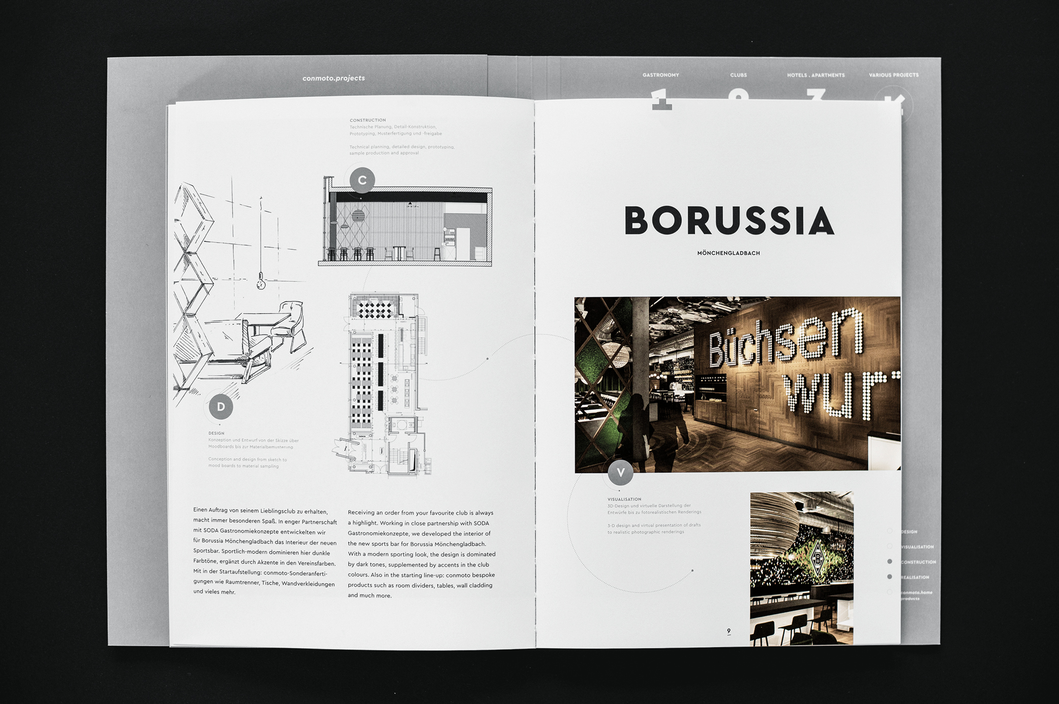 Another focus for conmoto is their individually tailored designs for international clients. Their brochure Your project is in our DNA presents some of their projects. Using a visual system inspired by highly-abstracted DNA structures, it breaks their projects down into component parts and weaves them together again in a way that makes their work and process easy to understand. As a business-to-business marketing tool with a premium appearance, the layout has a simple colour palette that provides a neutral backdrop for the various references and details.