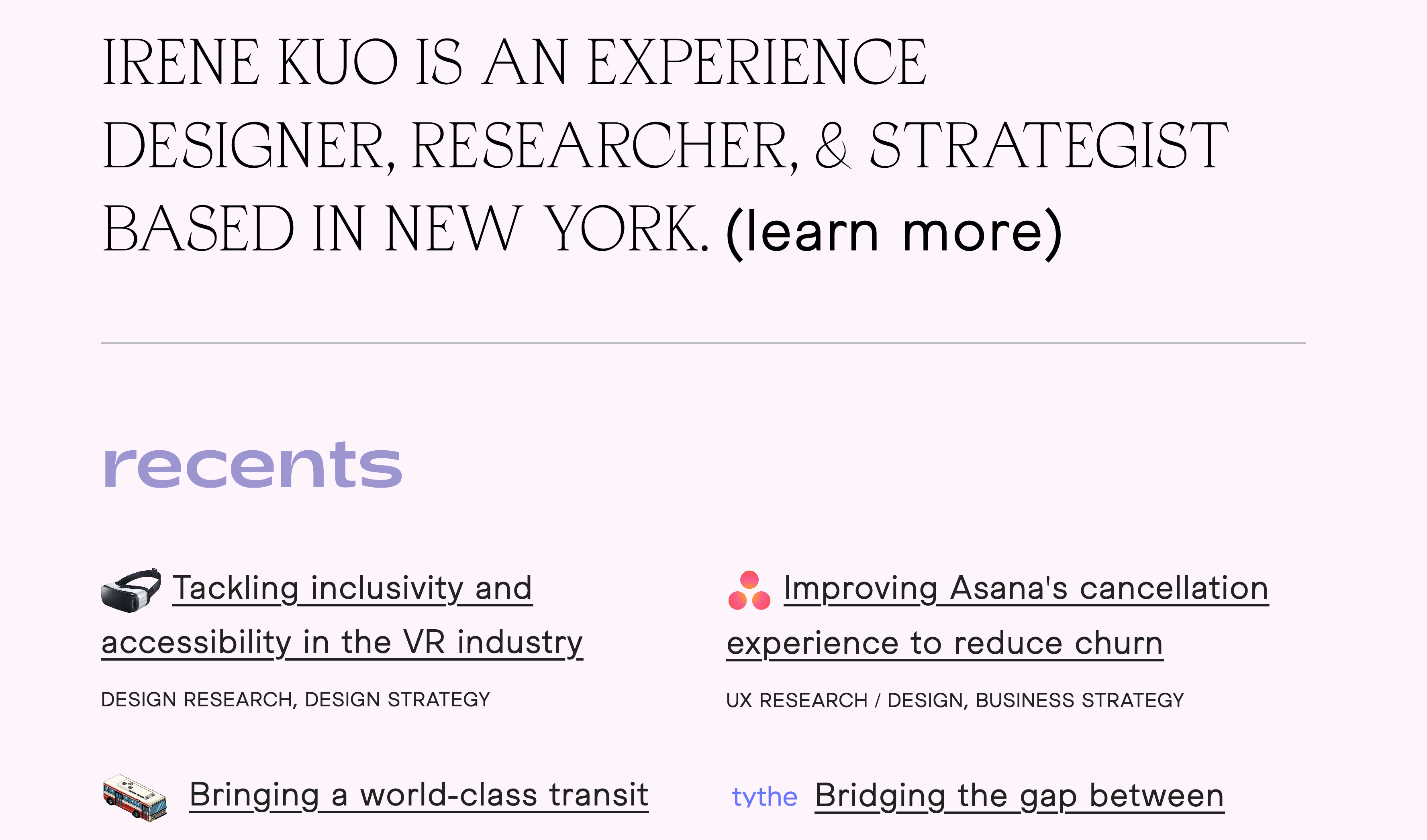 The portfolio website of New York experience designer Irene Kuo uses Maax and Maax Raw (205TF), Apoc (Blaze Type) and Adieu (Good Type Foundry). Maax Raw is used in two weights for headlines and page navigation, Maax is used for body text. In the visuals, Maax is used with a set of alternate glyphs: note the tail on the lowercase a and the double-storey g.
