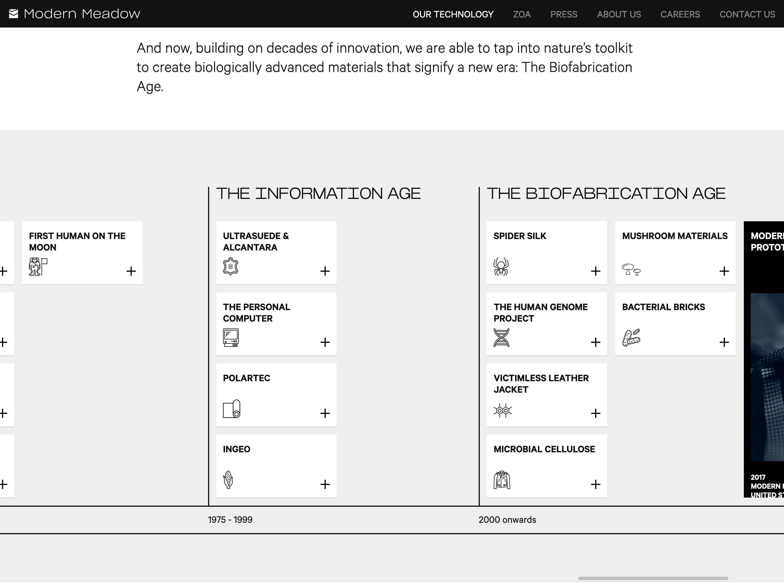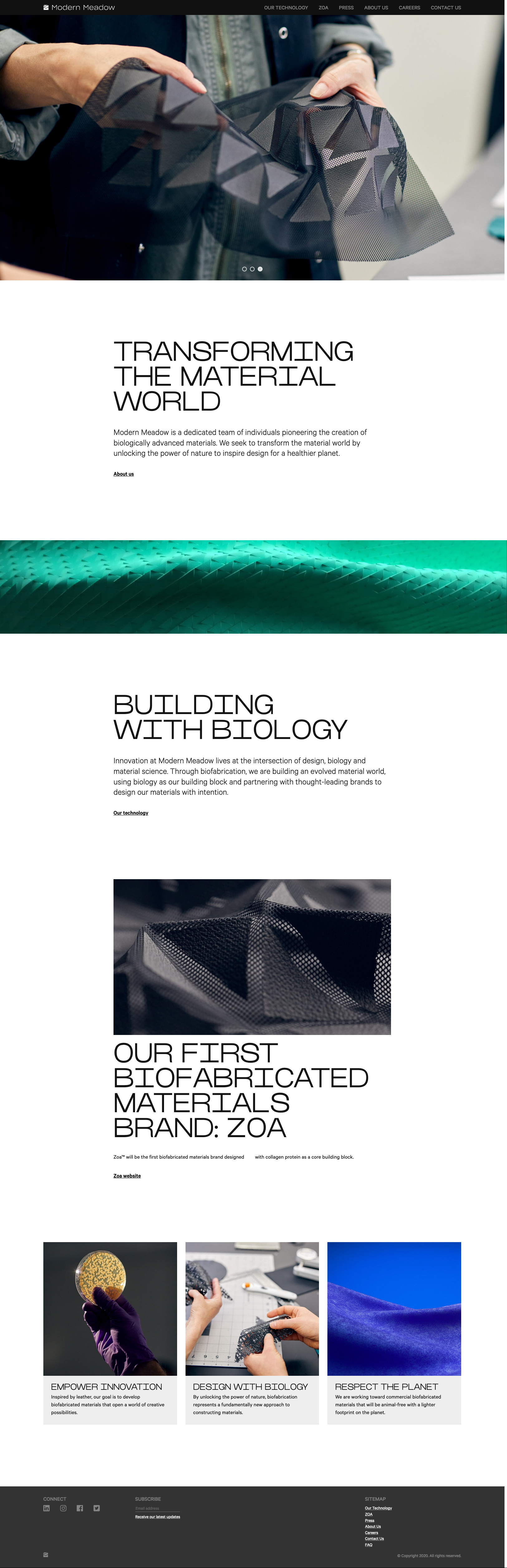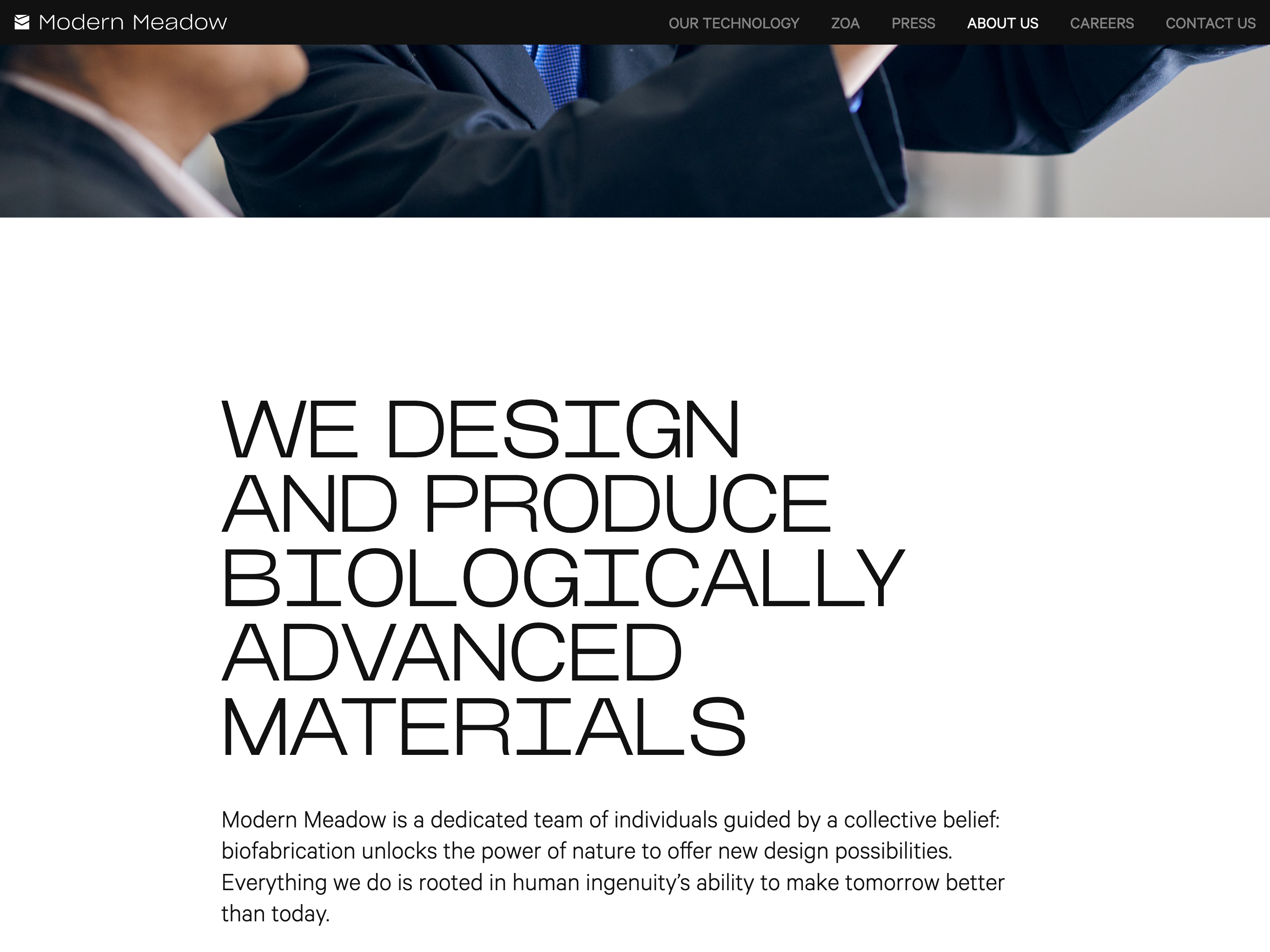 Modern Meadow is a dedicated team of individuals guided by a collective belief: biofabrication unlocks the power of nature to offer new design possibilities. Everything we do is rooted in human ingenuity’s ability to make tomorrow better than today. A pioneer of biofabrication, we believe that multidisciplinary collaboration between design, biology and material science can lead to smarter ways to make evolved materials. We partner with thought-leading brands to transform the material world and design for a healthier planet.