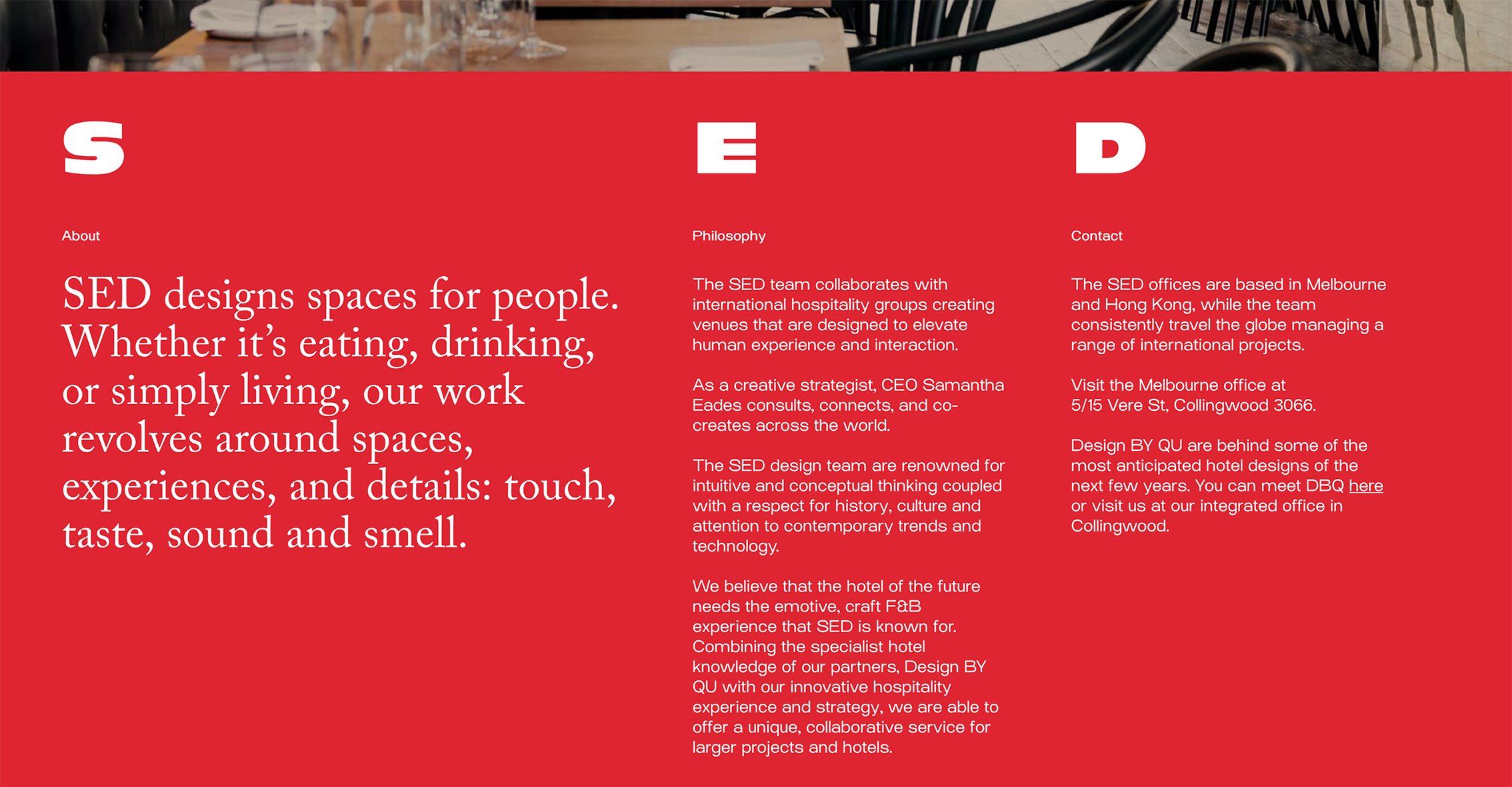 The SED team collaborates with international hospitality groups creating venues that are designed to elevate human experience and interaction. SED designs spaces for people. Whether it’s eating, drinking, or simply living, our work revolves around spaces, experiences, and details: touch, taste, sound and smell.