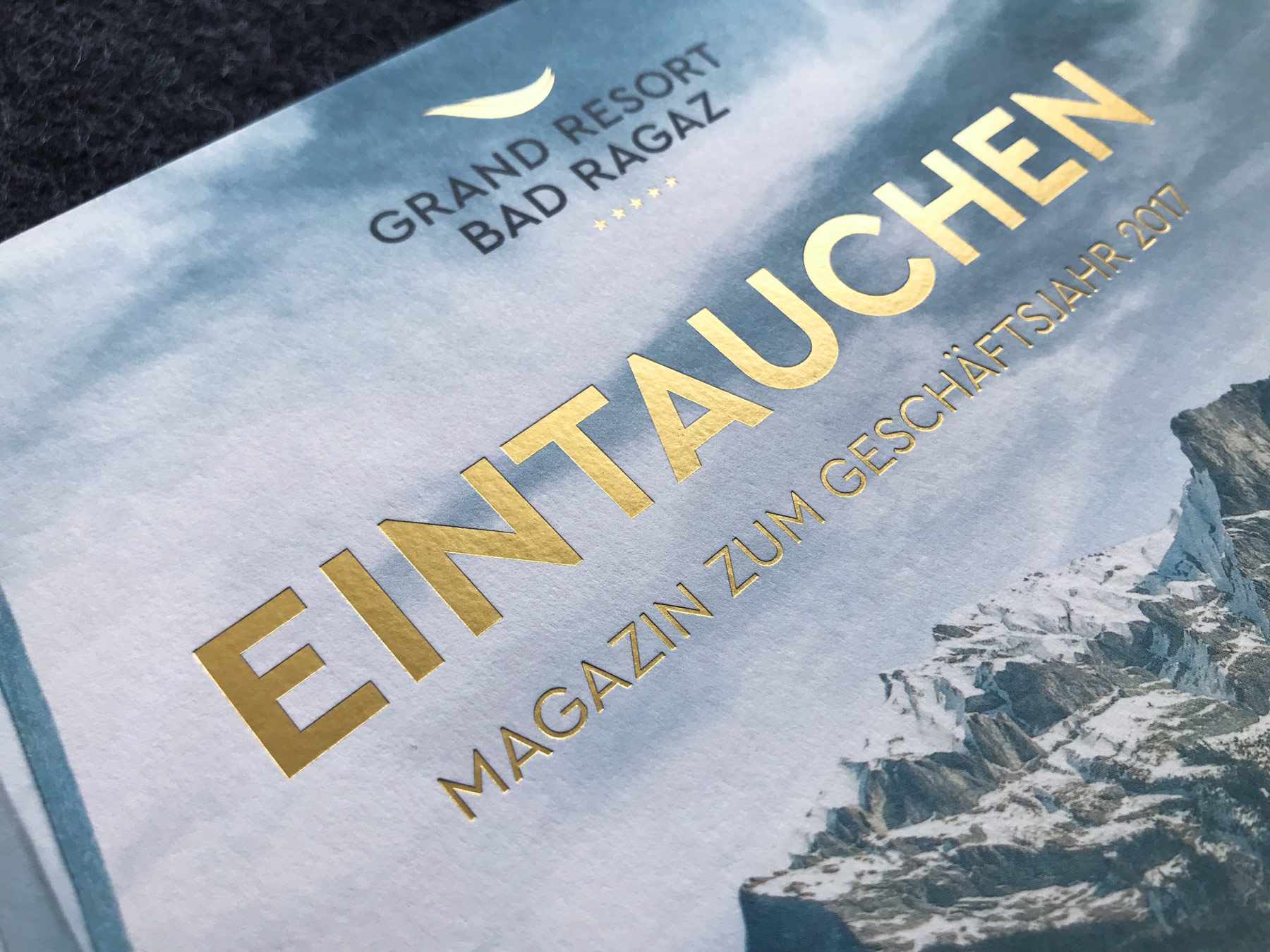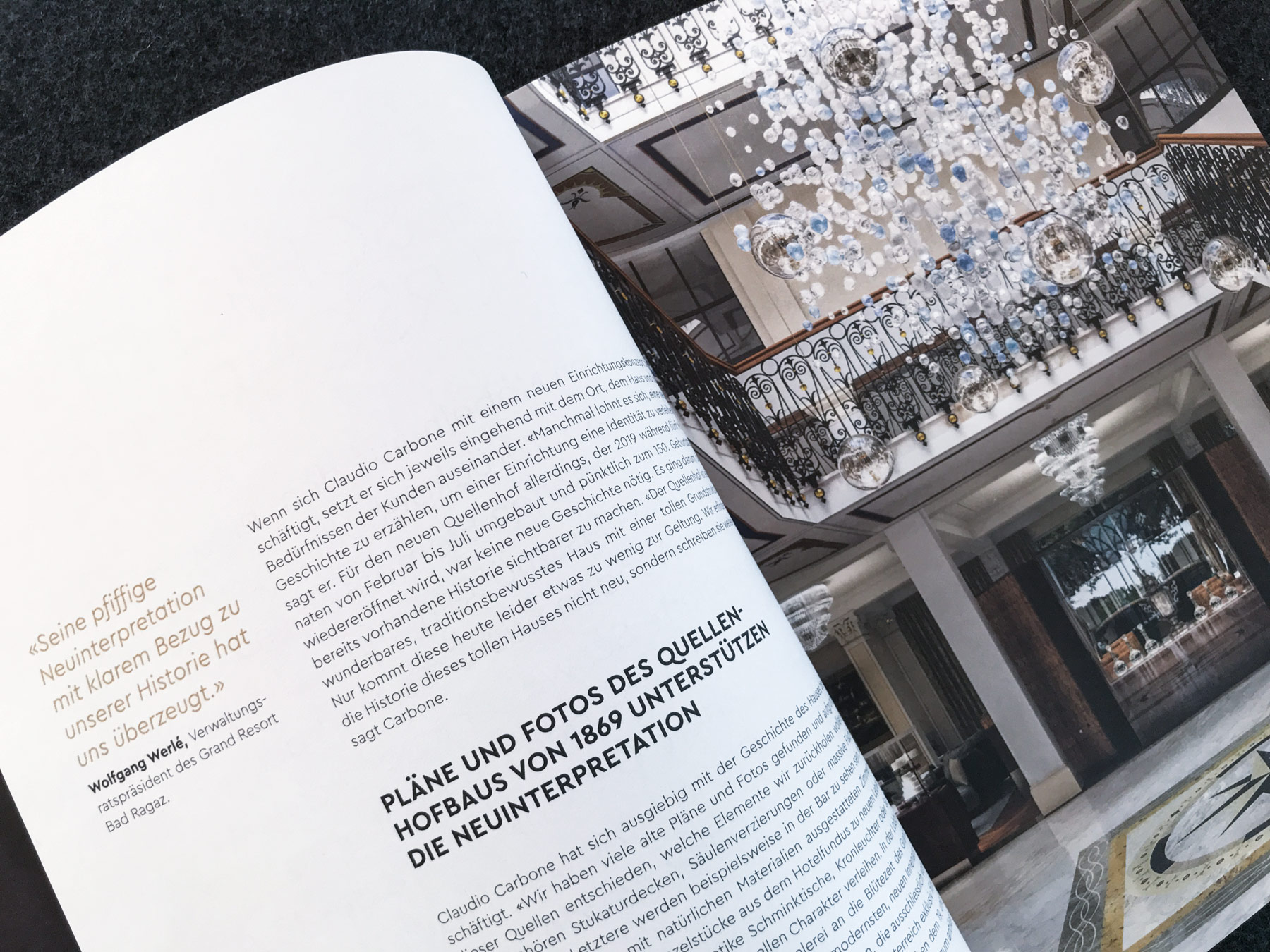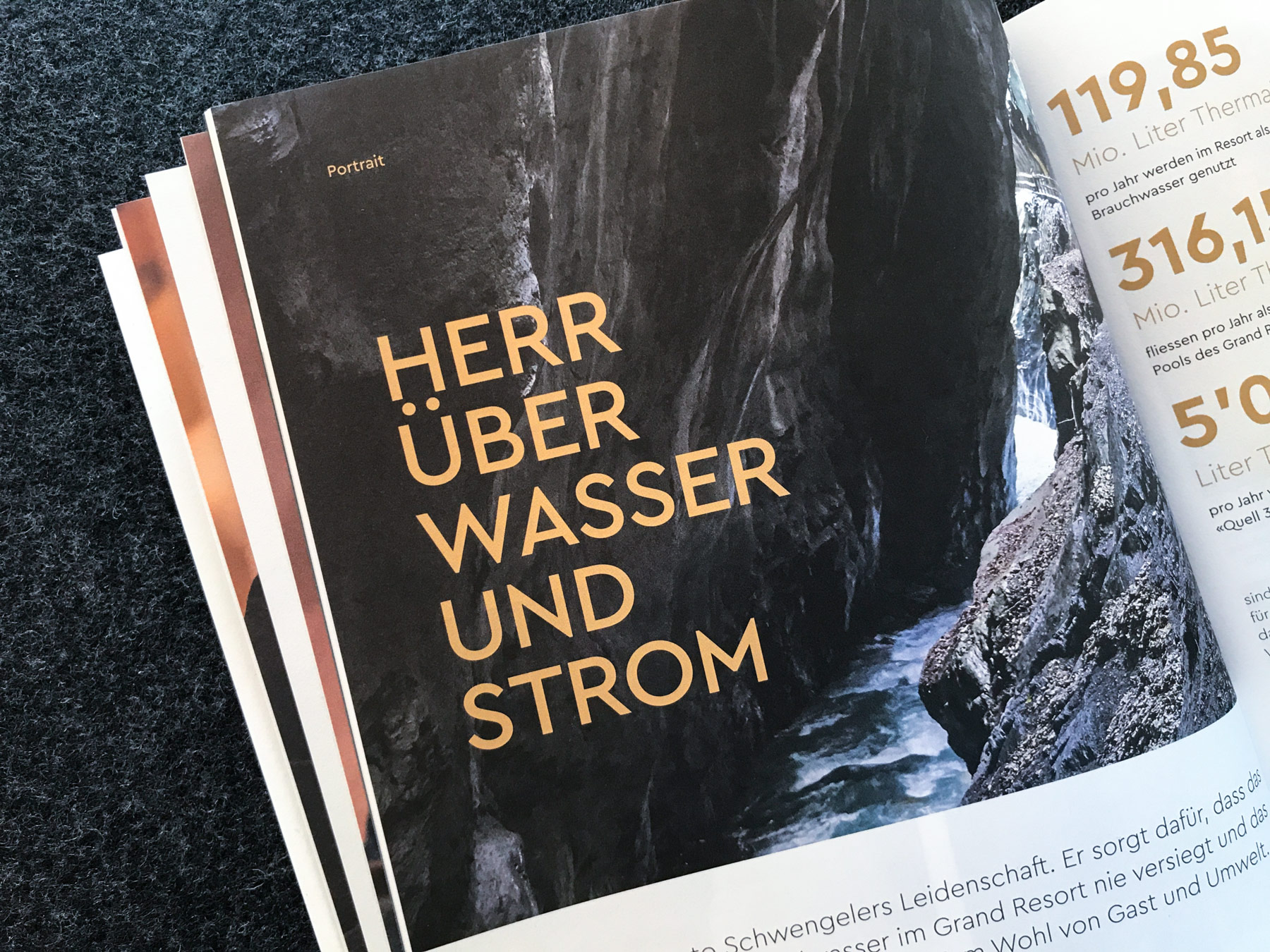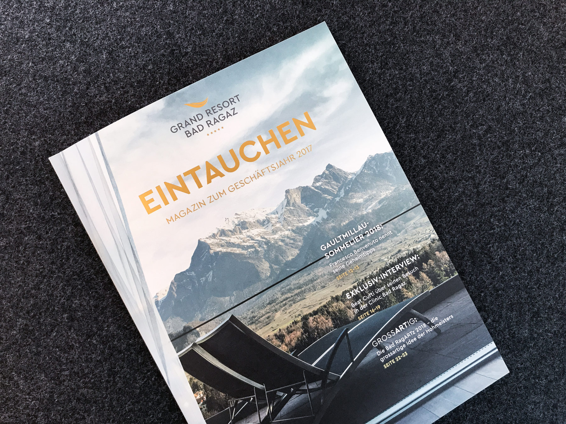 Logo, magazine and website – or, in short, the complete visual identity – of Grand Resort Bad Ragaz is designed in an elegant layout with lots of white space and based on a single typeface family: geometric Cera with fits the golden and royal blue colour scheme and luxurious and upscale brand atmosphere.