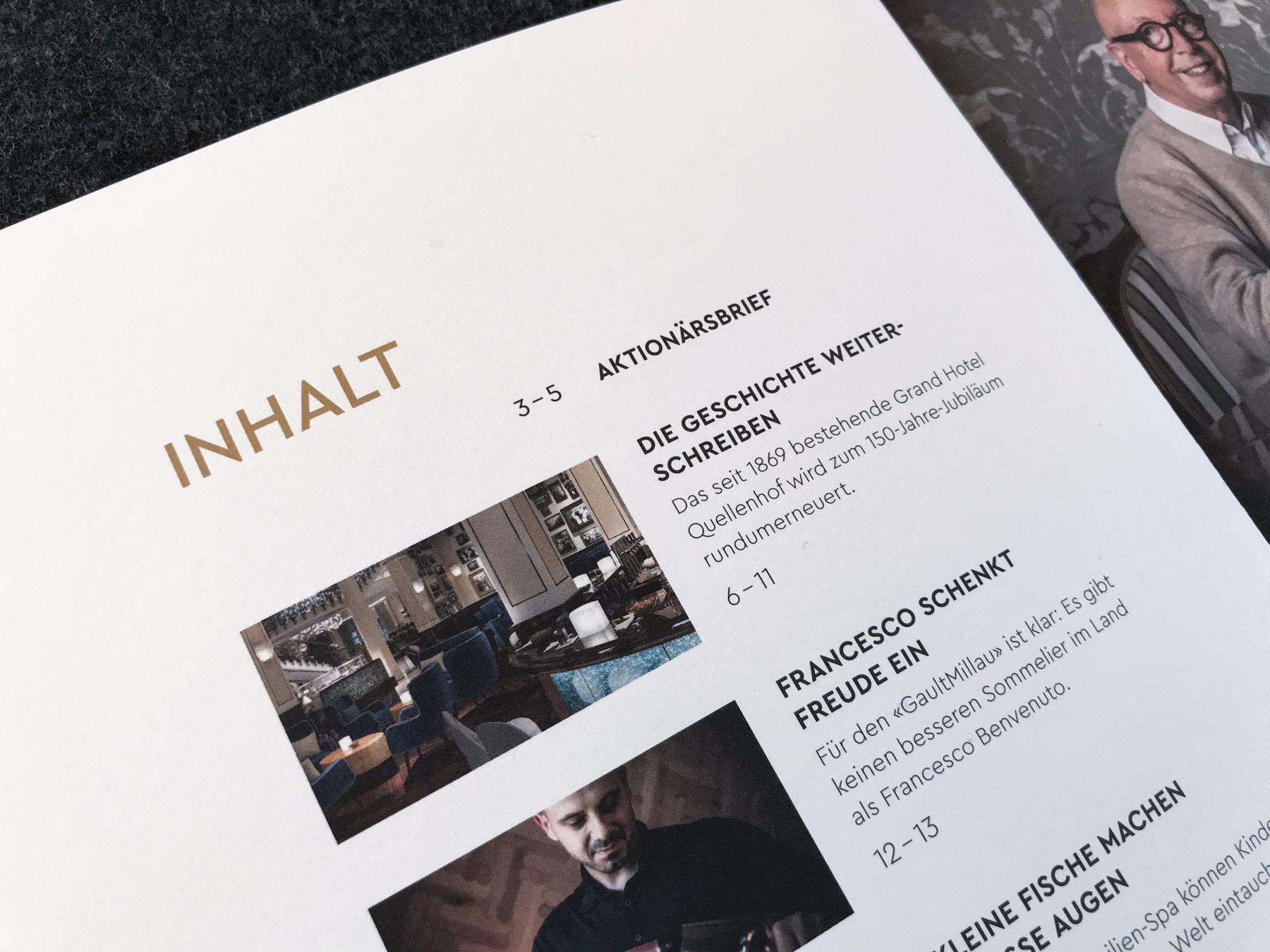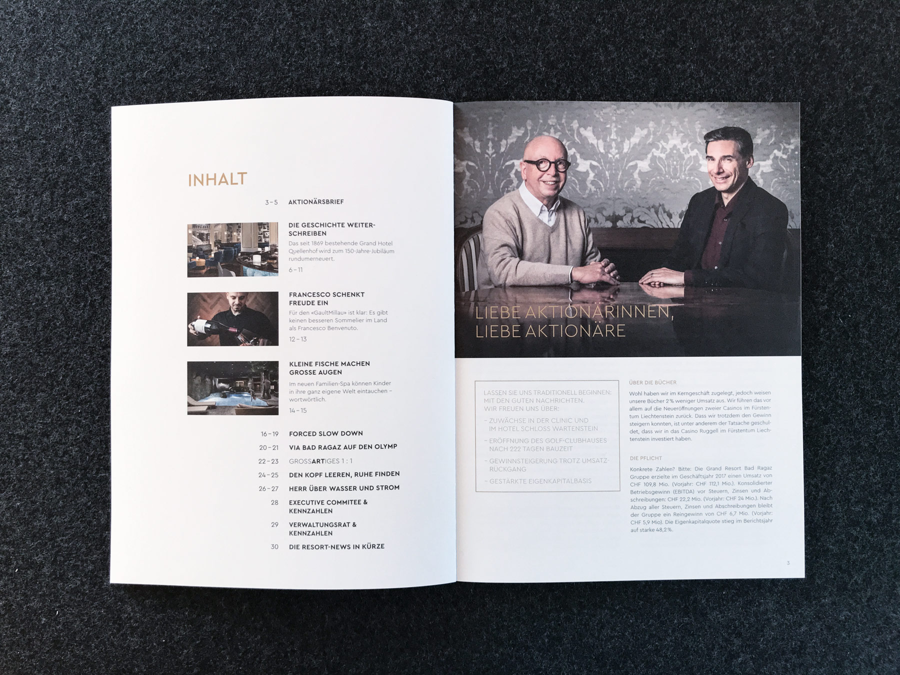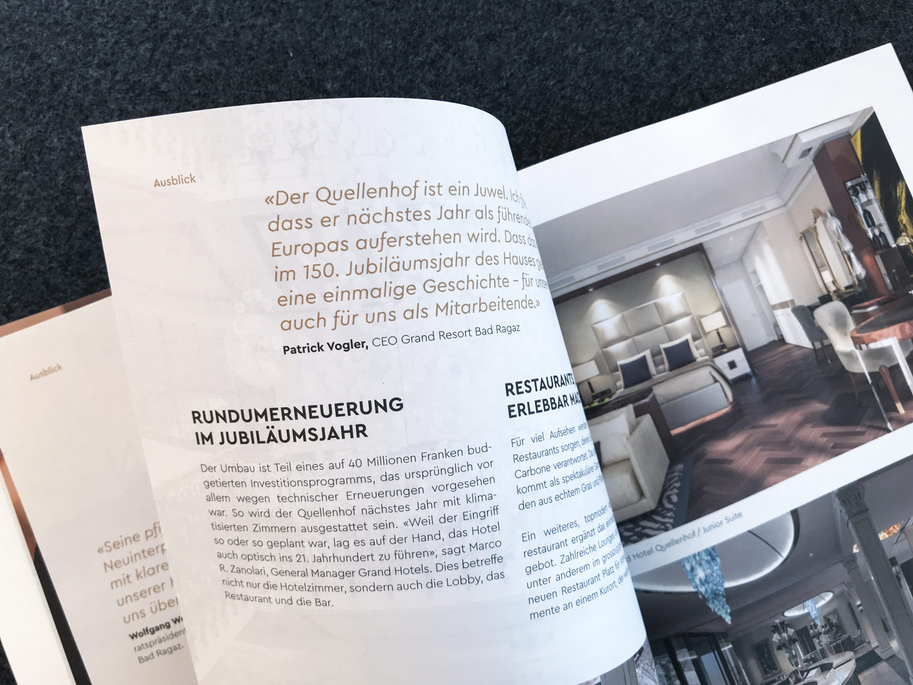 Logo, magazine and website – or, in short, the complete visual identity – of Grand Resort Bad Ragaz is designed in an elegant layout with lots of white space and based on a single typeface family: geometric Cera with fits the golden and royal blue colour scheme and luxurious and upscale brand atmosphere.