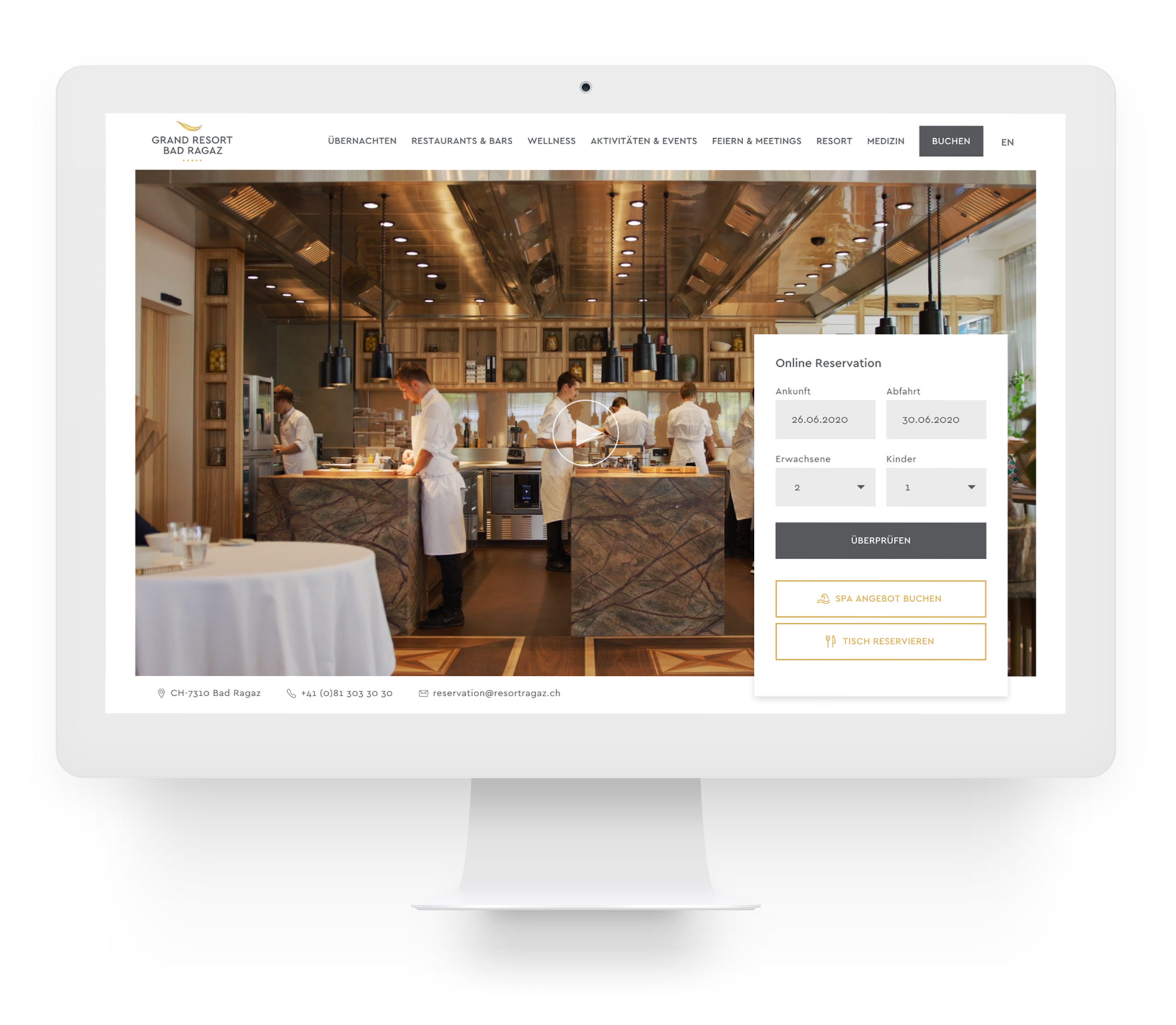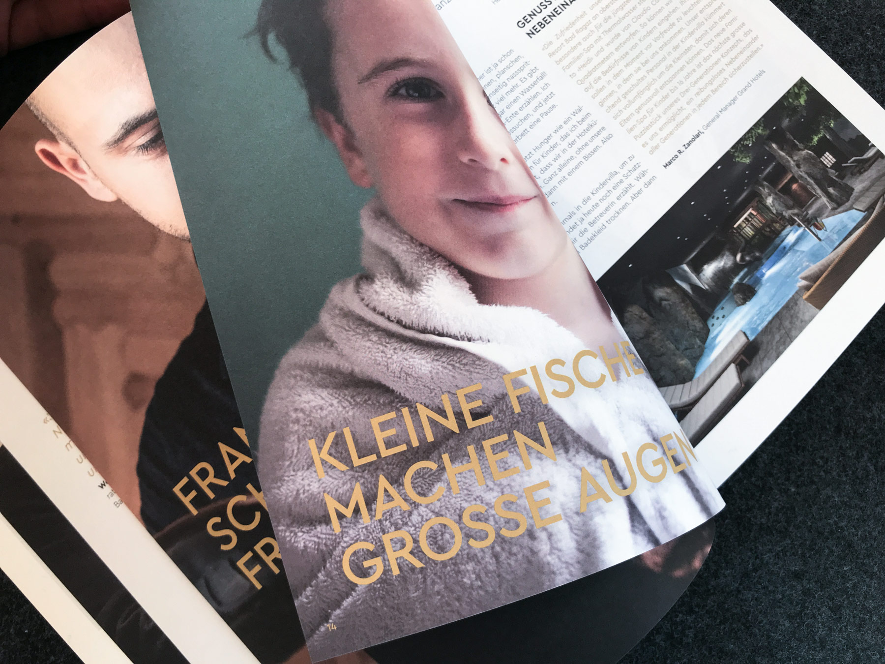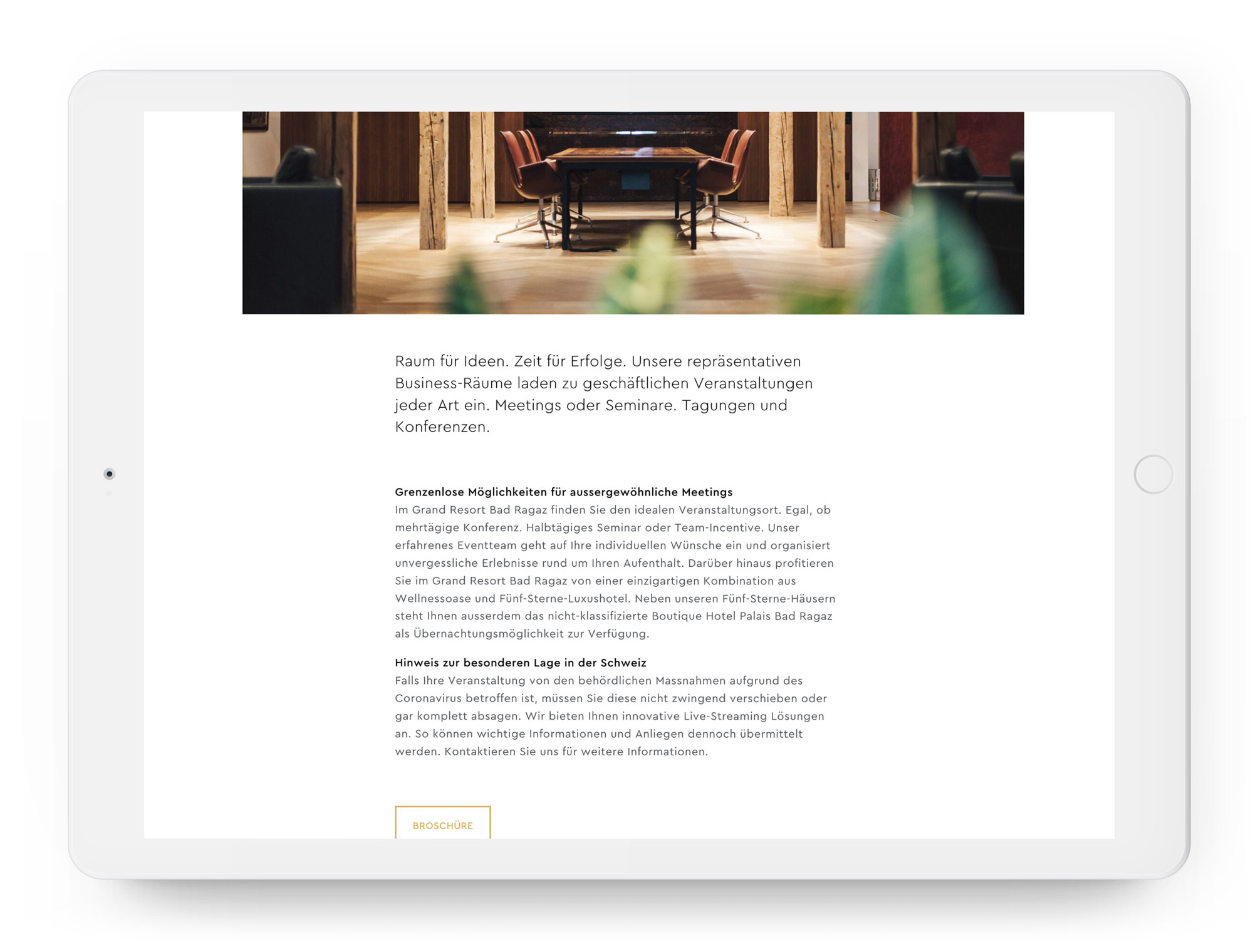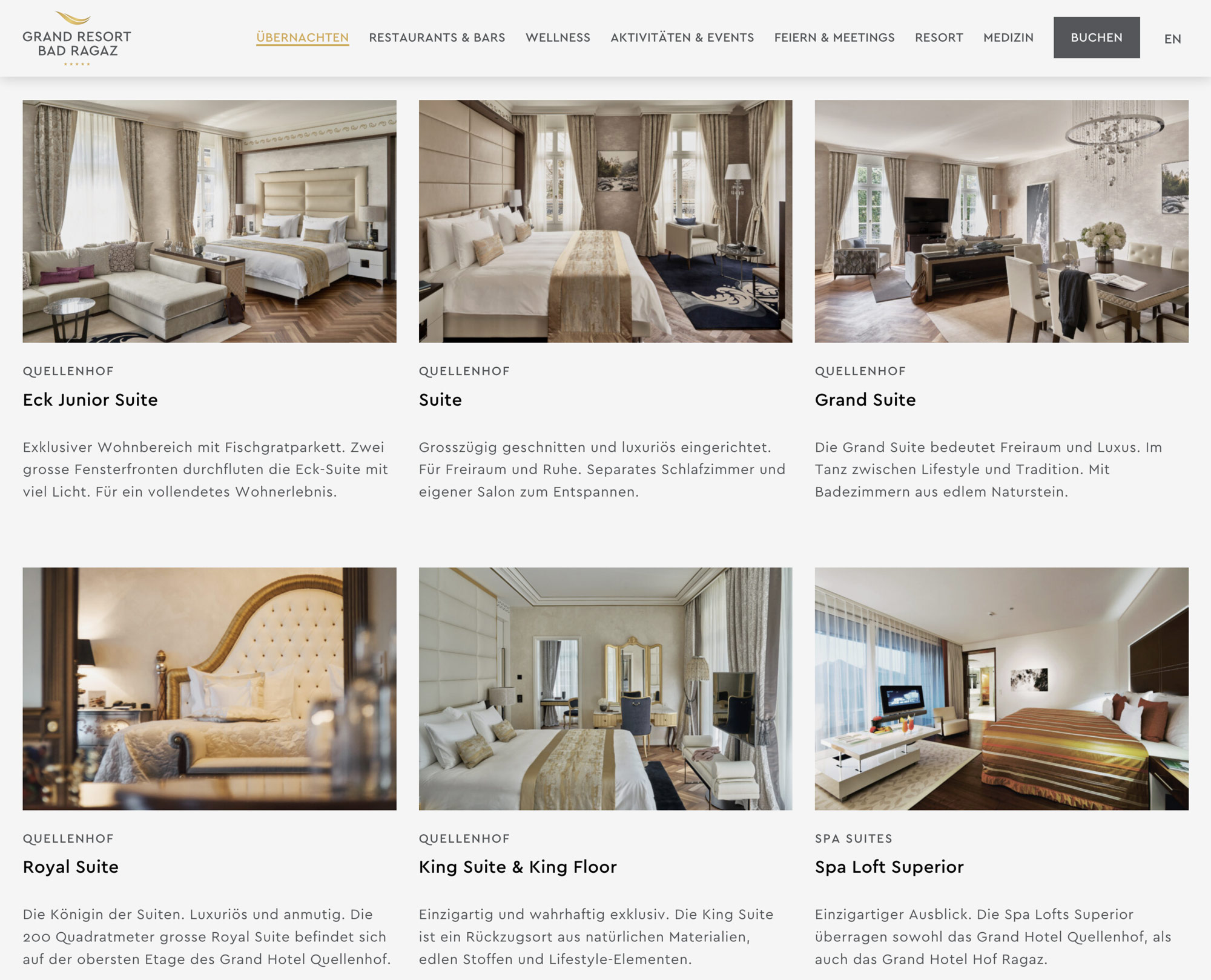 Logo, magazine and website – or, in short, the complete visual identity – of Grand Resort Bad Ragaz is designed in an elegant layout with lots of white space and based on a single typeface family: geometric Cera with fits the golden and royal blue colour scheme and luxurious and upscale brand atmosphere.