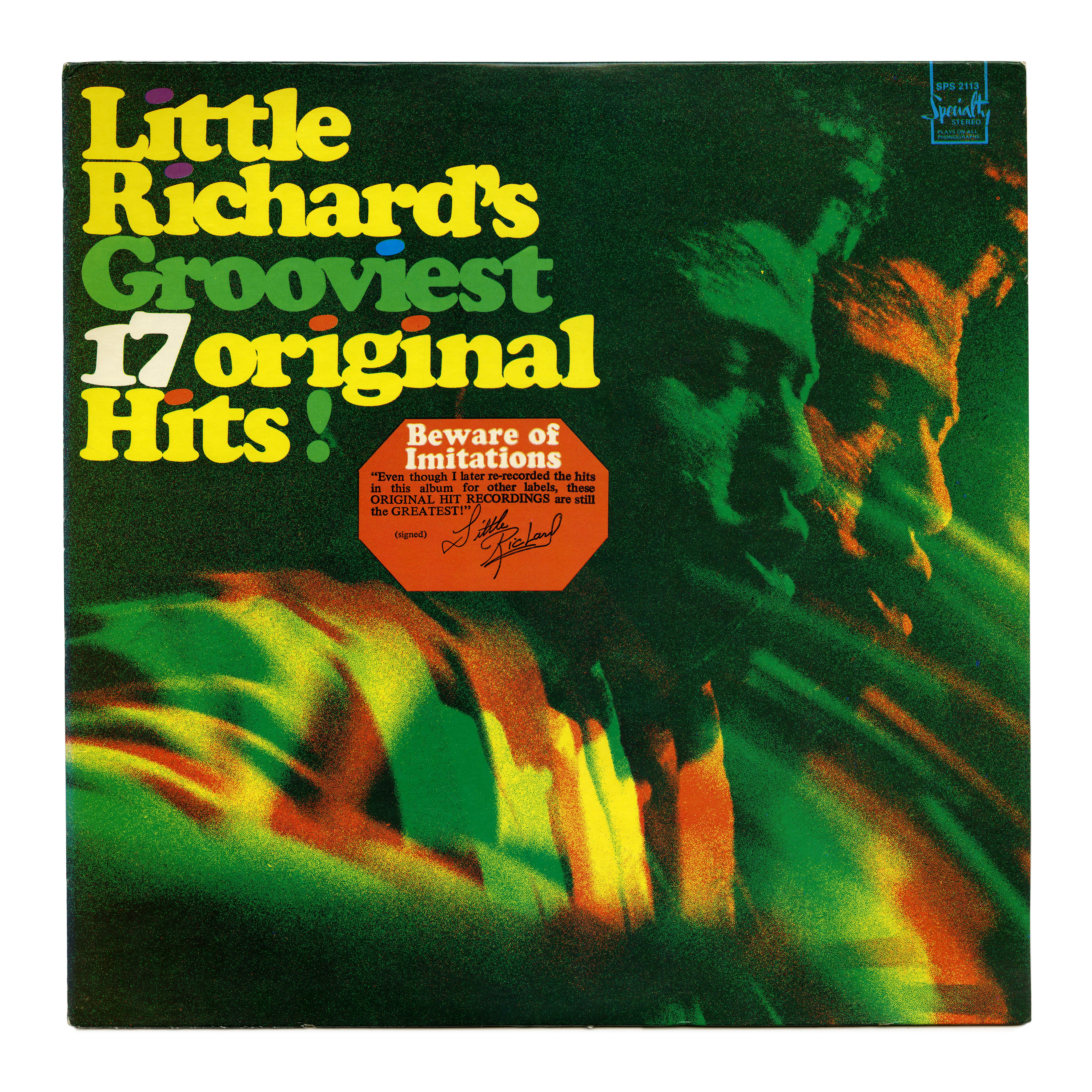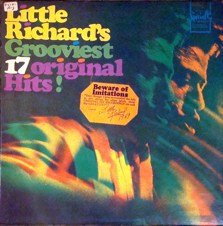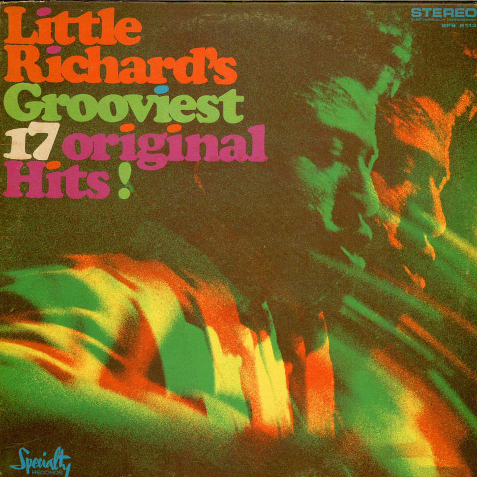 Little Richard’s Grooviest 17 Original Hits! is a compilation album released by Specialty Records in 1968. The jacket design by Burt Andersen comes in a number of color variants, three of which are shown here. The tightly spaced Cooper Black is livened up by tittles in another color. As the numerals in this typeface are non-ligning, the 7 had to be moved up to prevent a crash with the line below.