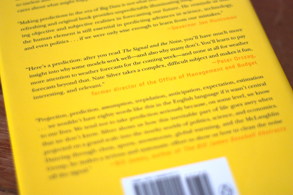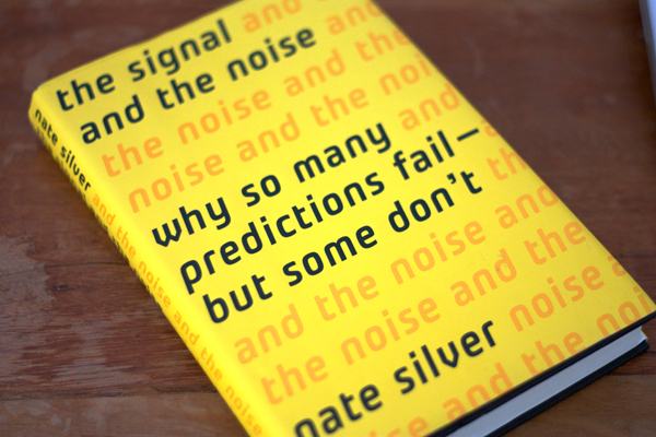 The concept and signal vs. noise is solved through the use of print production techniques, in this case embossing for the main title (signal) and the use of a slightly darker than background yellow for the noise.