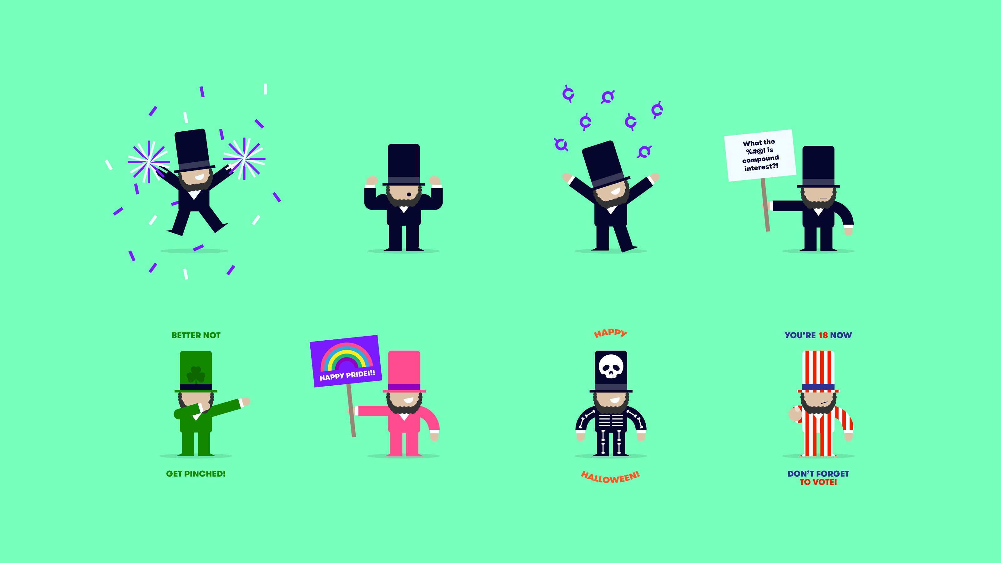Our solution: welcome to the new hustle. The road to banking and financial literacy is a long and thorny one, so we created an integrated identity based on the foundation of The New Hustle — the path to financial freedom being rooted in a solid education. Guiding you through this fiscal expedition is Abe. He is the living, breathing embodiment of Copper. He exists to take users along for the ride, teaching them about compound interest and repayment plans. Abe is here to show you how to be a #CopperBoss.