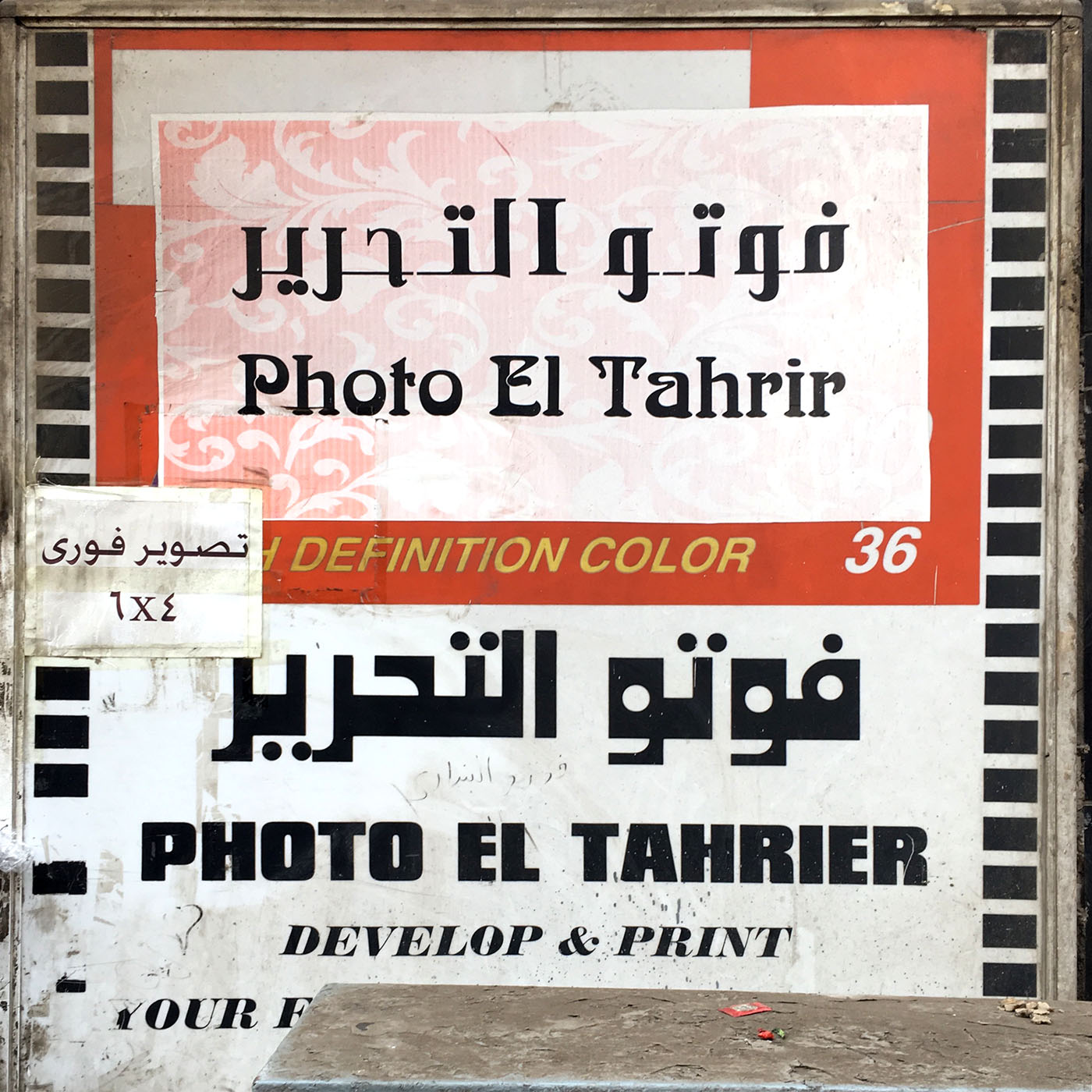 Arnold Böcklin’s Arabic counterpart, an interesting if not terribly successful attempt to adapt Latin letterforms (possibly inspired by Arlette Boutros' Boutros Jawaher), is اليكس. I believe “تصوير فورى” (instant photography[?]) is set in Advertising Medium and “(HIG)H DEFINITION COLOR” in faux-italic Helvetica.