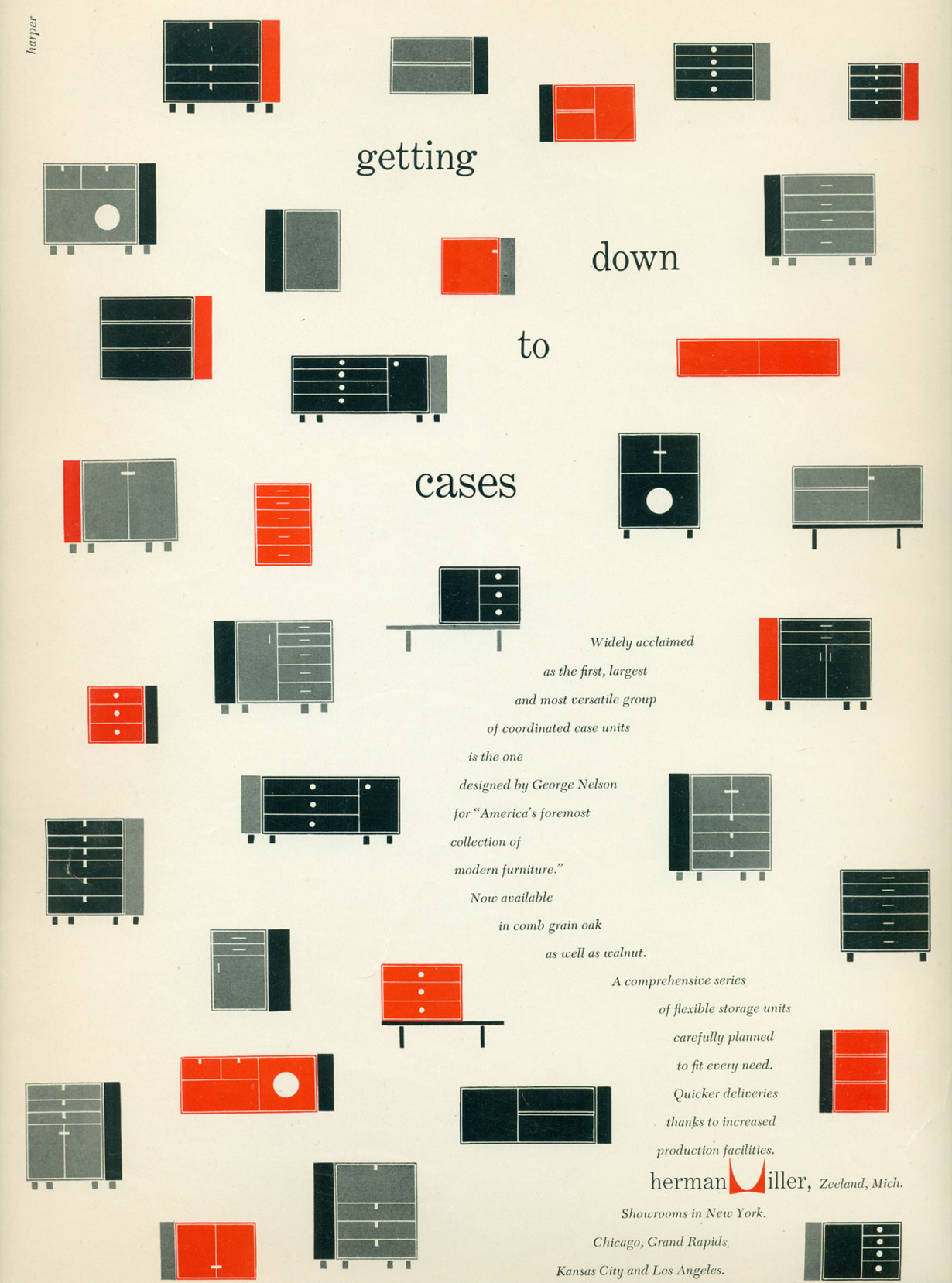 Herman Miller Ad: Getting Down to Cases Contributed by Stephen Coles on Jan 24th, 2013. Artwork published in 1952. Source: www.hermanmiller.com License: All Rights Reserved. Typefaces More about Century ExpandedGet Century ExpandedMore about CaledoniaGet Caledonia Formats Advertising (2147) Topics Home/Interior (840) Designers/Agencies Herman Miller (4) Irving Harper (5) Tagged withHerman Miller (15)furniture (229)mid-century modern (86)George Nelson (7) In SetsMidcentury Modern (Roque Strew) (7)Mid-century Modern Furniture & Architecture (Stephen Coles) (45)serif (Reshid Bey) (4)warm modernism (Stephen Coles) (6)Grey in Use (Encelado) (172)Kool Thing (Encelado) (78) Post a comment Name Email – will not be published Website Your response Submit Comment More Century Expanded in use Industrial Design Magazine (1968–70)1968Massimo VignelliContributed by Stephen Coles Staff Pick Teddy Wilson – And Then They Wrote… album art1960unknownContributed by Bryson Stohr Jim Fassett – Strange to your Ears: The Fabulous World of Sound with Jim Fassett album art1955unknownContributed by Bryson Stohr Staff Pick Sponsor More in Home/Interior Zardoz e Agulha 2018 Calendar2018José MendesJosé BrandãoM2-Artes GráficasContributed by R-Typography Coco Flipc. 2020JAC&Contributed by Jacinta Lippold DIY light up headboard2012Elsie + EmmaContributed by Nick Sherman Staff Pick Mediteranski San website2024Davor G. ZelicContributed by Alex Slobzheninov More in Advertising “You bring in the digital … we’ll bring out the fun!” Fujifilm adc. 2004FujifilmContributed by Mark Stanczyk Sony consumer electronics ads (1965)1965Photo(s) by Bart Solenthaler on Flickr. Speedo logo and magazine ad (1990s)c. 1996unknownContributed by Andrew Lohin Redrow 2021 brand refresh2021AbsoluteContributed by Absolute More Fonts In Use Eddie Chacon – Sundown album art and singles2023Justin SloaneContributed by Florian Hardwig Staff Pick Avant Garde magazine #131971Herb LubalinContributed by Jan Middendorp Staff Pick Odéon, Théâtre de l’Europe2025Atelier Choque Le GoffContributed by Formagari Staff Pick Logan Village to Yarrabilba Rail Trailc. 2022DotdashDespina MacrisDomenic NastasiContributed by Despina Macris Staff Pick
