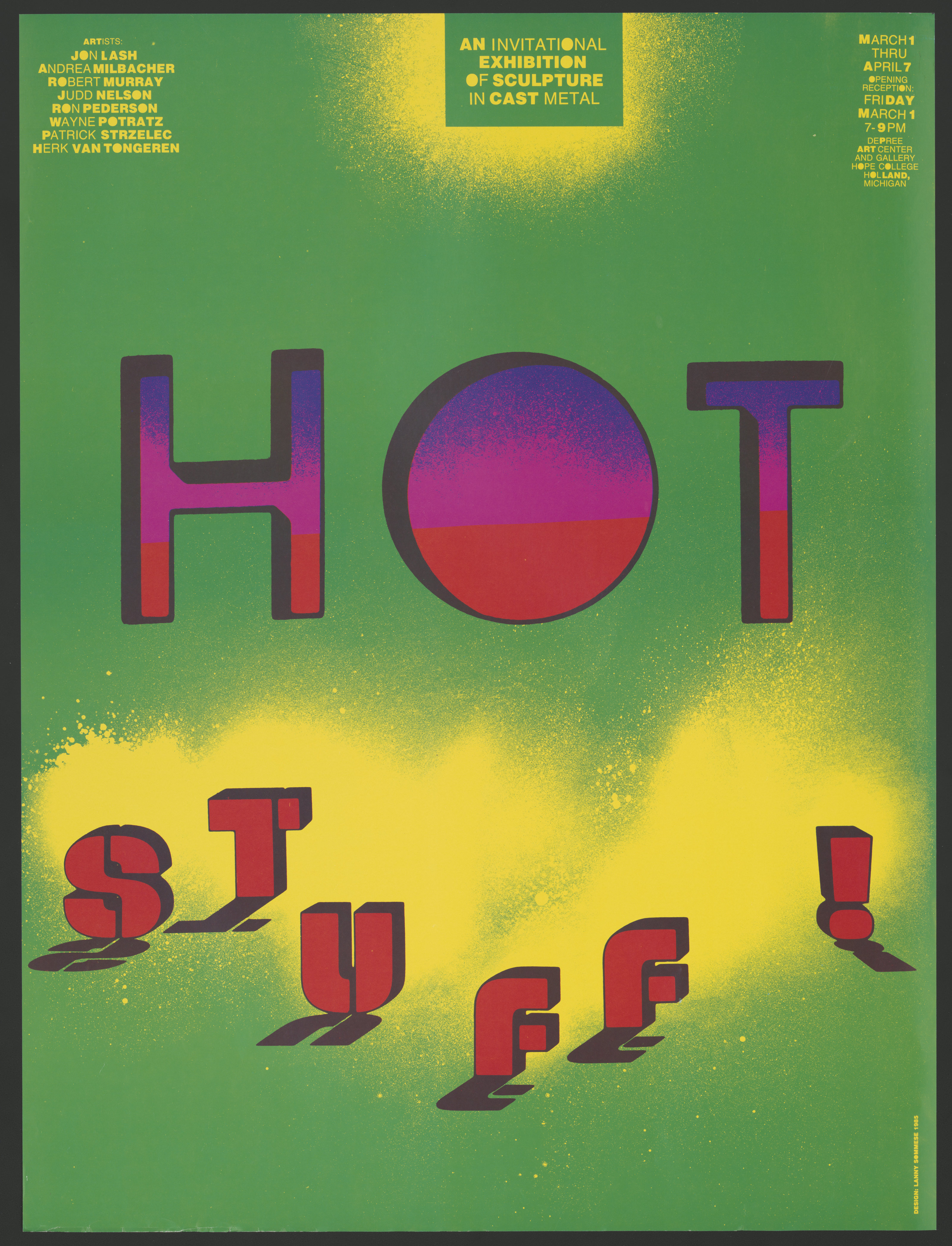 A colorful 3-D / stencil themed poster from 1985 for “an invitational exhibition of sculpture in cast metal” at Hope College’s Depree Art Center and Gallery in Holland, Michigan.