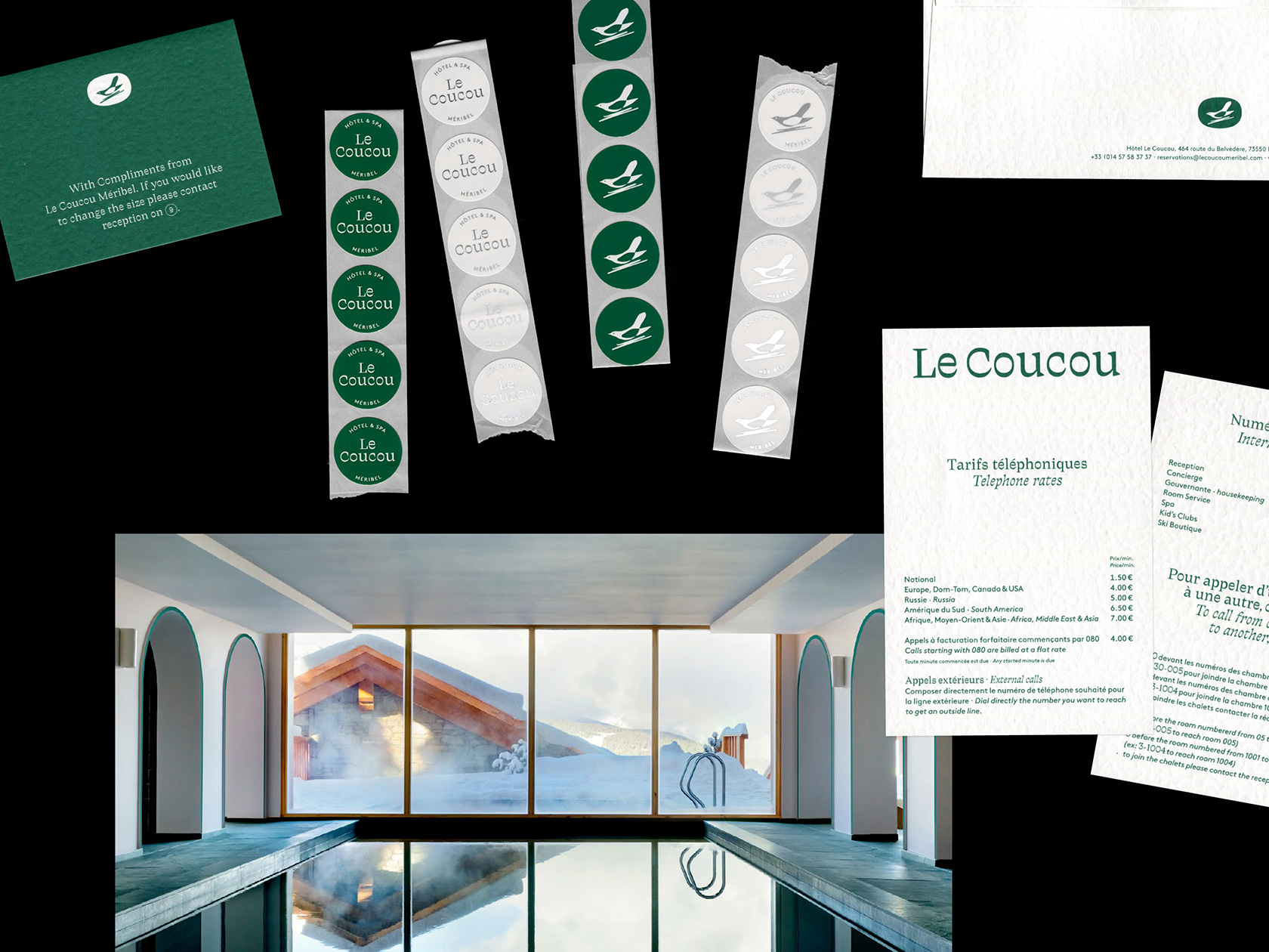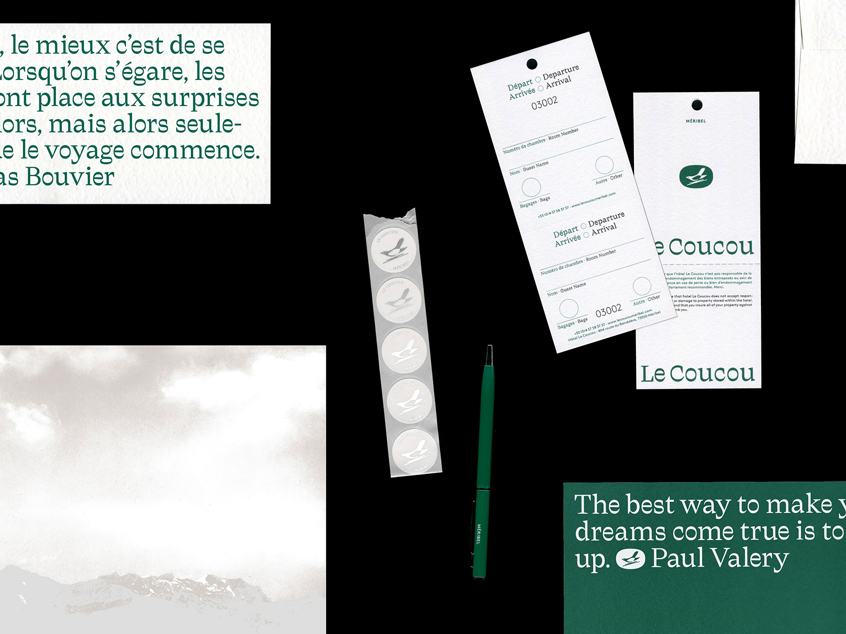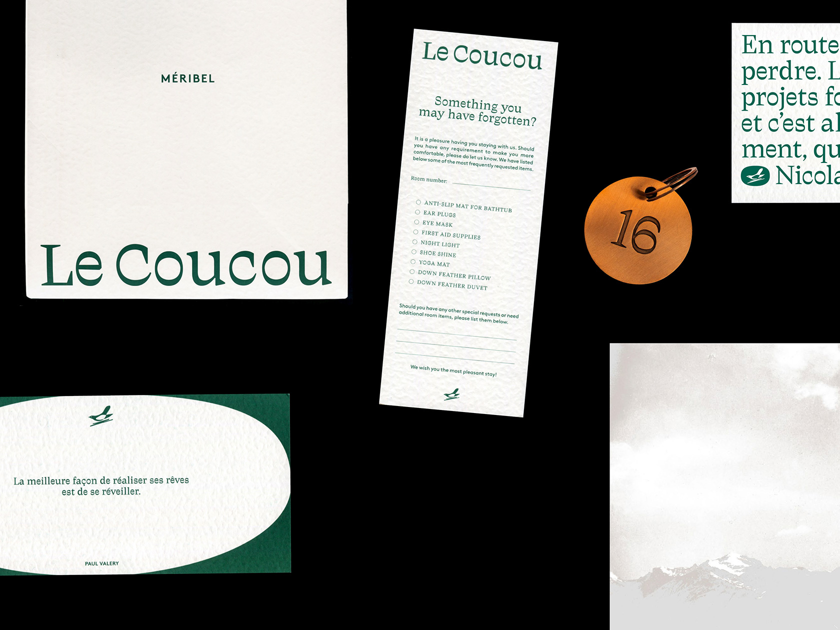 Le Coucou is a five stars hotel in Méribel, France, with interior design by Pierre Yovanovitch. The visual identity was designed by GeneralPublic, using Traulha Jornau and Italica, plus its sans-serif companion Traulha Lineara.