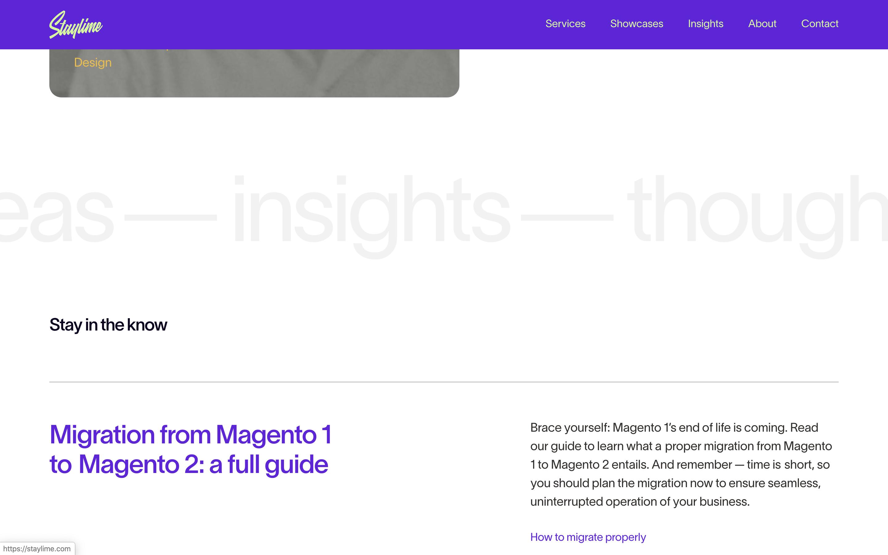 Staylime website and logo Contributed by WELTKERN® Typefaces on Apr 17th, 2020. Artwork published in 2020. Source: staylime.com Staylime. License: All Rights Reserved. Staylime, a web agency based in Redwood City (USA), designed their website set in Lausanne 300 + 500. The logo is based on Mettars. Source: staylime.com Staylime. License: All Rights Reserved. Source: staylime.com Staylime. License: All Rights Reserved. Source: staylime.com Staylime. License: All Rights Reserved. Source: staylime.com Staylime. License: All Rights Reserved. Source: staylime.com Staylime. License: All Rights Reserved. Source: staylime.com Staylime. License: All Rights Reserved. Typefaces More about TWK LausanneGet TWK LausanneMore about MettarsGet Mettars Formats Web (5513) Branding/Identity (8281) Topics Services (1523) Designers/Agencies Staylime (1) Tagged withwebsites (3468)web agencies (1)web development (79)colored body text (891)one typeface family (1651)multiple weights (410)logos (4884)modified typeface (1716)italic/script on an angle (378)illustration (1544) Artwork location United States (9754) Redwood City (3) In SetsModern (Sarah Brown) (14) Post a comment Name Email – will not be published Website Your response Submit Comment More TWK Lausanne in use Retirable®2020Studio ScowenContributed by WELTKERN® Typefaces KUNST.EE magazinec. 2019Margus TammContributed by Margus Tamm East-West/West-East thesis projectc. 2020Yi MaoContributed by Yi Mao Staff Pick Sponsor More in Services Städte-Reklame ad (1934)1934Gebr. KlingsporContributed by Florian Hardwig Matt Voyce websitec. 2025Uncommon StudioContributed by F37® Jonas Arleth personal branding2021Jonas ArlethContributed by Ivo Gabrowitsch Mat i Sverige stamps series2016Gustav MårtenssonVeronica Ballart LiljaContributed by Matthijs Sluiter More in Web safe:on2024Make StudioPaul EslageContributed by TypeMates NYUAD Research Conference 20182018Brandly WorksAbjad DesignContributed by 29LT Type Design Company Millc. 2021BleedWilliam StormdalHalvor NordrumContributed by Smuss Studio X Games2013Contributed by Webtype More Fonts In Use No Go Zone magazine2023Guillaume PaviusContributed by Guillaume P Staff Pick “Color is a state of mind”, Print magazine (1969)1969Dorothy E. HayesContributed by Florian Hardwig Staff Pick Undone website and identityc. 2015unknownContributed by Stephen Coles Staff Pick Eesti taluarhitektuur / Estonian Farm Architecture2015AKUContributed by Florian Runge Staff Pick