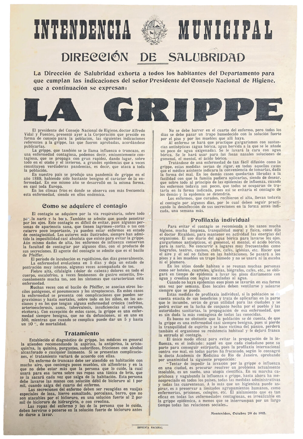 The Health Directorate urges all inhabitants of the Montevideo department of Urugay to comply with the instructions of the National Hygiene Council, to end “La Grippe”, the 1918–20 global influenza pandemic. The poster, dated October 29, 1918, was printed by “Imprenta Nacional” (the building still exists). The body text is divided in three sections: “How is contagion acquired”, “Treatment” and “Individual prevention”.