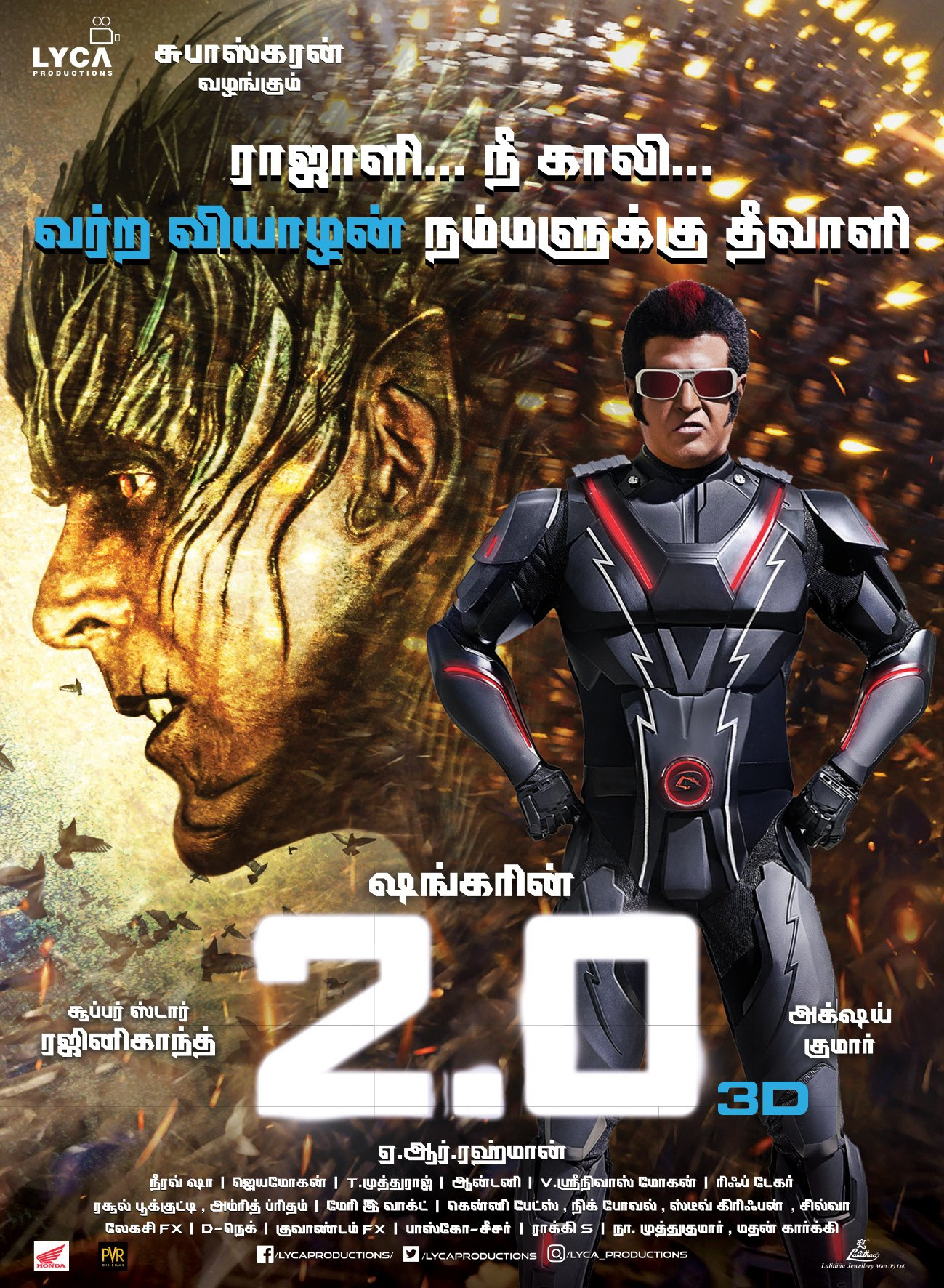 2.0 is a 2018 Indian Tamil-language science fiction action film written and directed by S.Shankar, co-written by B.Jeyamohan, and produced by Subaskaran under the banner of Lyca Productions. Its logo is based on Eslava (2014) by Graviton, with all other information set in Good Times from Typodermic.