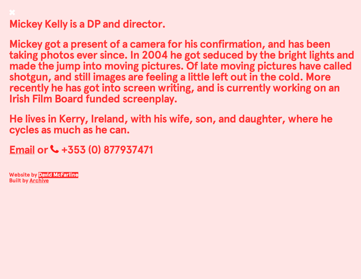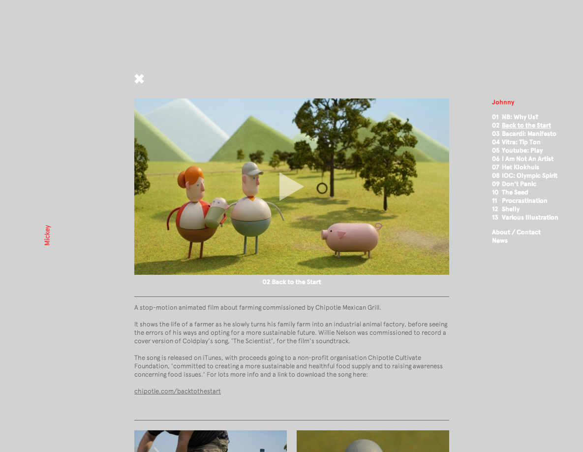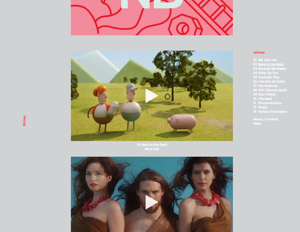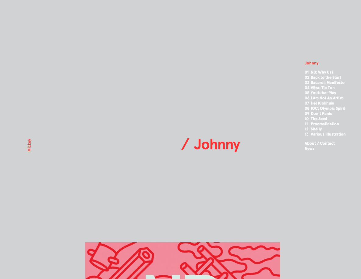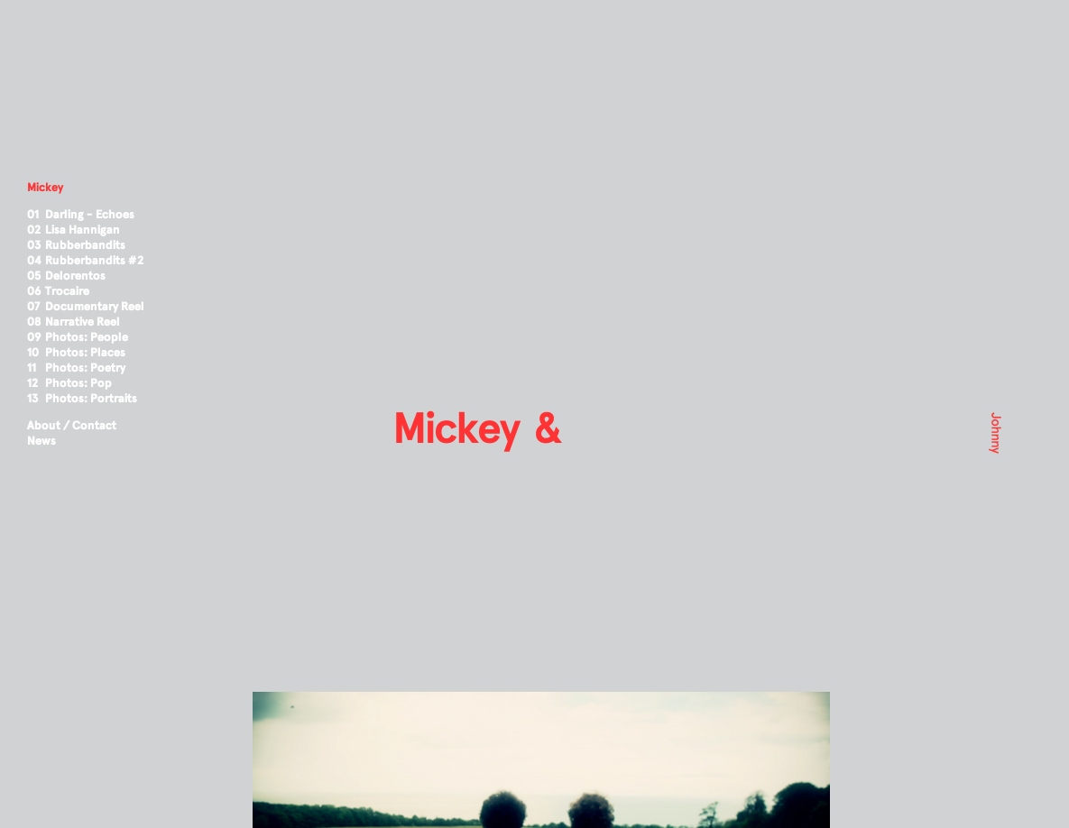Mickey & Johnny Contributed by Stephen Coles on Feb 8th, 2013. Source: mickeyandjohnny.com License: All Rights Reserved. This site is a beautifully simple showcase for the work of two directors, one specializing in live action work (Mickey Kelly) and the other in animation (Johnny Kelly). Aperçu is the sole typeface used. Source: mickeyandjohnny.com License: All Rights Reserved. Source: mickeyandjohnny.com License: All Rights Reserved. Source: mickeyandjohnny.com License: All Rights Reserved. Source: mickeyandjohnny.com License: All Rights Reserved. Source: mickeyandjohnny.com License: All Rights Reserved. Source: mickeyandjohnny.com License: All Rights Reserved. Typefaces More about AperçuGet Aperçu Formats Web (5722) Topics Services (1581) Entertainment (1561) Designers/Agencies David McFarline (1) Archive (1) Tagged withcreative services (1)director (1)animator (1)portfolios (781)webfonts (449)one typeface (1769) In Setscool (Karo Konieczna) (870) Post a comment Name Email – will not be published Website Your response Submit Comment More Aperçu in use Rise by WeMuccaContributed by Sean O'Connor Attrē Jewelryc. 2023Grafik ApartmentContributed by Rellence (prev. Ultra Kuhl) Espai Tactel Toormix2019ToormixContributed by Estela Ibarz Sponsor More in Entertainment ReSolute 18th Year Anniversary – Paris promo2025Mălin NeamțuDreamrecContributed by Mălin Neamțu Wattstax concert/album/film1972Contributed by Nick Sherman Staff Pick StarWars.com website2011Big SpaceshipContributed by Indra Kupferschmid Letterboxd website (2011–2013)2011CactuslabMatthew BuchananMike HardingContributed by Matthew Buchanan Staff Pick More in Web Martin Birrer Design2015Malvina LubecNora HeebContributed by Malvina Lubec Mindsparkle Mag2016Filip TrinerContributed by Nicole Regan The Avery Review websiteEric HuNothing in CommonContributed by ricordo VERGE2023Planthouse StudioContributed by Darden Studio More Fonts In Use Pink Floyd German concert posters (1972)1972Eri FoersterContributed by Florian Hardwig Staff Pick Viagem ao Volga by Aḥmad ibn Faḍlān2018Tereza BettinardiBruno AlgarveContributed by Tereza Bettinardi Staff Pick Perspecta 47 “Money”2014Jessica SvendsenStefan ThorsteinssonContributed by Josh Finklea Staff Pick Do It For Your Self2020Tessa ForrestContributed by Elizabeth Goodspeed Staff Pick