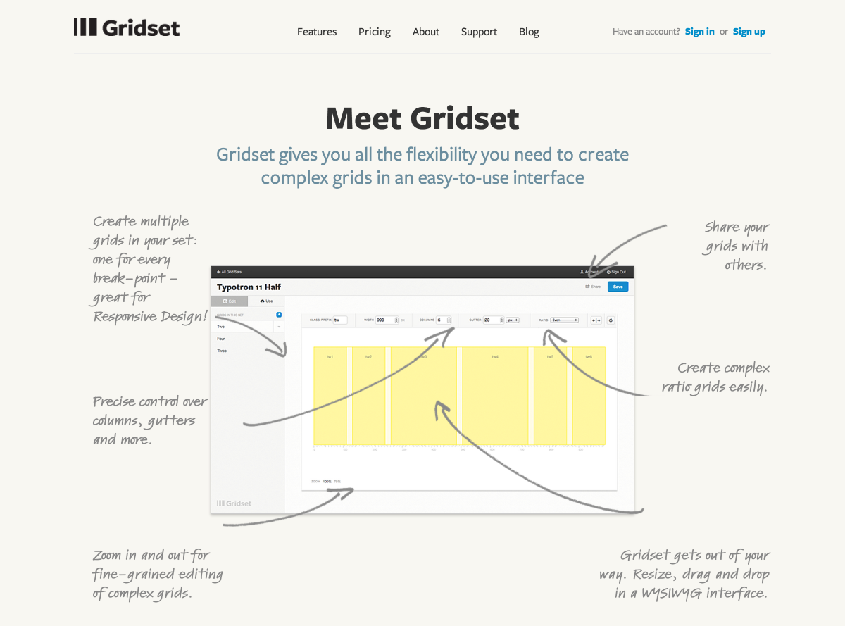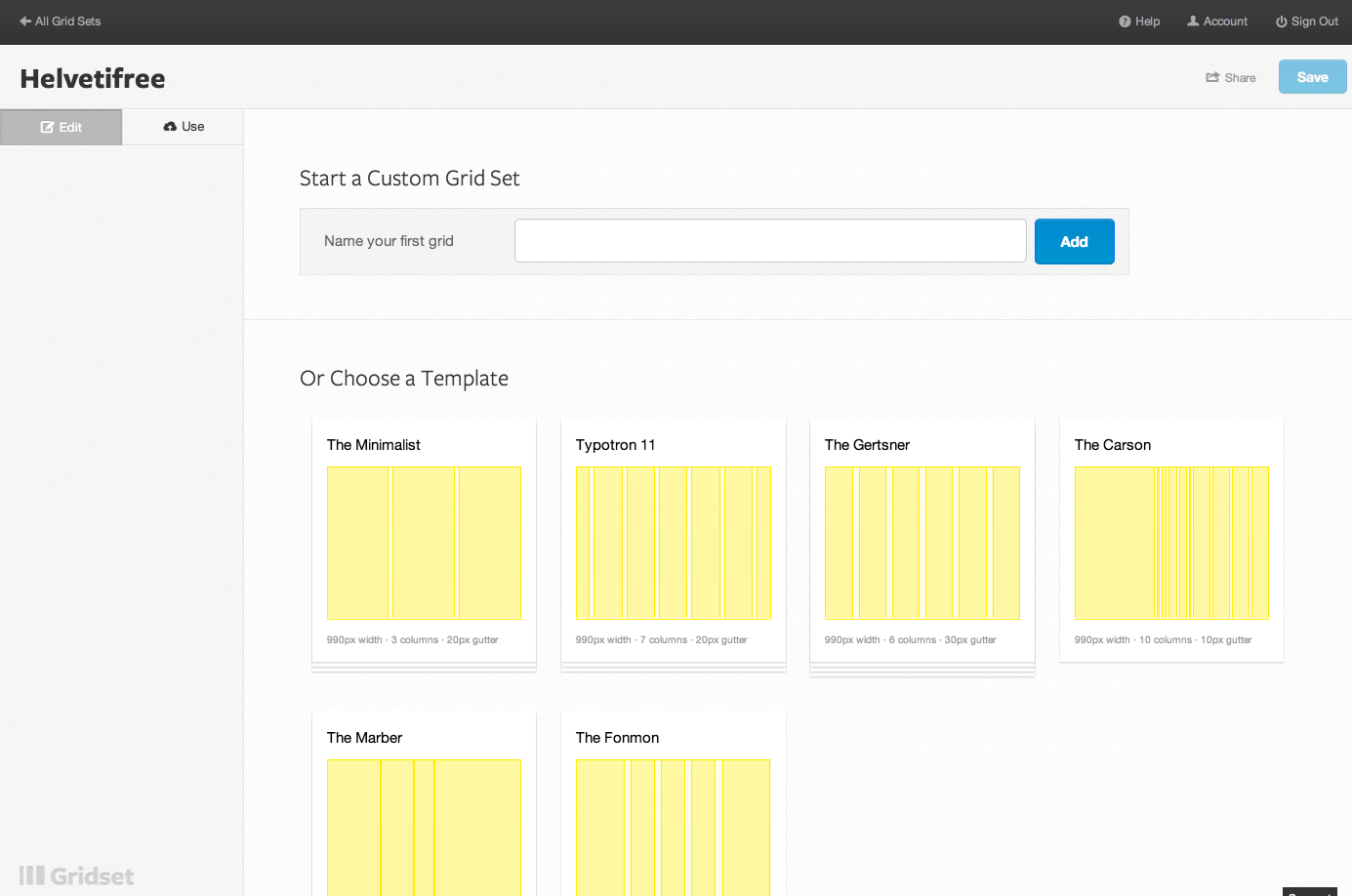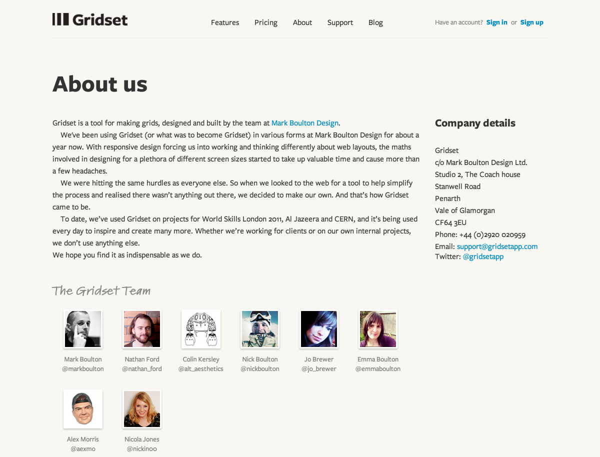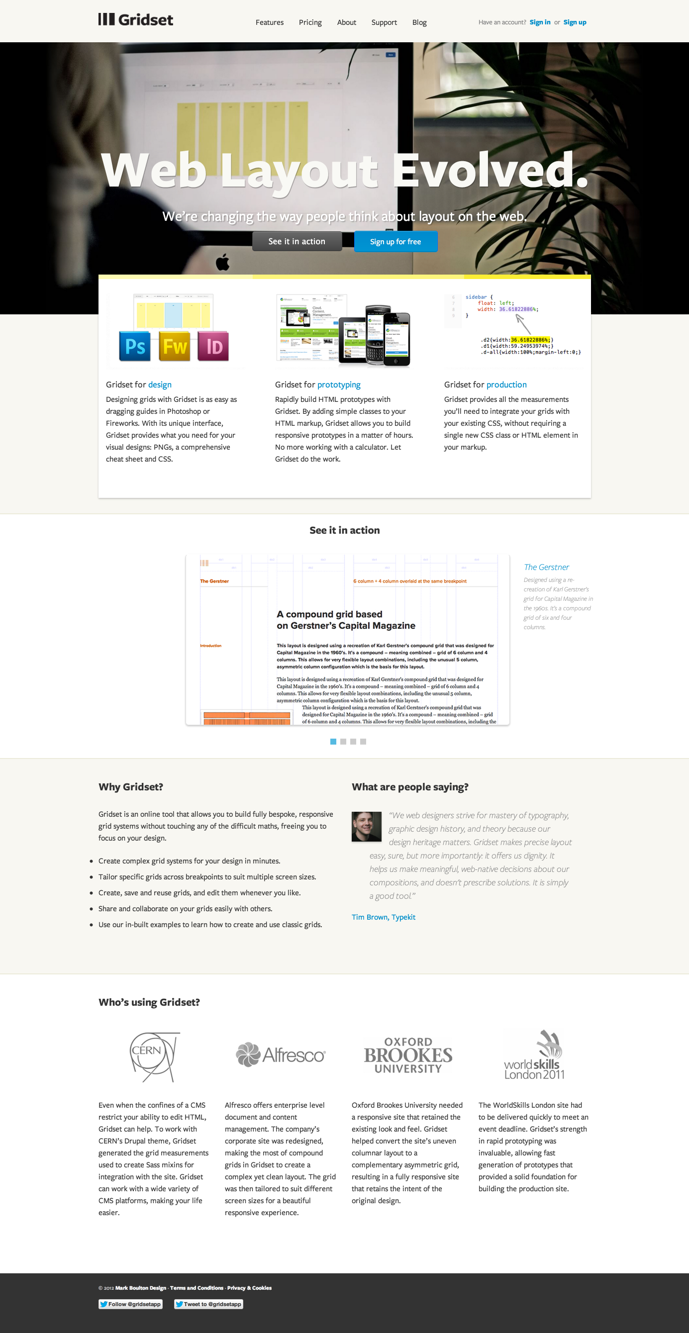 Gridset is a tool for making web design grids. The site uses Freight Sans as a webfont for everything except text under 16px or so, then goes Neue Helvetica. I would have chosen the more related and better reading Lucida Grande/Sans instead. That aside, it’s a clean and well organized site that instills confidence in the product.