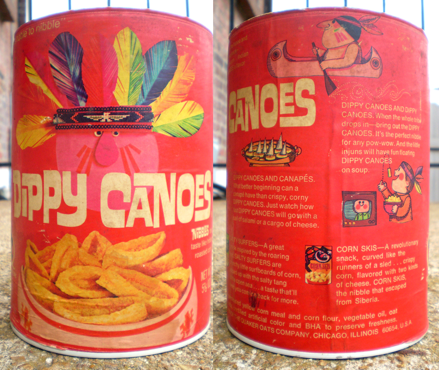 From the aisle of misfit groceries comes this racially insensitive can of extruded corn in the shape of canoes, otherwise known as “Dippy Canoes”.