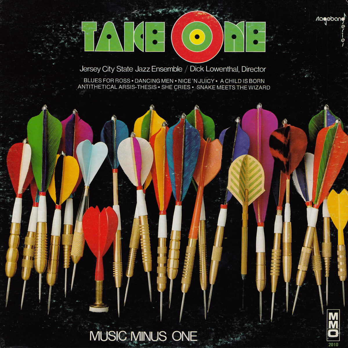 Take One is an album with big-band jazz recorded by the Jersey City State Jazz Ensemble, directed by Dick Lowenthal. It was issued in 1975 by Music Minus One, an educational label specializing in “play-along albums intended to accompany a melodic instrument (or vocalist) as an aid for practicing.” Shown above is the standard release with green display type. The Drummer version shown below has purple type. There are versions for Tenor Sax (pink), Pianist (orange), Trumpet, and Bassist.