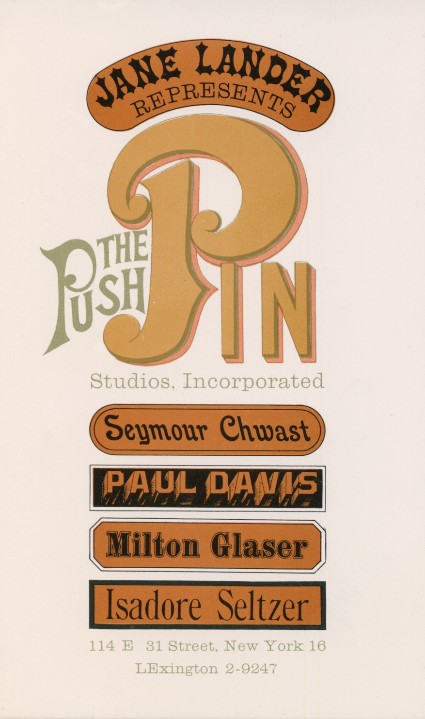 An undated business card for Jane Lander, who was a representative for Push Pin Studios between 1960 and 1967.