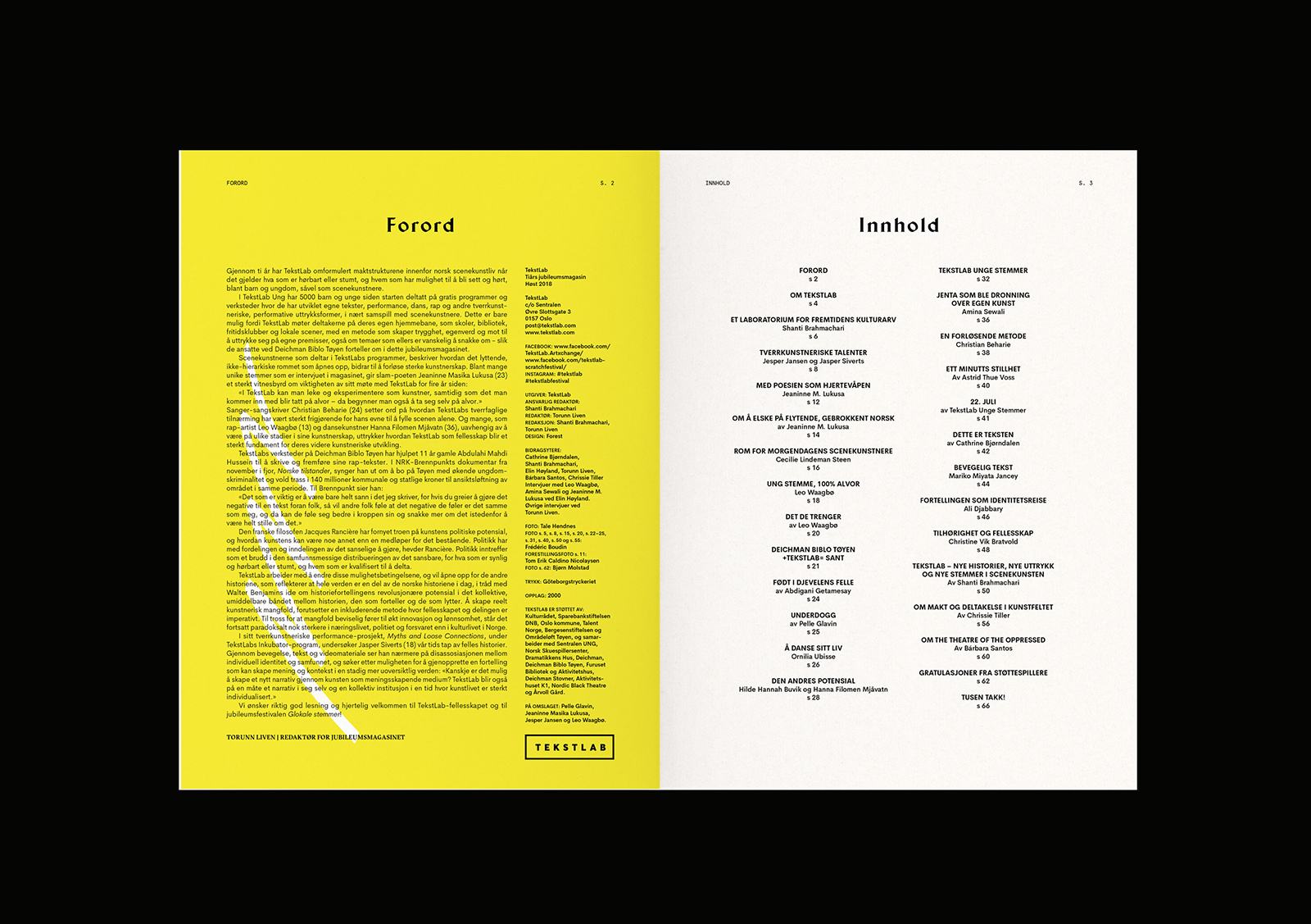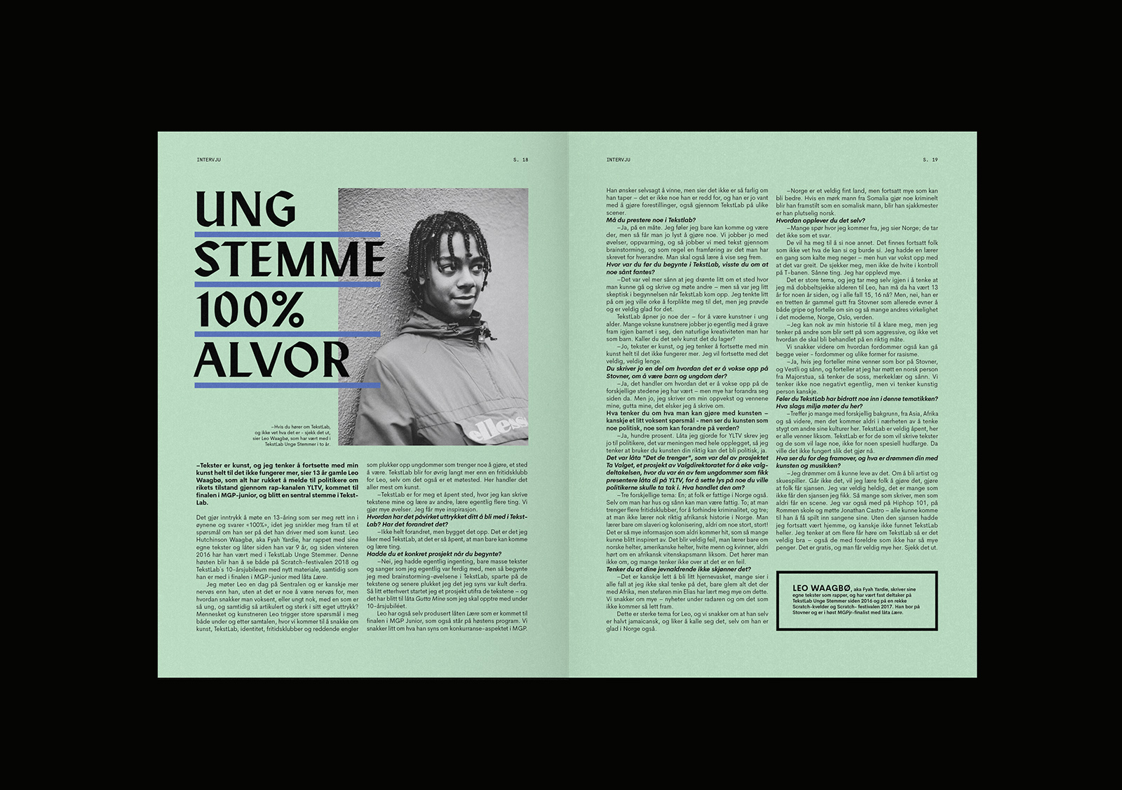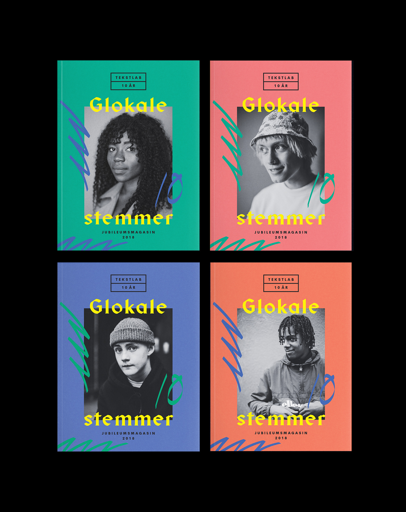 For TekstLab’s tenth anniversary (2018), design studio Forest provided a design for a festival – Glokale Stemmer (“glocal voices”) – and the anniversary magazine (pdf) with four different covers. The magazine layout uses Form (Bizarre Bizarre) for headlines. The anniversary logo and the body text are set in Cerebri Sans, with Bluu Next for pull quotes and secondary headings, and Aperçu Mono for page numbers and running titles. The opening of the festival took place at Sentralen in Oslo.