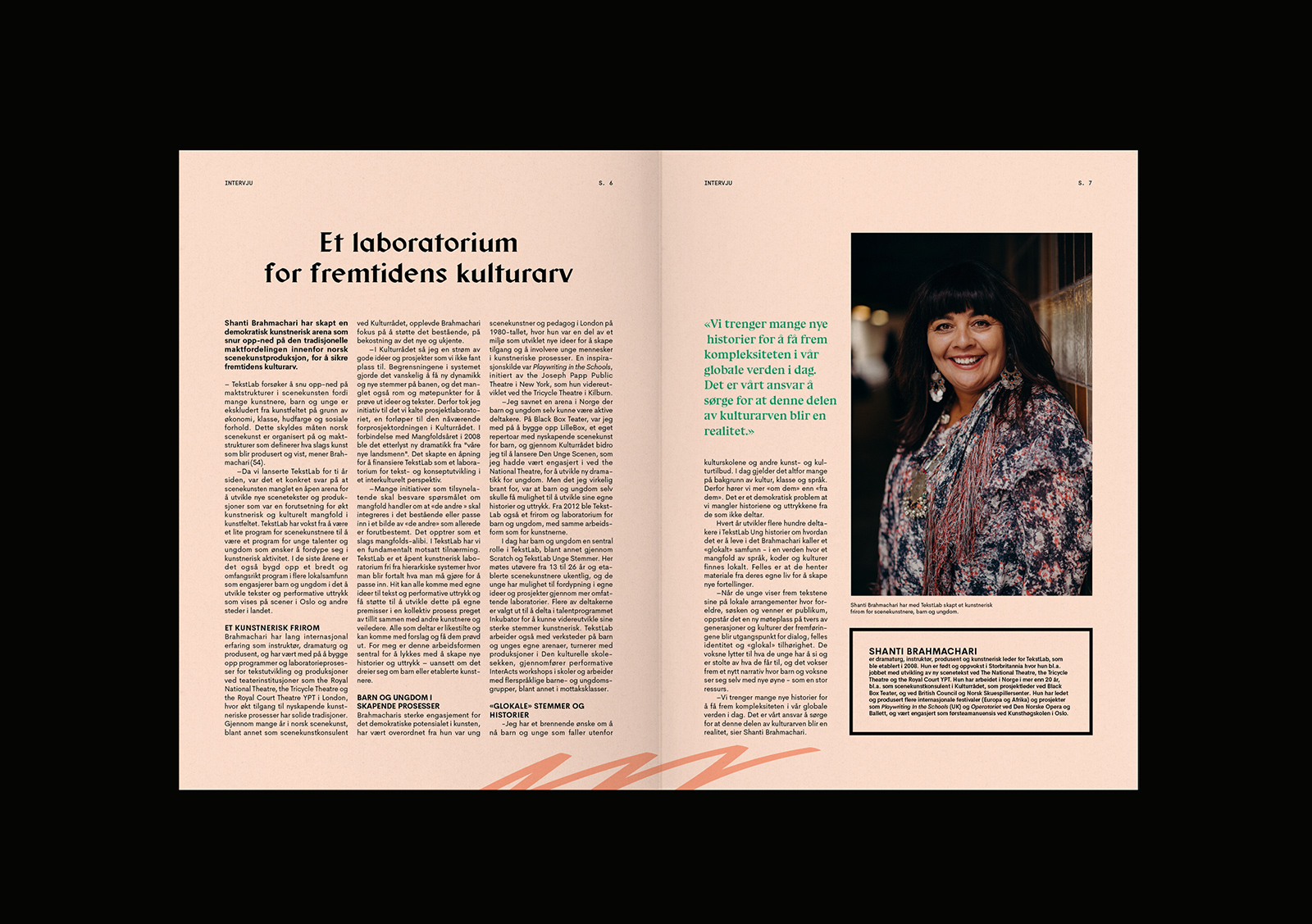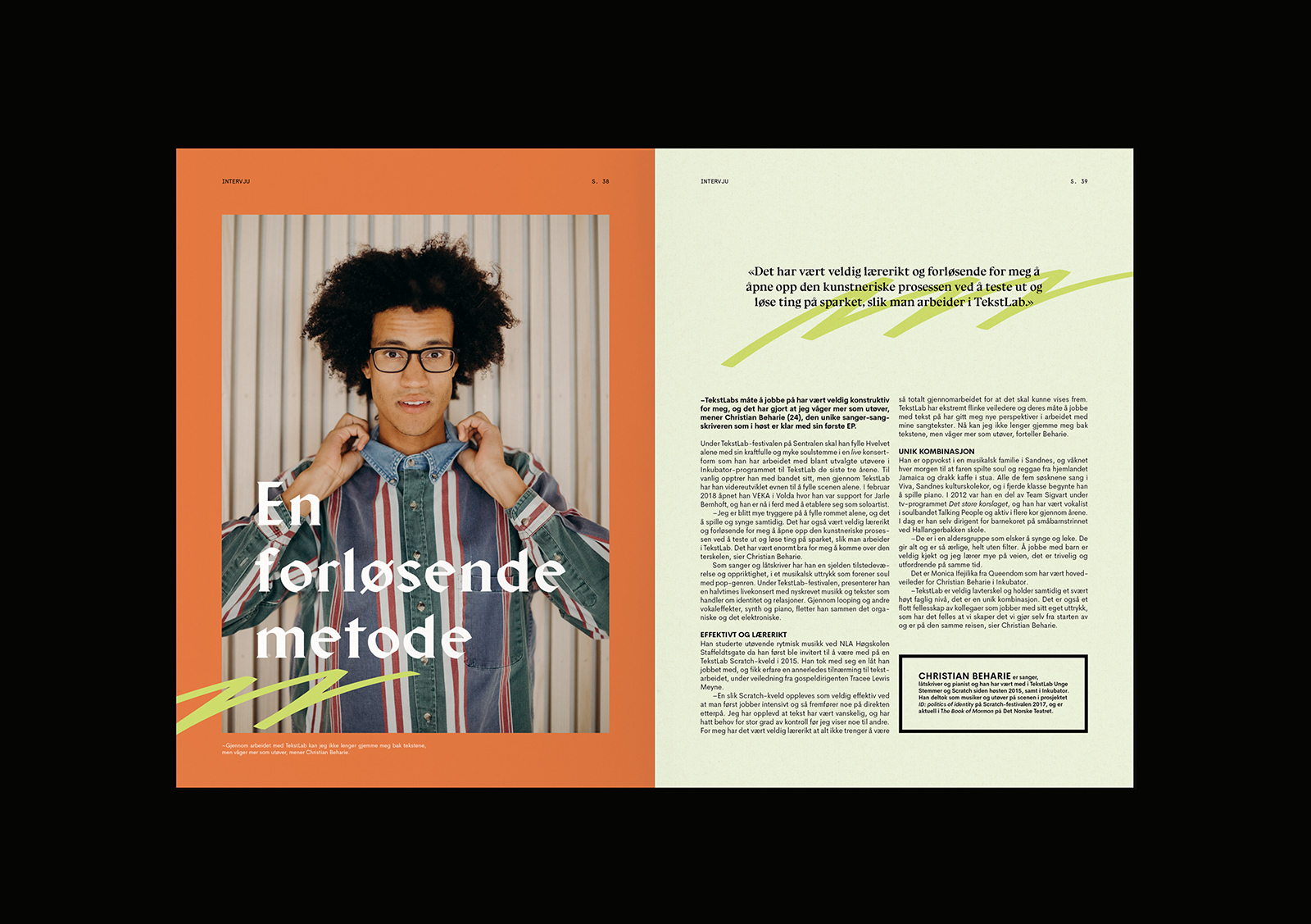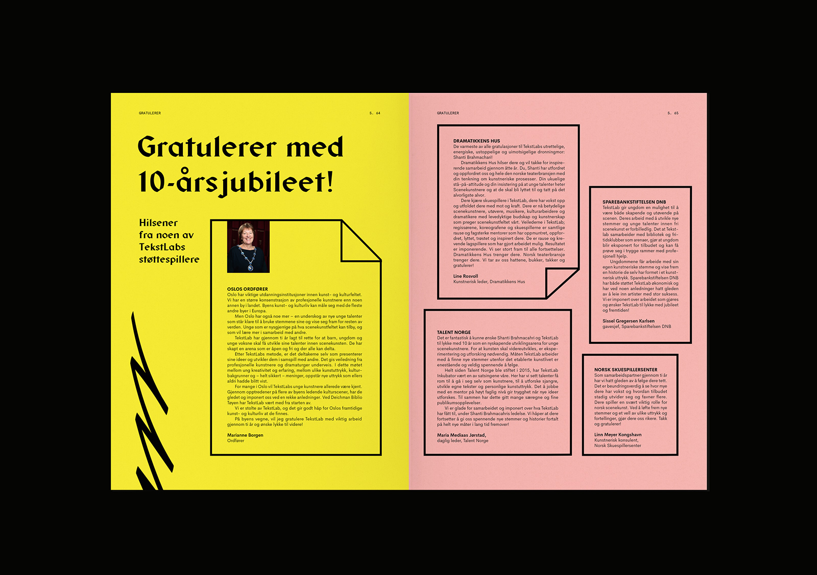 For TekstLab’s tenth anniversary (2018), design studio Forest provided a design for a festival – Glokale Stemmer (“glocal voices”) – and the anniversary magazine (pdf) with four different covers. The magazine layout uses Form (Bizarre Bizarre) for headlines. The anniversary logo and the body text are set in Cerebri Sans, with Bluu Next for pull quotes and secondary headings, and Aperçu Mono for page numbers and running titles. The opening of the festival took place at Sentralen in Oslo.